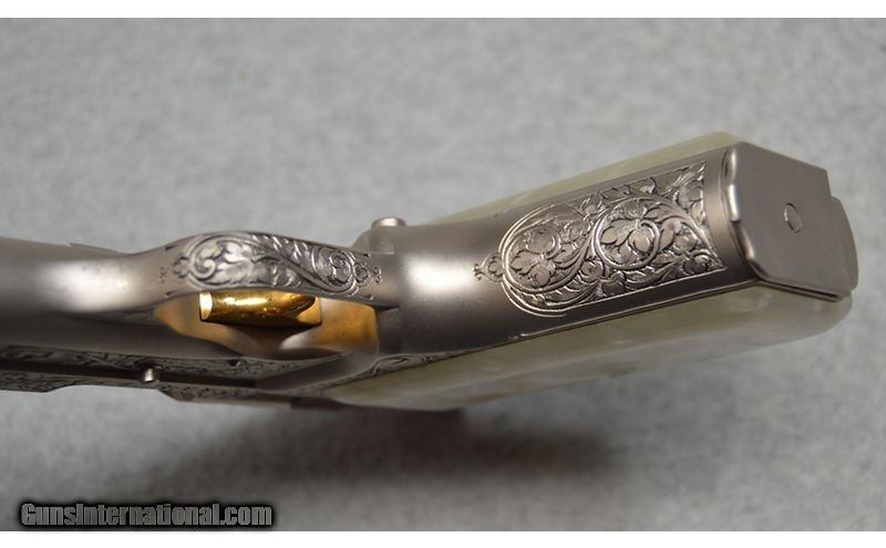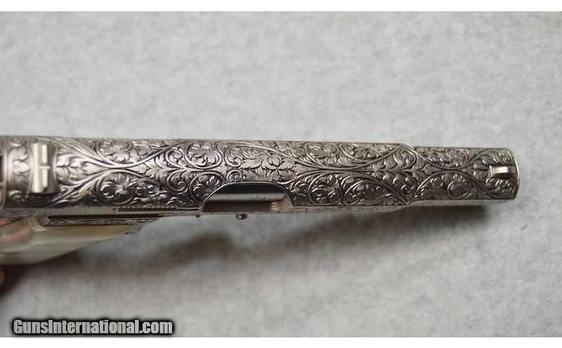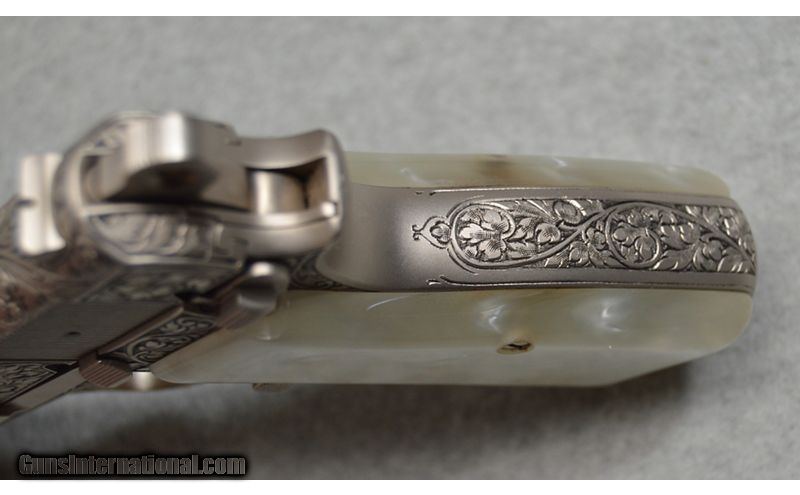 Description: Browning Hi-Power Renaissance pistol in excellent condition. Made in 1969, this pistol features deep floral engraving with 80% coverage, imitation pearl grips, and original 15 round magazine. Only minor handling marks with little signs of use. SN: 69C25564 9mm Luger SOLD Curio/Relic: Yes Metal Condition: Excellent Wood Condition: Excellent Bore Condition: "Clean, Good Rifling Barrels: 4 3/4 Butt Pad: Imitation Pearl Grips Weight: 2 lb 1 oz Item Location: Fort Worth, TX |