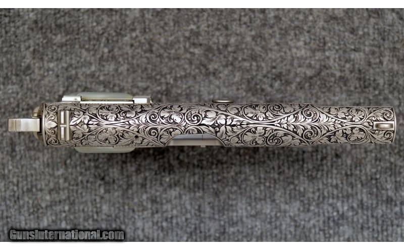 Description: For your consideration, a Browning Hi-Power chambered in 9x19. With its satin nickel finish and deeply-incised, scroll hand engraving, the Renaissance grade is the en plus ultra of the Hi-Power. Adding to the desirability of this example, this is a T-series dating to 1968. 9mm Luger SOLD Metal Condition: Excellent Wood Condition: Excellent Bore Condition: Excellent Barrels: 4.5 Triggers: Gilded Weight: 2.25 lbs Sights: Iron Sights Item Location: Hamburg, PA |