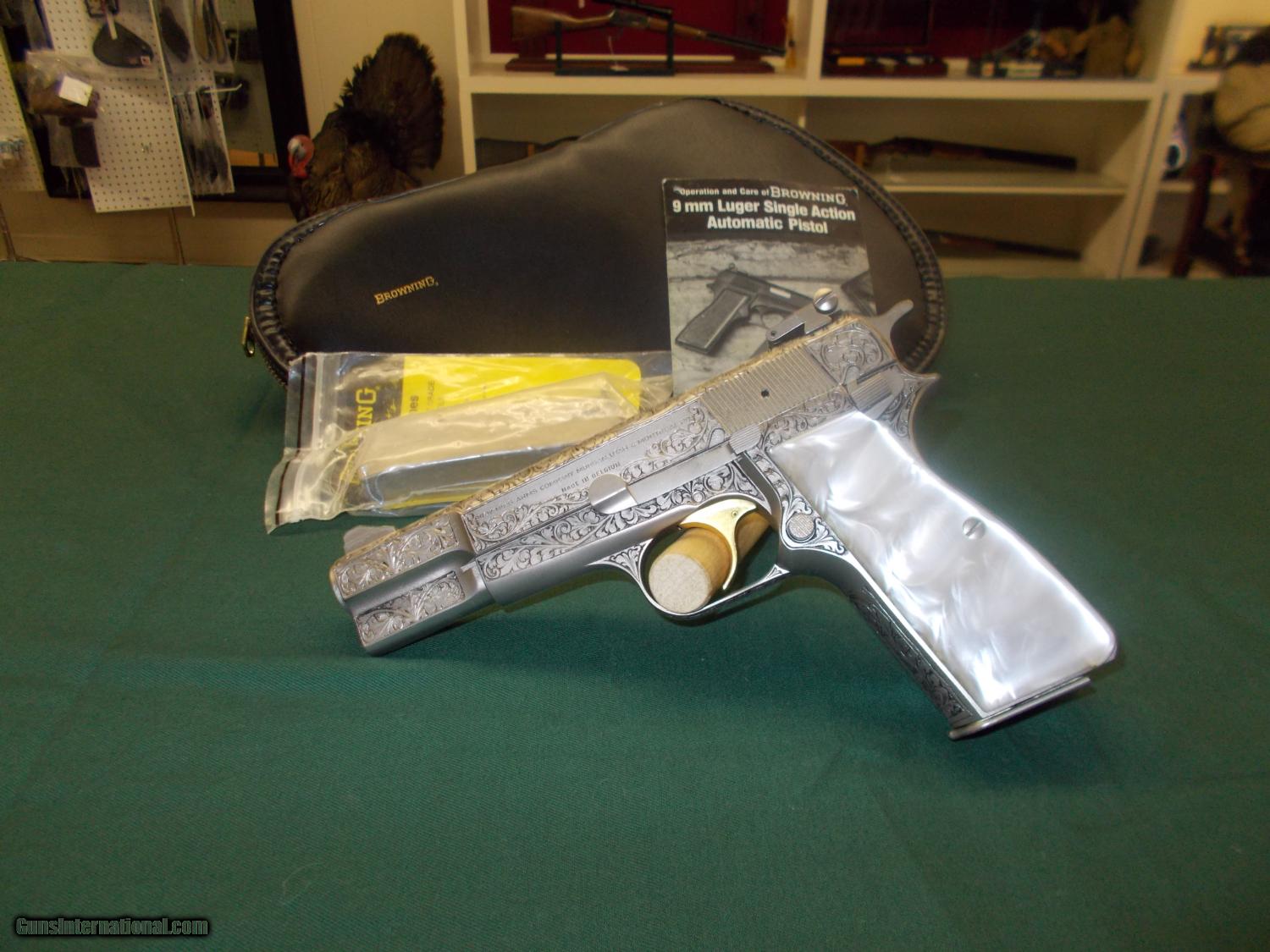 Description: Browning Hi Power Pistol, 9mm Luger single action Automatic. Extensive scrolls engraving on grey silver slide and frame, synthetic pearl grips, gold plated trigger. Discontinued in 1978. Original pouch and booklet. SOLD Manufacturer: Browning Model: Hi Power Caliber Info: 9mm |