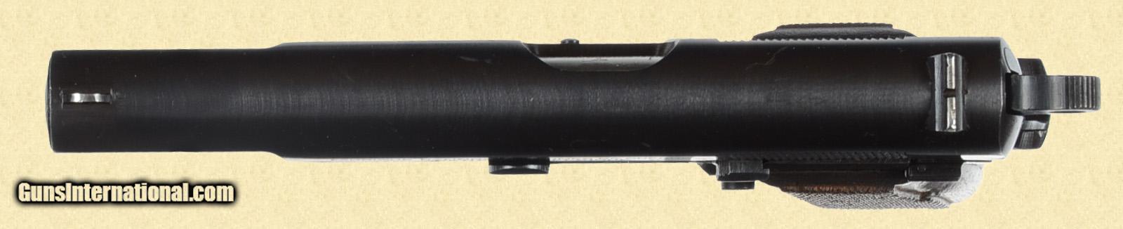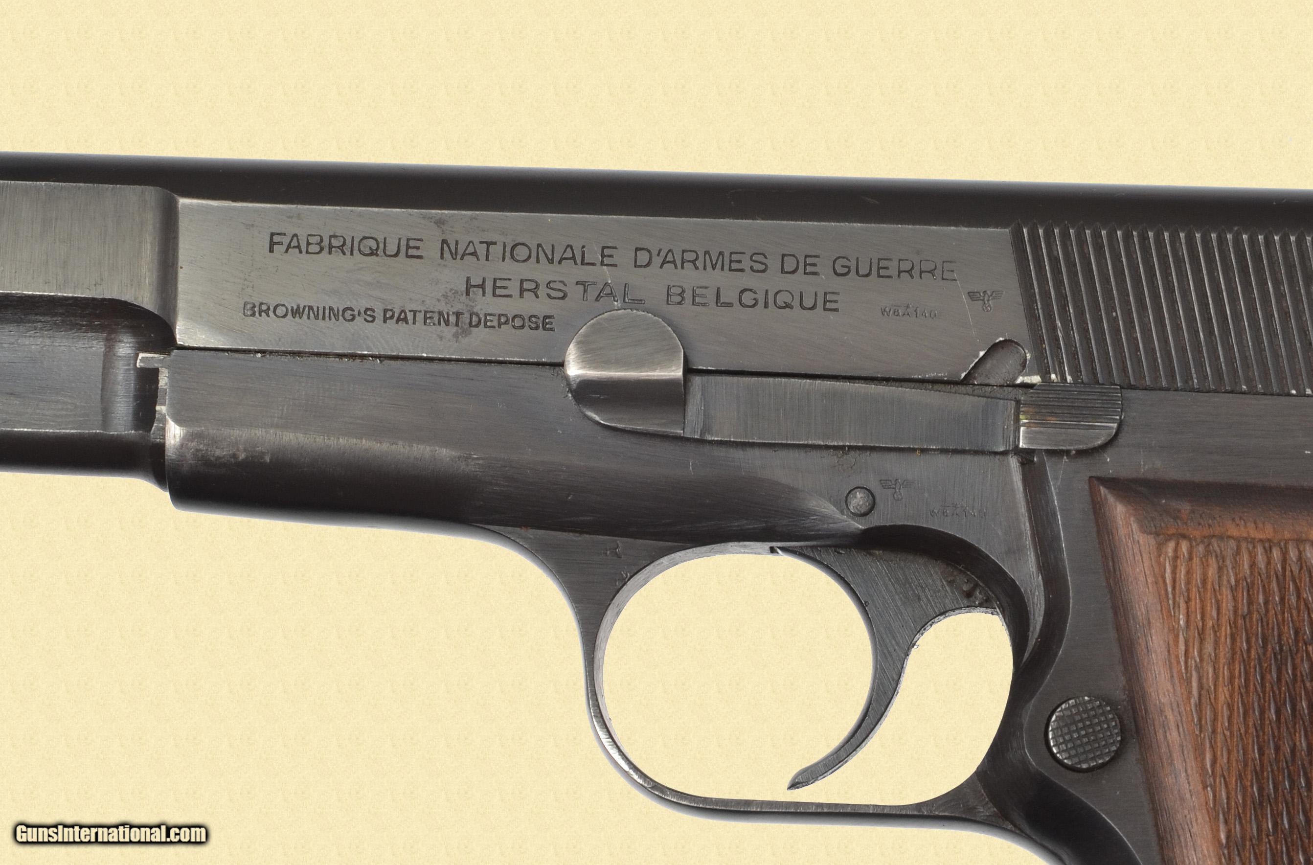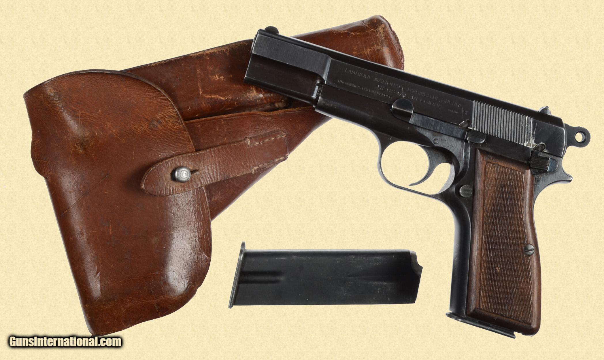 Description: 9mm Luger; 92% blue, very good bore, good grips, 4 5/8'' barrel, Original blue finish and checkered walnut grips. Matching numbers. Fixed sights with non slotted backstrap. Standard FN markings on the left side of the slide. Nazi eagle/swaz military acceptance marks appear on the left side of the slide and frame, along with eagle/WaA140 proofs. Complete with an original magazine which is eagle/WaA140 proofed on the spine. The metal finish shows some edge wear and high point holster rubs. Mechanically fine. The bore has shine and strong rifling, showing some minor frost on the grooves. Rig, includes an original leather holster in fair-good condition. Marked on the front small breakaway flap dld/43 with an eagle/WaA195 proof. The holster has a hole on top of the flap, a slight tear on the bottom of the single belt loop and some stitching loose on the back of the tip. Also includes an extra original magazine, which is period correct, not nazi proofed. SOLD Curio/Relic: Yes Manufacturer: Browning Model: 1935 Hi Power Nazi Serial Number: 61403a Caliber Info: 9mm Luger Metal Condition: 92% blue Wood Condition: good Bore Condition: very good Barrels: 4 5/8 Action: SA |