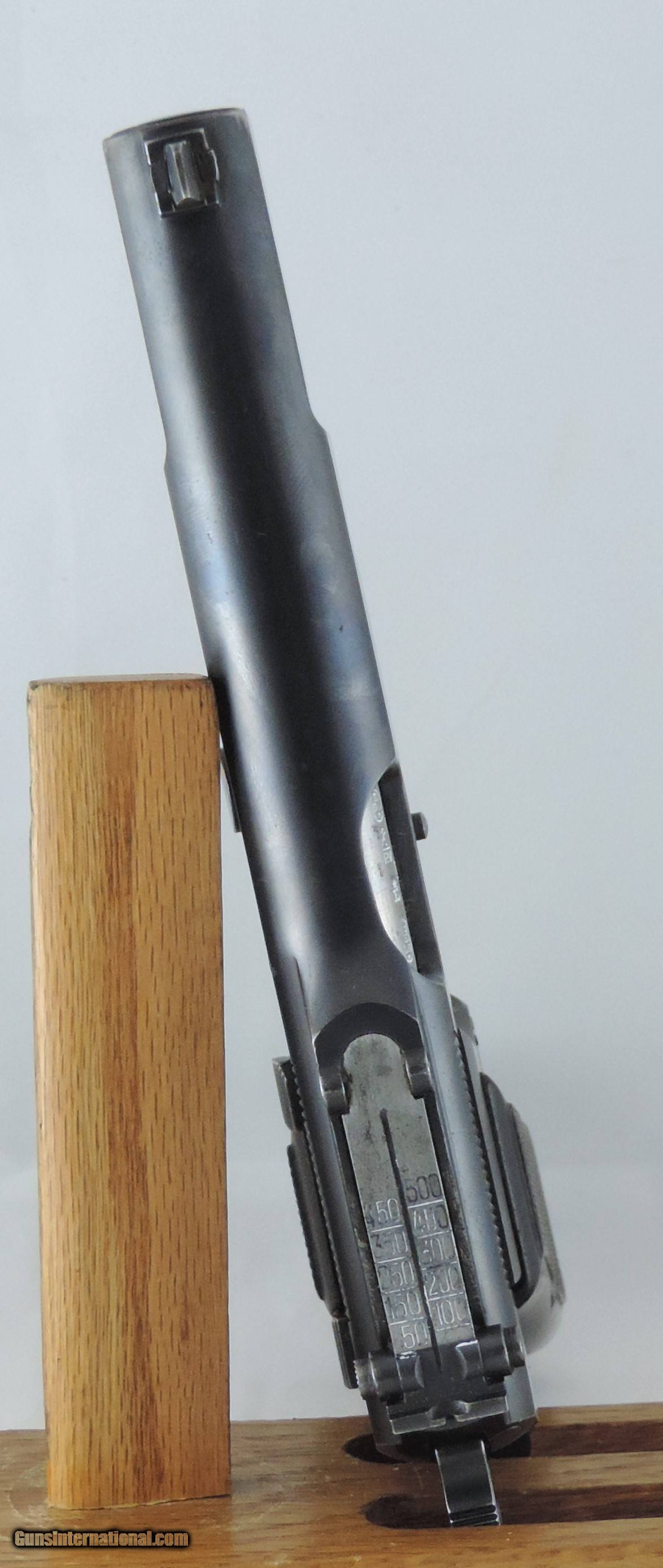 Description: Inv. 7520 Browning, Scarce Pre-War Hi-Power, Cal. 9mm, Ser. 39730, Super condition, with all the desirable features, tangent sight and slotted for stock. This wartime hideaway retains about 98-99% of the original FN factory finish. The very little loss there is, is due to to some very slight sharp edge silvering and a minute nick or two. The grips straps show no sign of graying. The slide has all the proper Belgian military and national proofs. All parts match. The walnut grips are almost flawless. The left one does have a very tiny chip out of the bottom rear. They also have the correct red lining. The slide rails, bolt face and feed ramp show little if any use. The bore is shiny bright with razor sharp rifling and possibly some very faint scattered frost. It comes with one correct split tail magazine. Frankly it looks like it sat out most of it's life as an attic queen. It would a prize in any collection, a great invest and super on the range. Priced modestly at ....SHIPPED...... $2895. To purchase this firearm or if you want to request more information contact us at: Email ckguns[at]ymail[dot]com Phone 201-512-0002 Cell 201-575-6838 FAX 201-215-4759 We accept most major credit cards. Prices shown are Discounted 3% for Cash or Check. The buyer must be familiar with all the laws governing the purchase and the ownership of firearms in their own city and state. The Yankee Armorer, Inc is not responsible for any failure to comply with or observe these laws. The Yankee Armorer, Inc will only ship after full payment and receipt of all required documents. Shipping: Add $35.00 for handguns, $45.00 for long guns. New Jersey buyers are subject to a 7% sales tax. The Yankee Armorer, Inc offers a 3 day inspection period with full refund upon return of intact firearm and in the original condition. The Yankee Armorer, Inc offers a no interest lay away program - 25% down; 25% in 30 days; 25% in 60 days; and full payment in 90 days. Any violation of this policy is subject to restocking and forfeiture of all payments. Any variation from this policy must be agreed to in advance. Unshipped Cancelled sales are subject to a 20% restocking fee. Be advised that all firearms sold by The Yankee Armorer, Inc. or the Gun Exchange, LLC (SELLER) are sold as collector’s items. They have not been fired or tested for safety and must be examined by a license gunsmith prior to use. By purchasing any item from the (SELLER), you are agreeing to hold the (SELLER) free from any damages or lawsuits of any nature. Any item left for transfer or storage will be charged to $25.00 per month, per item from the day of its receipt. Any variation from this policy must be agreed to in advance. Store hours 10:00 am to 5:00 pm Tuesday -Saturday. It's always best to call for appointment. Store 201-512-0002, cell 201-575-6838. SOLD Curio/Relic: Yes Manufacturer: Browning Model: Hi-Power Serial Number: 39730 Caliber Info: 9 mm Condition: 98% |
