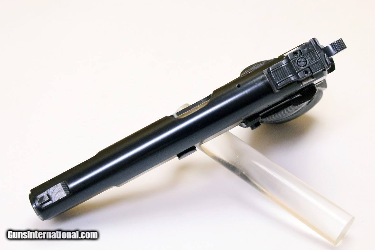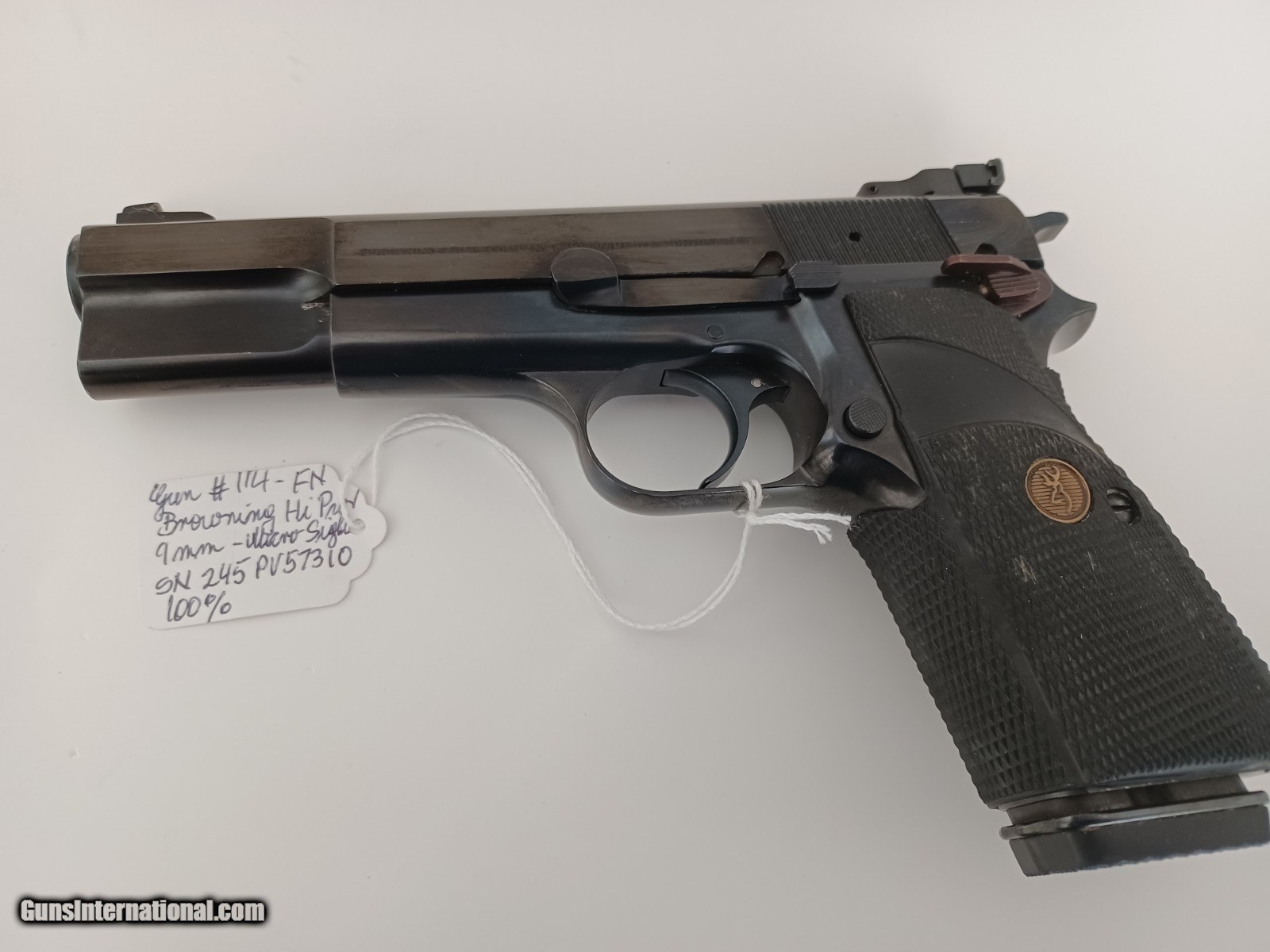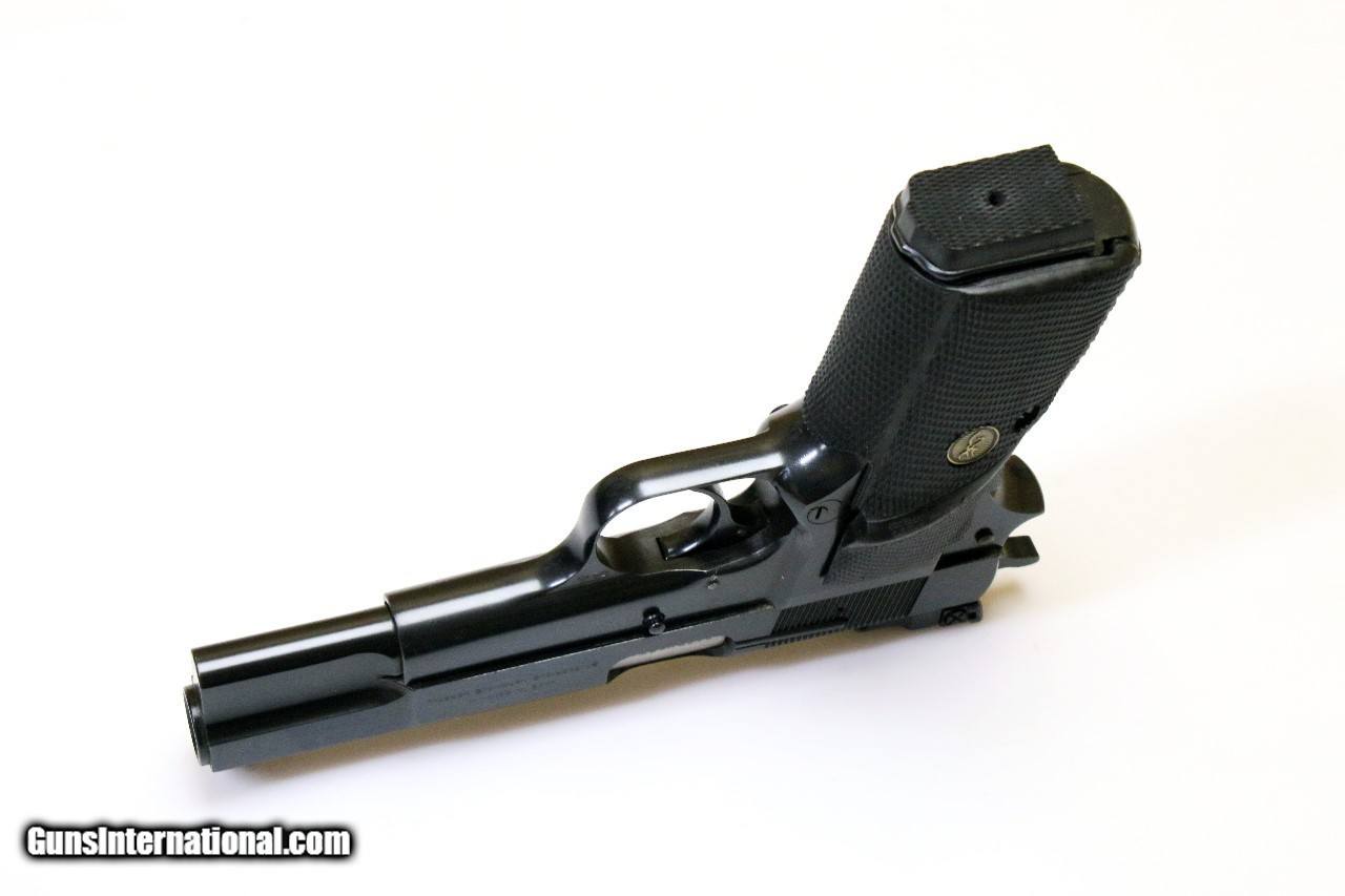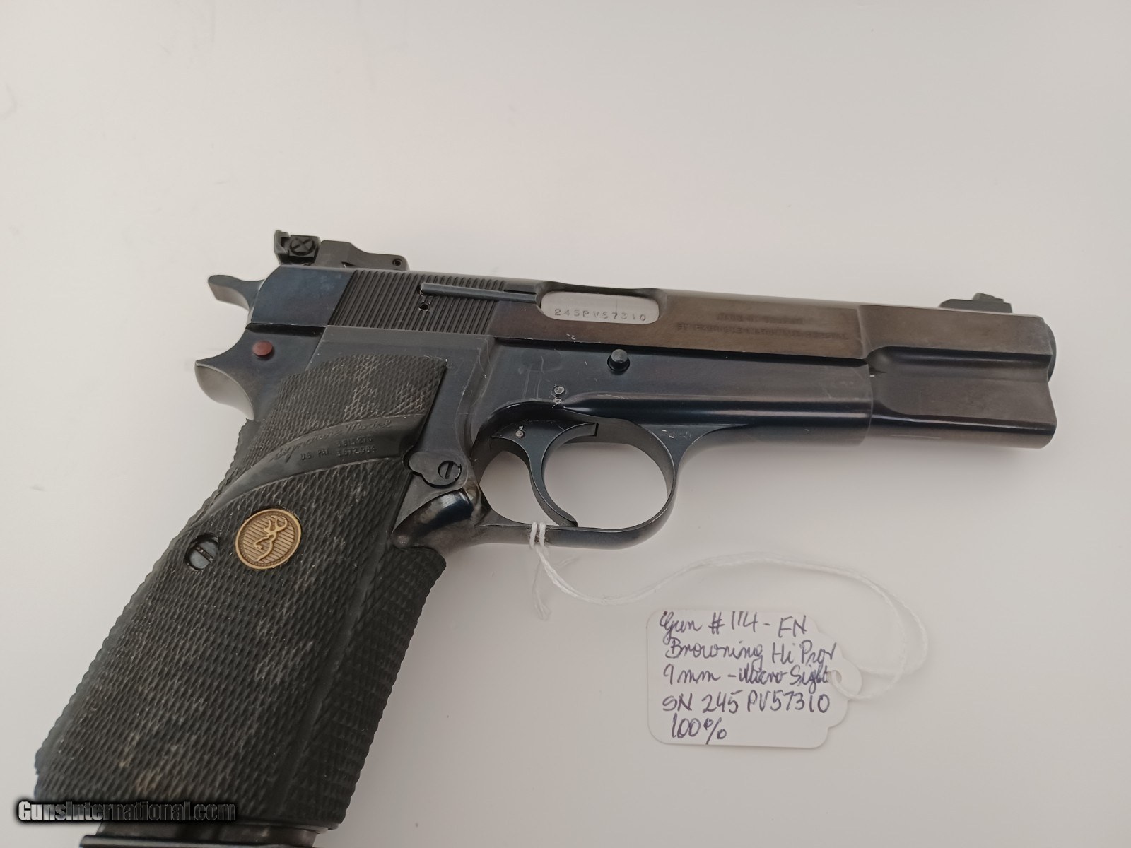 Description: Excellent BROWNING Hi-Power Pistol, 9mmL, Target Sight, Polished Finish Make: Browning (Made in Belgium) Model: High-Power Serial Number: 245PV57310 Year of Manufacture: 1985 Caliber: 9mm Luger Action Type: Single Action Semi-Automatic Pistol Markings: The left side of the slide is marked with BROWNING ARMS COMPANY MORGAN UTAH & MONTREAL. The right side of the slide is marked with MADE IN BELGIUM BY FABRIQUE NATIONALE HERSTAL. The barrel is marked CAL 9m/mL and the serial number 245PV57310 indicating that the pistel was manufactured in 1985. Barrel Length: 4.5 Inches Sights / Optics: The front sight is a blade fixed to a base on top of the slide. The rear sight is adjustable with a flat topped “square” outlined in white for faster target shooting.. Stock Configuration & Condition: The grips are wrap-around checkered black rubber with a golden Browning seal in the middle of both sides. The grips are free of damages, rating in Fine Plus and Excellent overall condition. Type of Finish: Polished Blue/Black Finish. Finish Originality: All Original Bore Condition: The bore is mirror bright and the rifling is sharp. There is no erosion or signs of much use outside of the factory, if any at all. Overall Condition: This handgun retains about 100% of its metal finish. The pistol appears to have been stored nearly all of its life with infrequent handling. The slide serrations are sharp, the barrel is free of extensive operational wear. The markings are clear. Overall, this handgun rates in about Excellent condition. The Browning Hi-Power pistol, first produced in 1935, is one of the best combat pistols ever designed. Lightweight, accurate, with a comfortable grip angle and chambered in 9mm with a 13-round capacity magazine, the Hi-Power is still being used or has just recently replaced by military forces in over 50 countries worldwide. Since production of Browning Hi-Power pistols has been stopped in , the values of these pistols have dramatically risen and will continue to do so. SOLD |