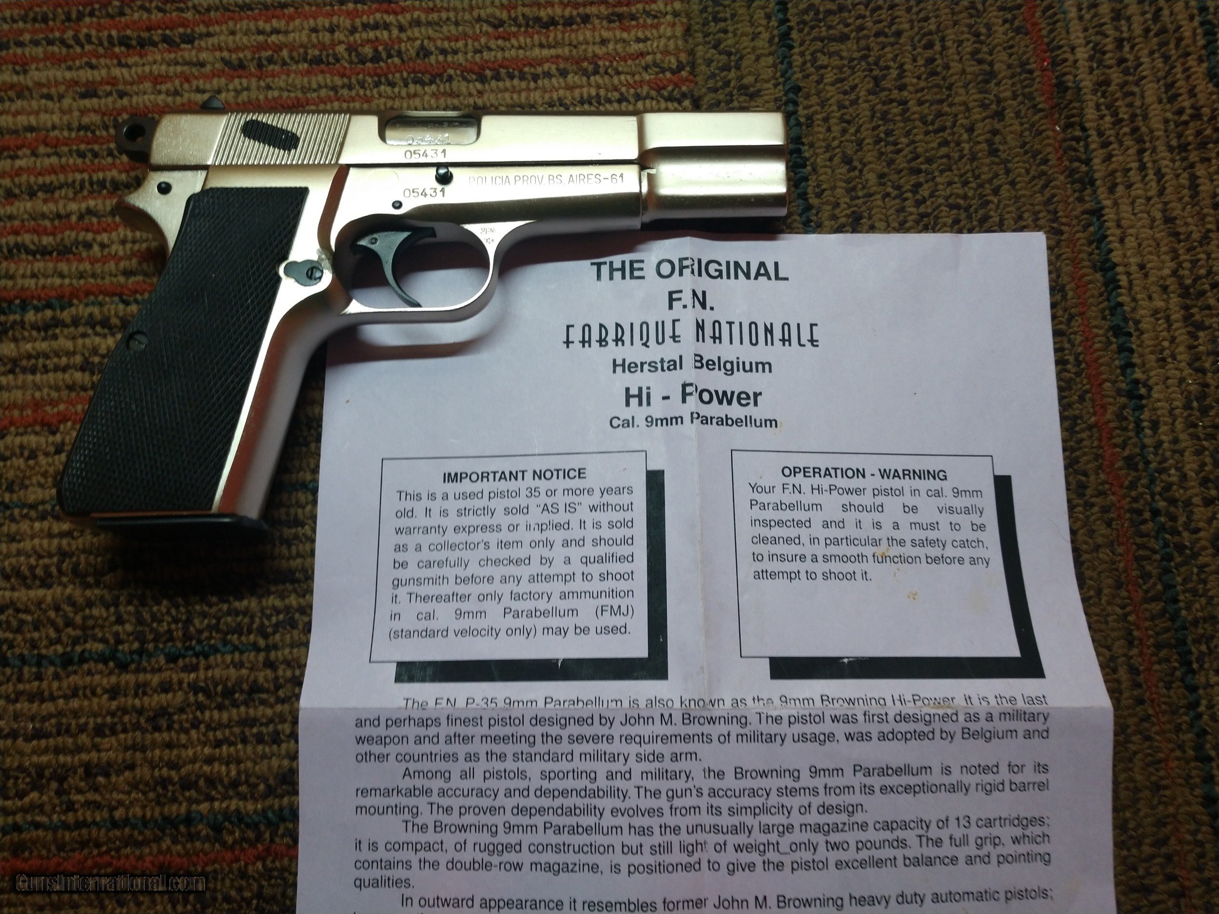 Description: Very nice police Hi Power in box with paper work. Made in 1961 by FN. Any questions call or text Jim at 352-359-5021 SOLD Curio/Relic: Yes Handgun Caliber: 9x19mm Parabellum (9mm Luger, 9x19mm NATO) Manufacturer: FN Model: Hi Power Condition: Very good Finish: Nickle Manufacture Date: 1961 |