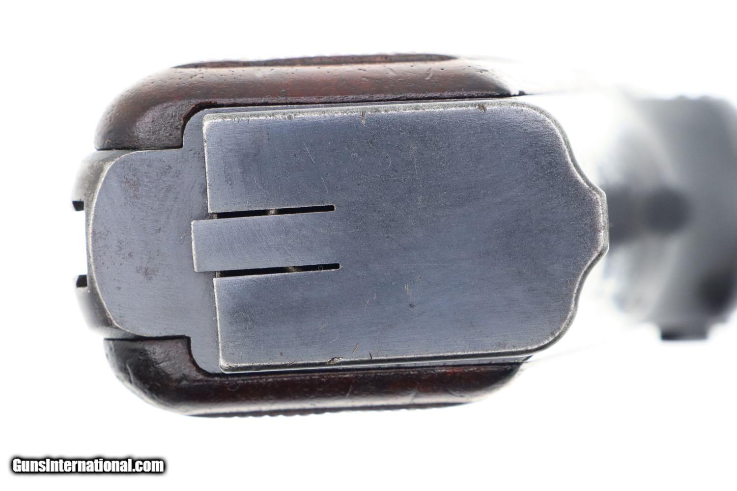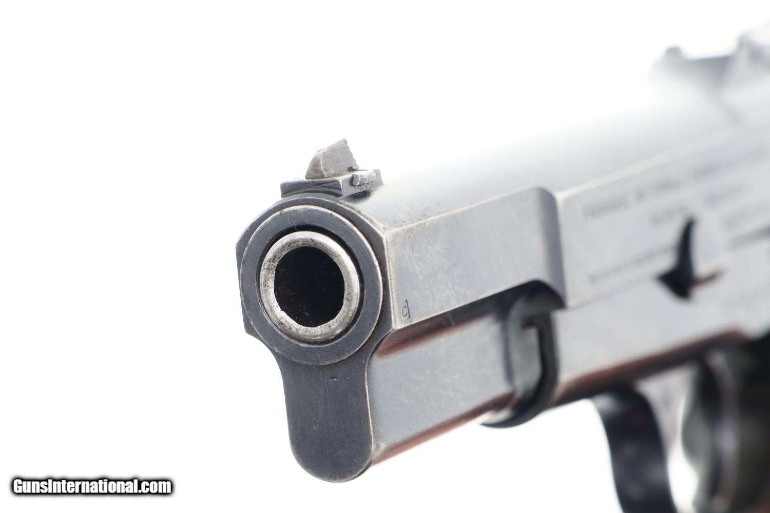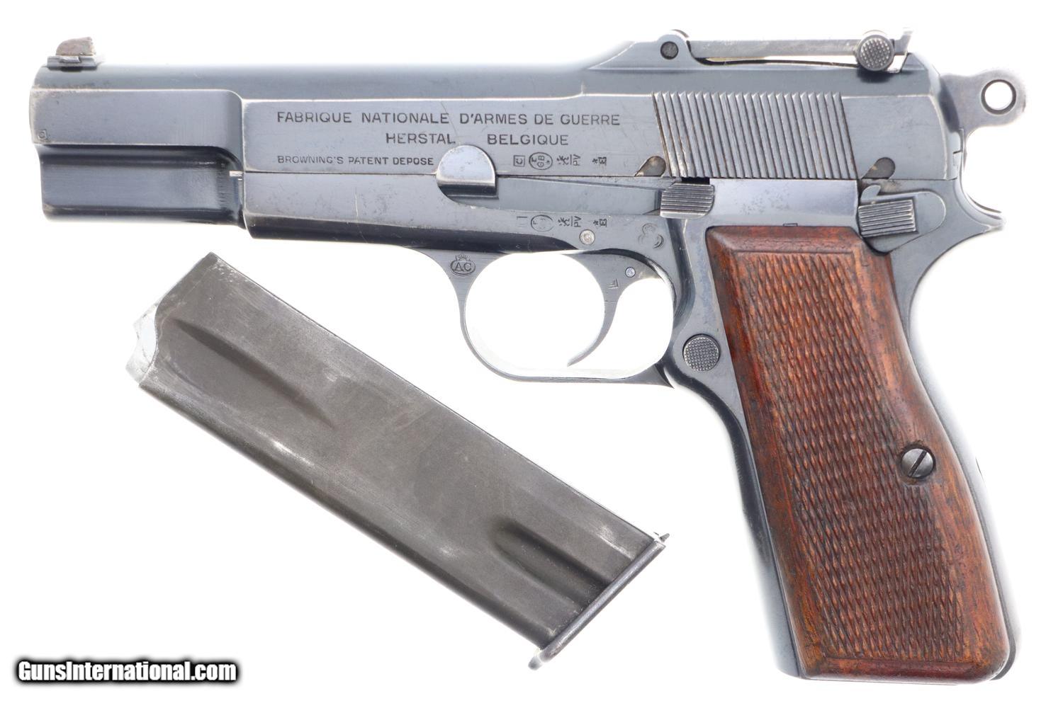 Standard configuration Belgian Army, Pre-War HP pistol in 9mmP, all matching with correct high capacity magazine. This classic military pistol has a drift adjustable front sight, slip-in tangent rear sight with full-bar graduations from 50-500, thumb print slide, internal extractor, and is slotted for shoulder stock. Left side of slide with usual manufacturer markings. Scattered Belgian proofs on left side of slide, frame, and over chamber that is additionally marked with caliber. Later applied military markings on left side of frame and trigger guard that break the blue. Matching barrel, slide, and frame. Original walnut grips with central checkering and smooth borders. Correct Belgian Army magazine with a boxed “A” and a boxed “C” stamping on spine and rust blued split-tail floorplate.