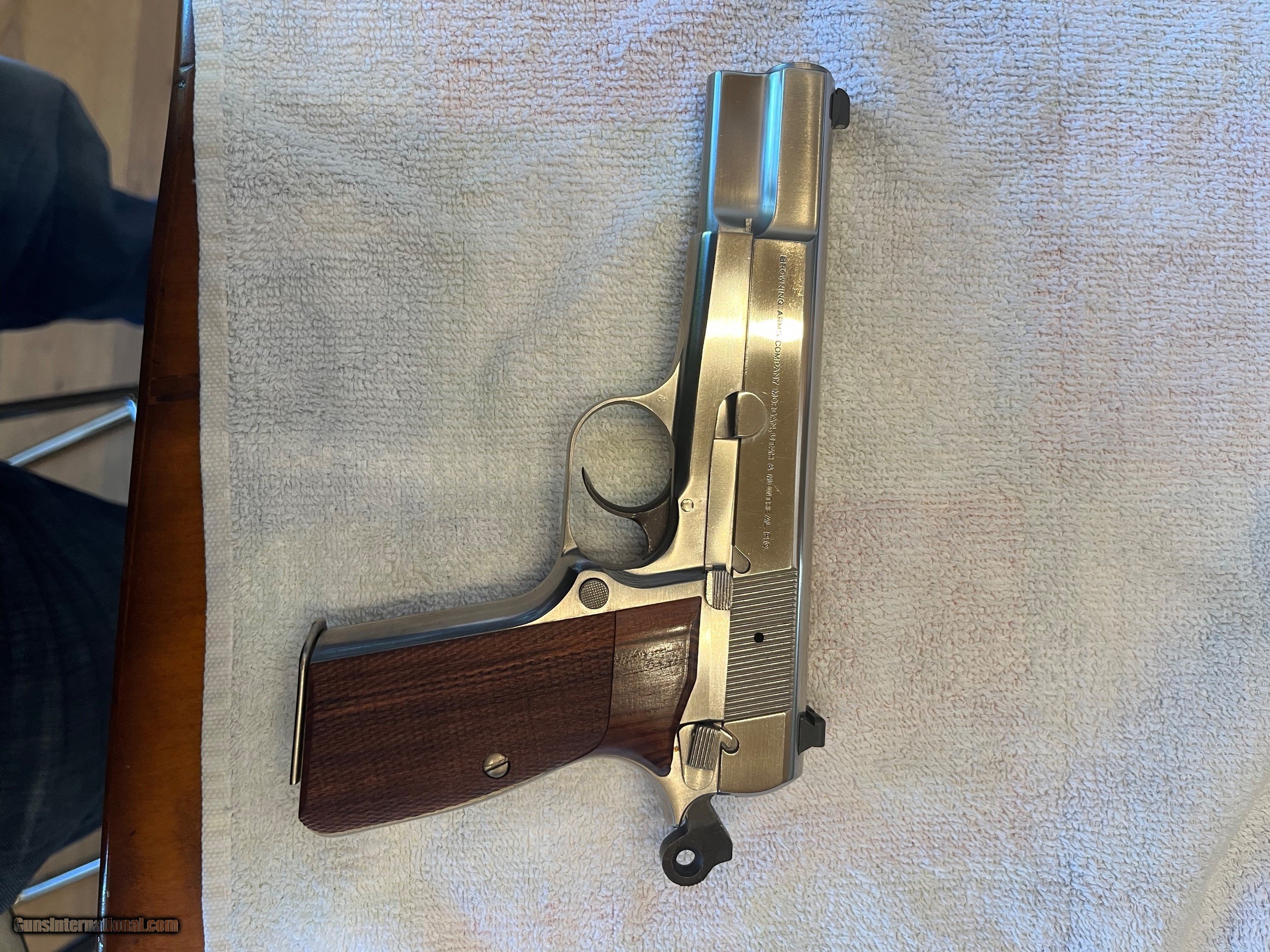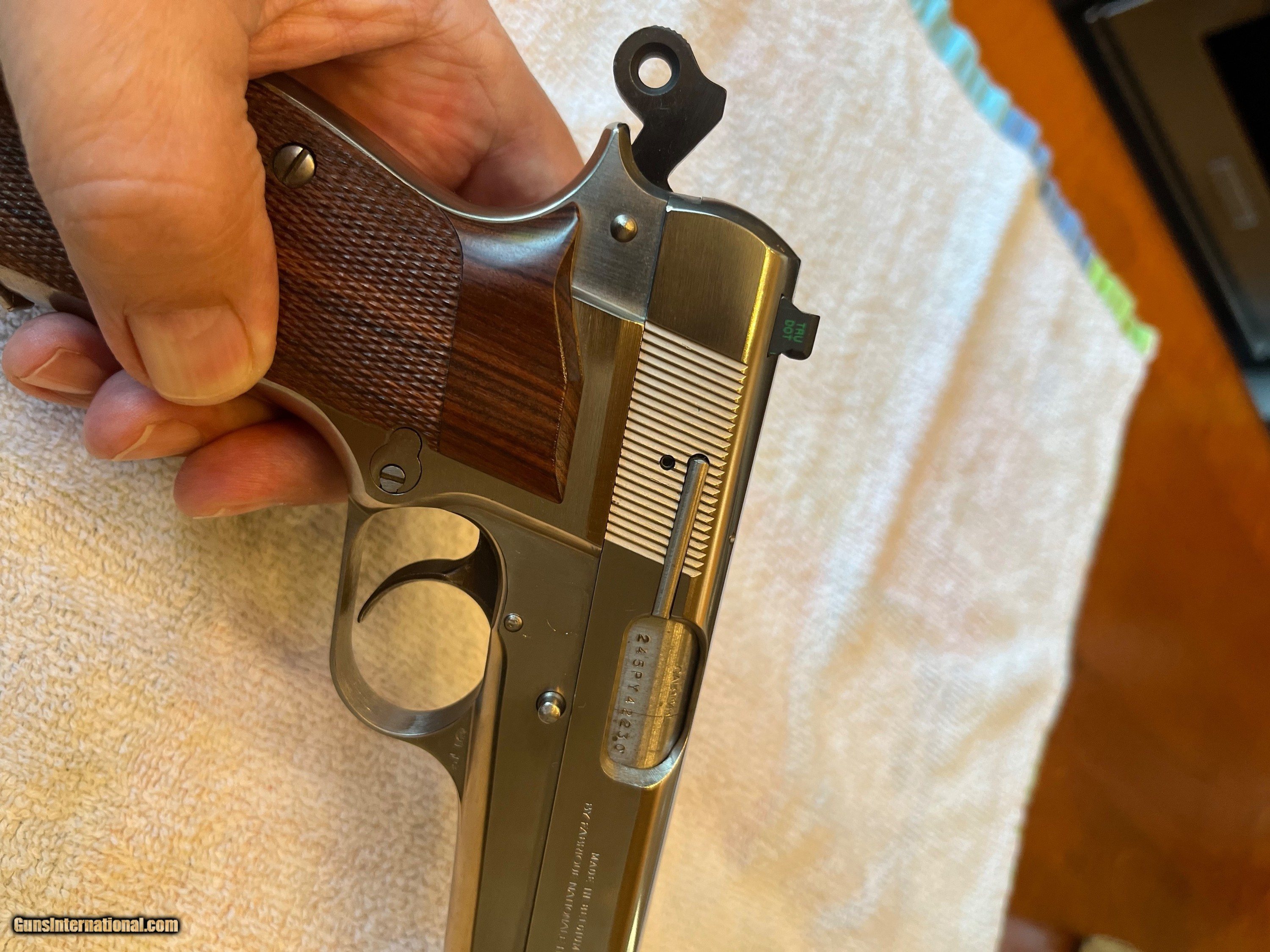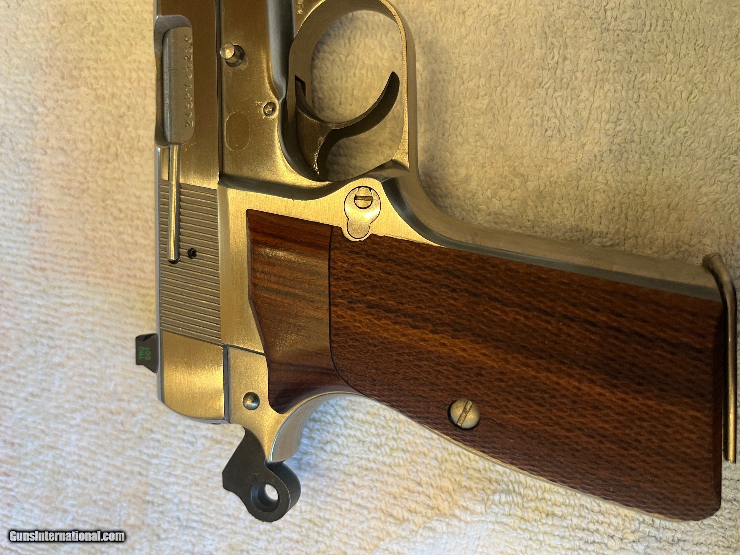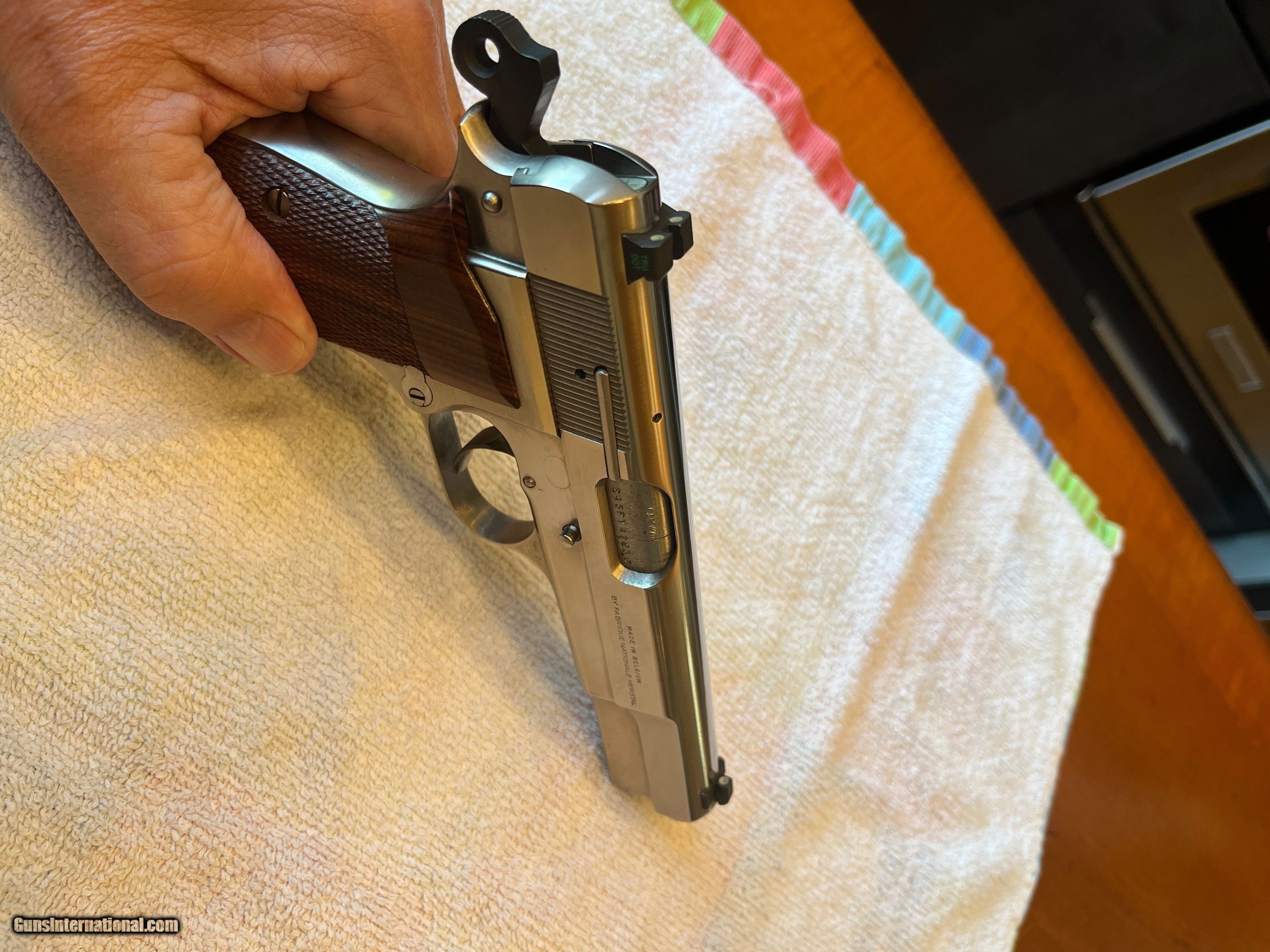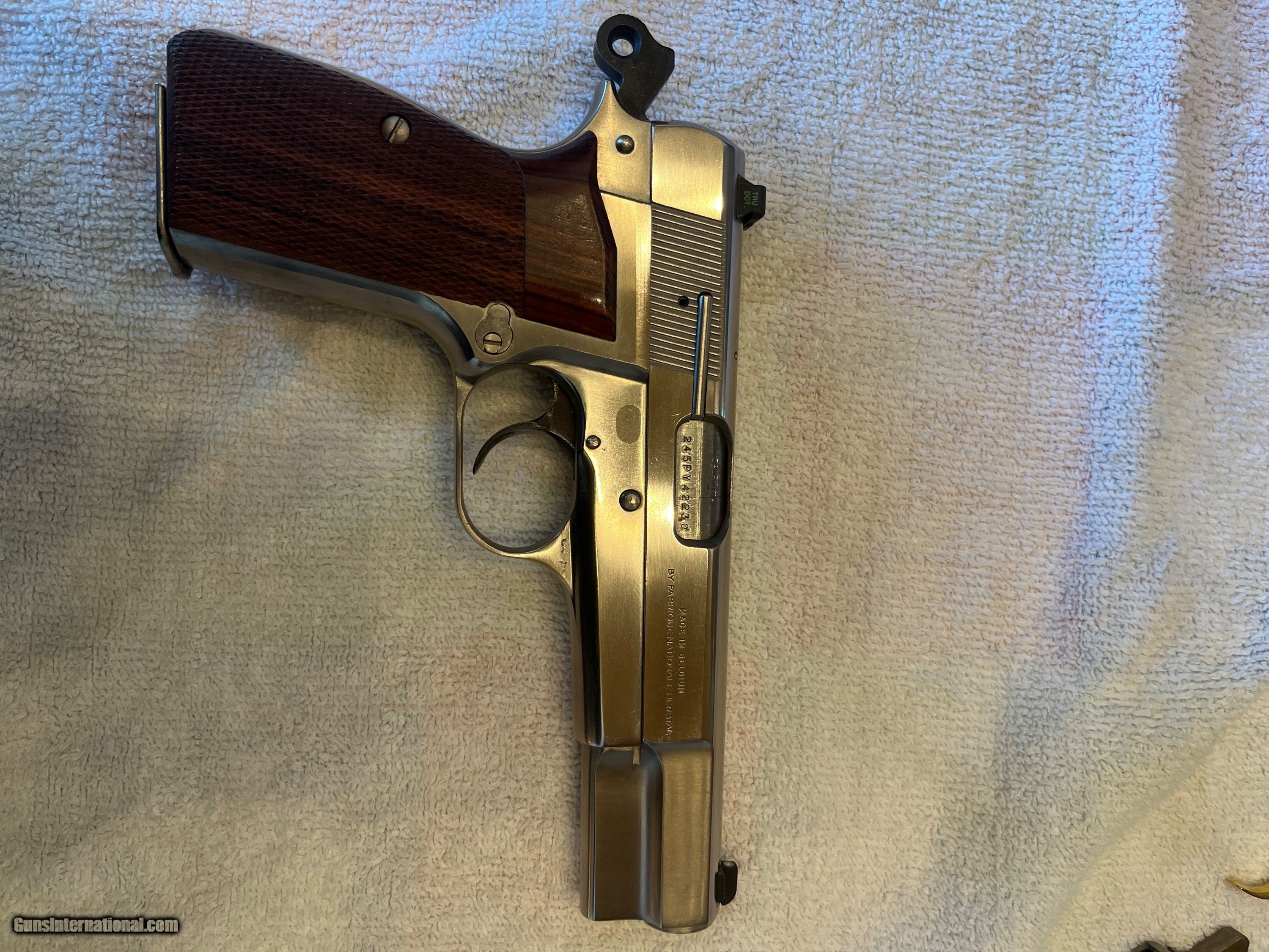Description: PRICE REDUCED. Rare, seldom available, full factory nickel Belgium Browning Hi Power 9mm. Excellent + condition. Extras include Cylinder and Slide wide combat trigger and no-bite ring hammer, magazine disconnect removed for improved trigger pull, Beautiful checkered Hogue rosewood grips, and factory Browning gun rug. Tiny factory nickel front sight and tiny nickel rear have been expertly replaced with dovetailed black Tru Glo tritium night sights giving vastly improved visibility. Included in purchase will be the original gold trigger, original nickel spur hammer and magazine disconnect and spring, all of which can be easily reinstalled by purchaser if desired. $1,750 plus $60 for insured shipping (just raised slightly thanks to UPS's 8/29 rule changes regarding shipping from private sellers to FFL dealers). Very nice Safariland leather Hi-power holster included. Thanks for looking. Please call or text with any questions or use the "email seller" function of this site. SOLD Handgun Caliber: 9x19mm Parabellum (9mm Luger, 9x19mm NATO) Manufacturer: Browning Arms Co. Model: Belgium made Hi Power Condition: Excellent + Metal Condition: Excellent + Wood Condition: Mint Bore Condition: Perfect Sights: Dovetailed Tru Glo tritium |
