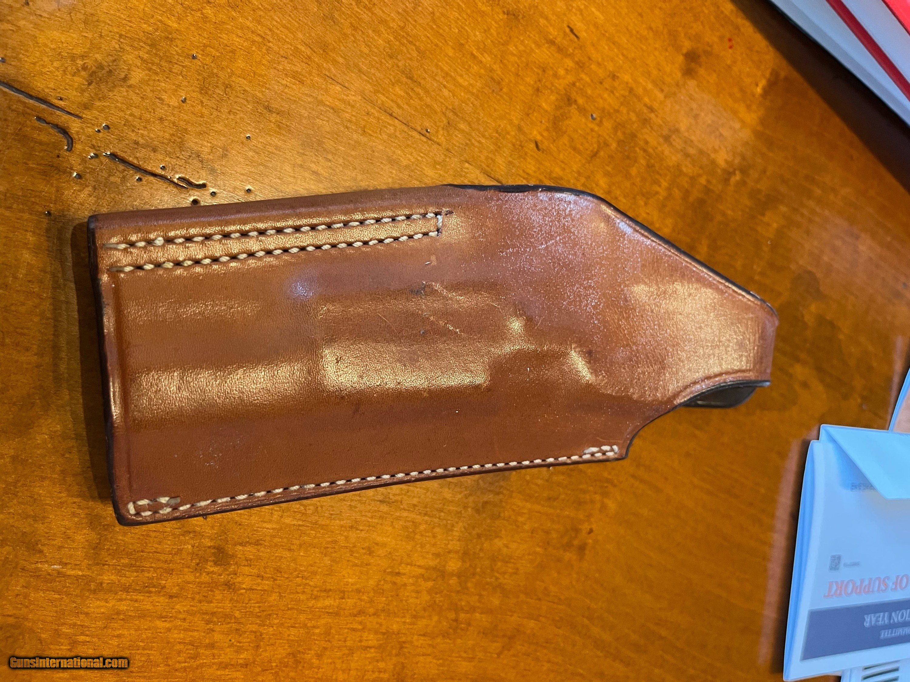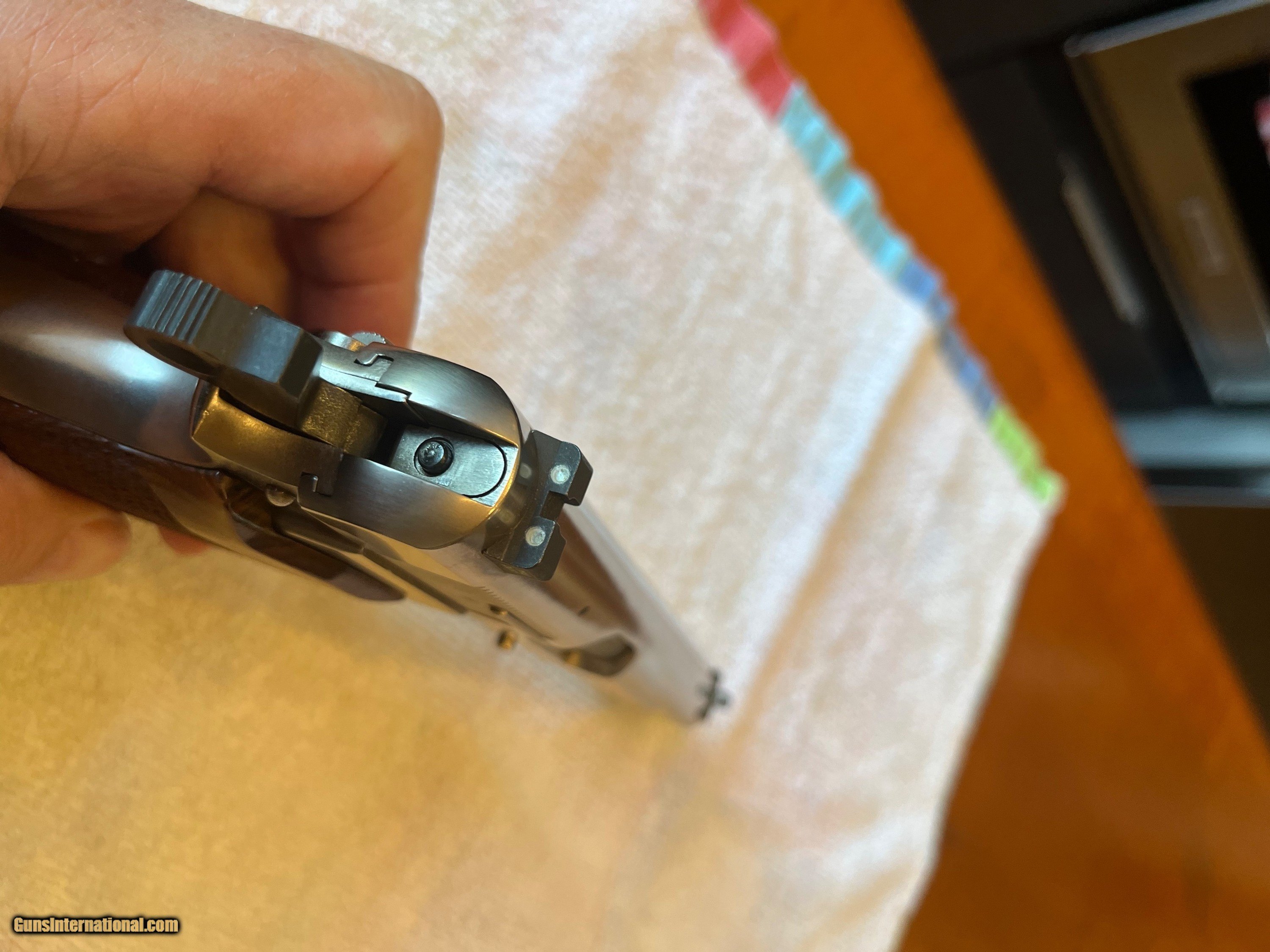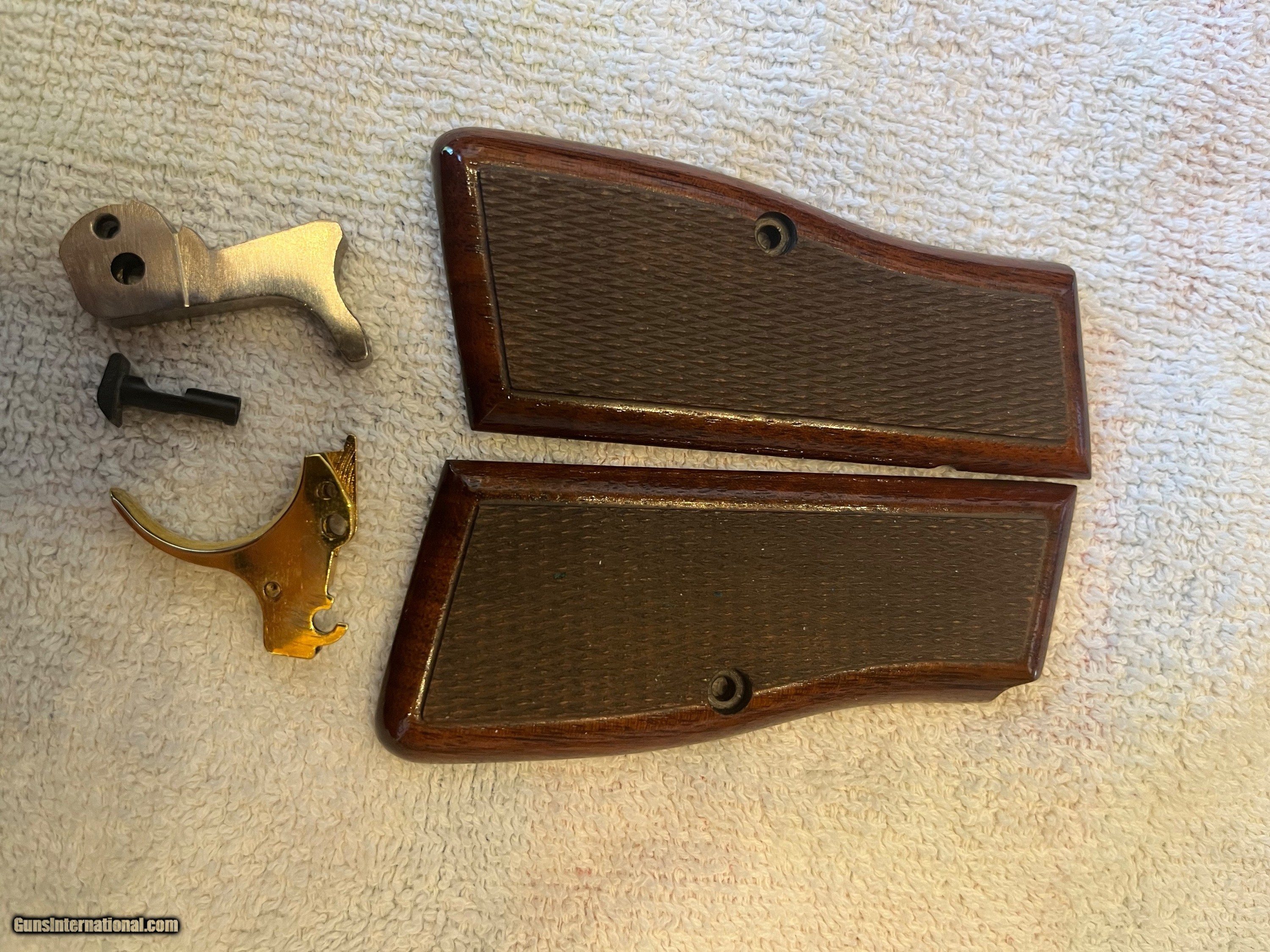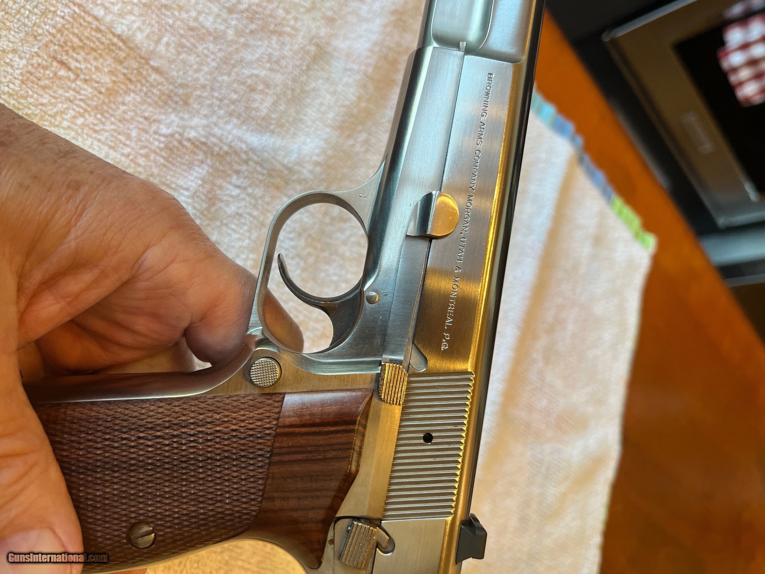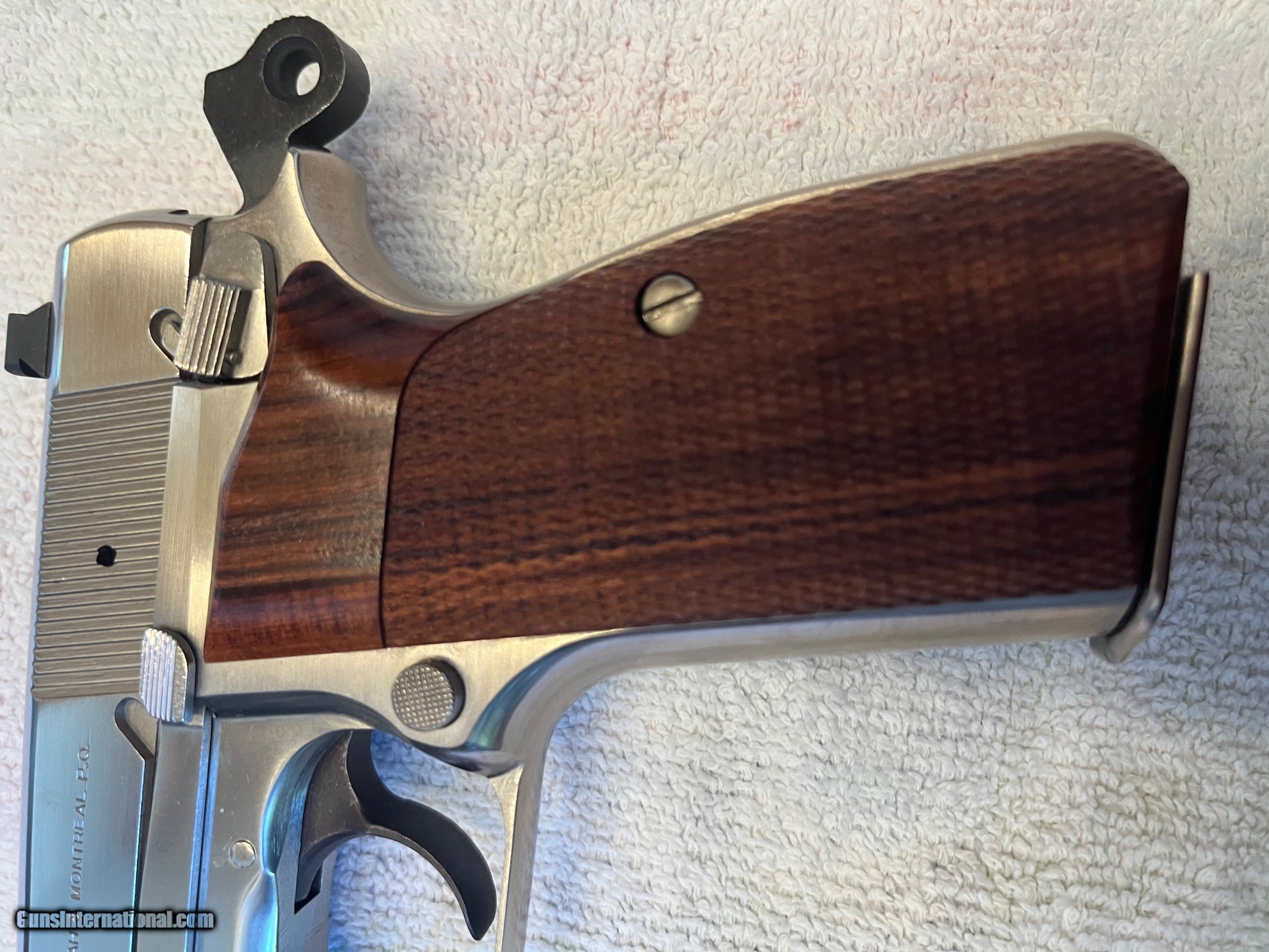 Description: PRICE REDUCED. Rare, seldom available, full factory nickel Belgium Browning Hi Power 9mm. Excellent + condition. Extras include Cylinder and Slide wide combat trigger and no-bite ring hammer, magazine disconnect removed for improved trigger pull, Beautiful checkered Hogue rosewood grips, and factory Browning gun rug. Tiny factory nickel front sight and tiny nickel rear have been expertly replaced with dovetailed black Tru Glo tritium night sights giving vastly improved visibility. Included in purchase will be the original gold trigger, original nickel spur hammer and magazine disconnect and spring, all of which can be easily reinstalled by purchaser if desired. $1,750 plus $60 for insured shipping (just raised slightly thanks to UPS's 8/29 rule changes regarding shipping from private sellers to FFL dealers). Very nice Safariland leather Hi-power holster included. Thanks for looking. Please call or text with any questions or use the "email seller" function of this site. SOLD Handgun Caliber: 9x19mm Parabellum (9mm Luger, 9x19mm NATO) Manufacturer: Browning Arms Co. Model: Belgium made Hi Power Condition: Excellent + Metal Condition: Excellent + Wood Condition: Mint Bore Condition: Perfect Sights: Dovetailed Tru Glo tritium |