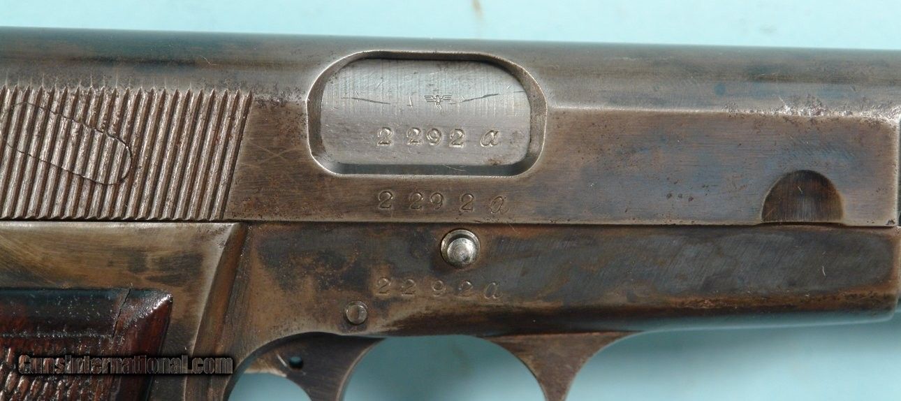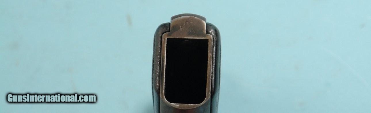 Description: WW2 GERMAN NAZI FN BROWNING’S PATENT MODEL 1935 9MM HIGH POWER OR HI-POWER 9MM PISTOL CIRCA 1942-3. All original and matching with Nazi Waffenampt “WaA140” stamps on left side of slide and frame and on the chamber of barrel. Fixed rear sight. Original magazine. Very good with moderate wear and patination. Excellent markings and proof stamps. Original grips with light wear. Tight working order and excellent bore. SOLD Curio/Relic: Yes Handgun Caliber: 9x19mm Parabellum (9mm Luger, 9x19mm NATO) |