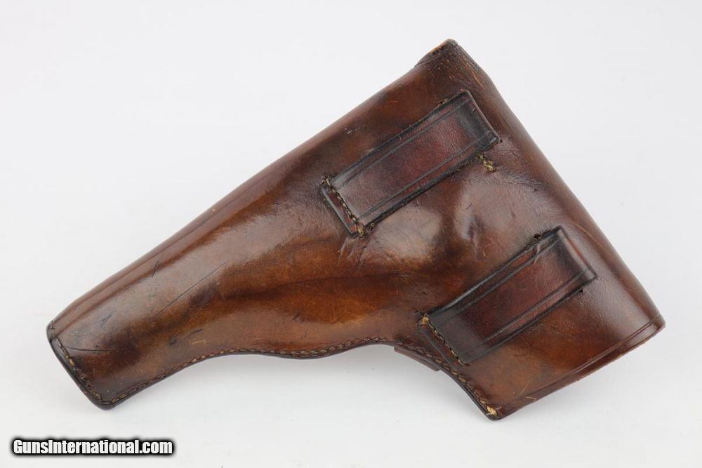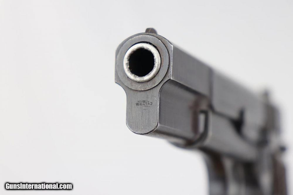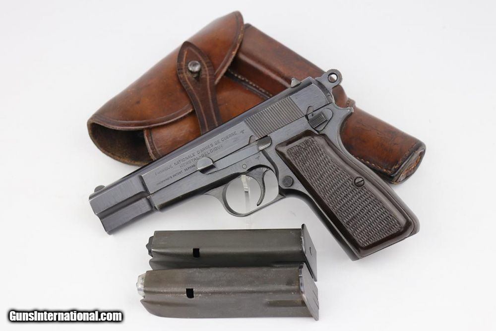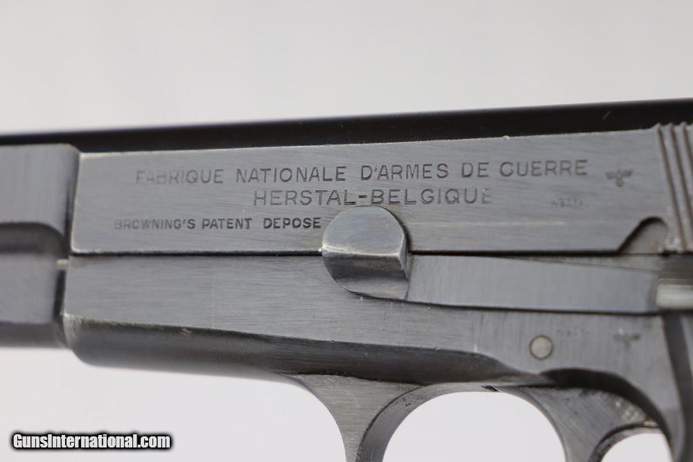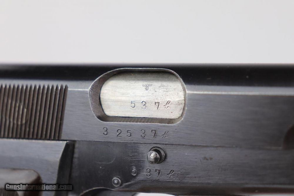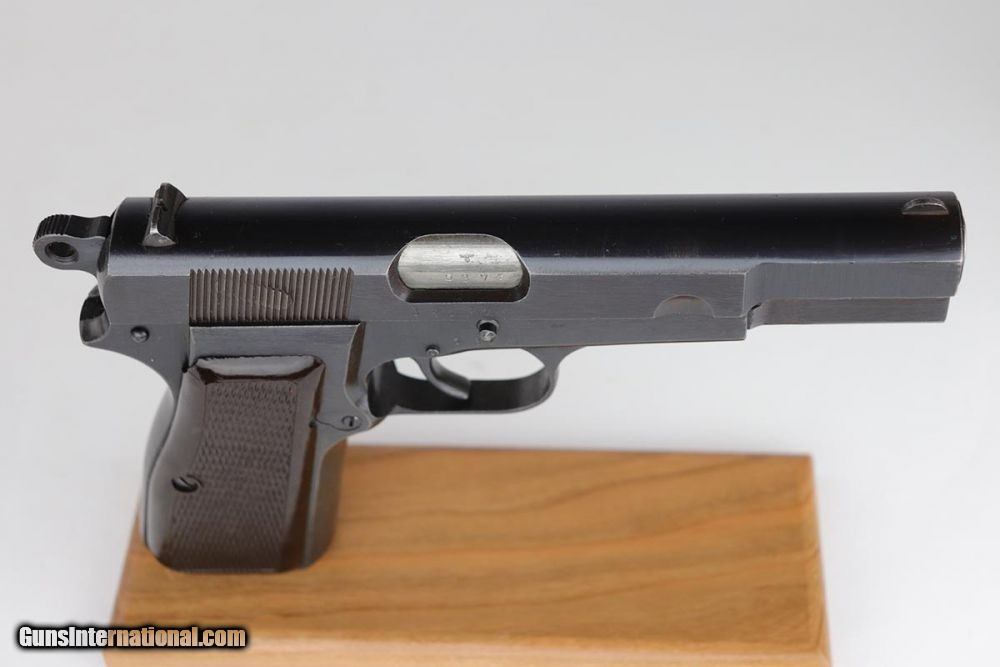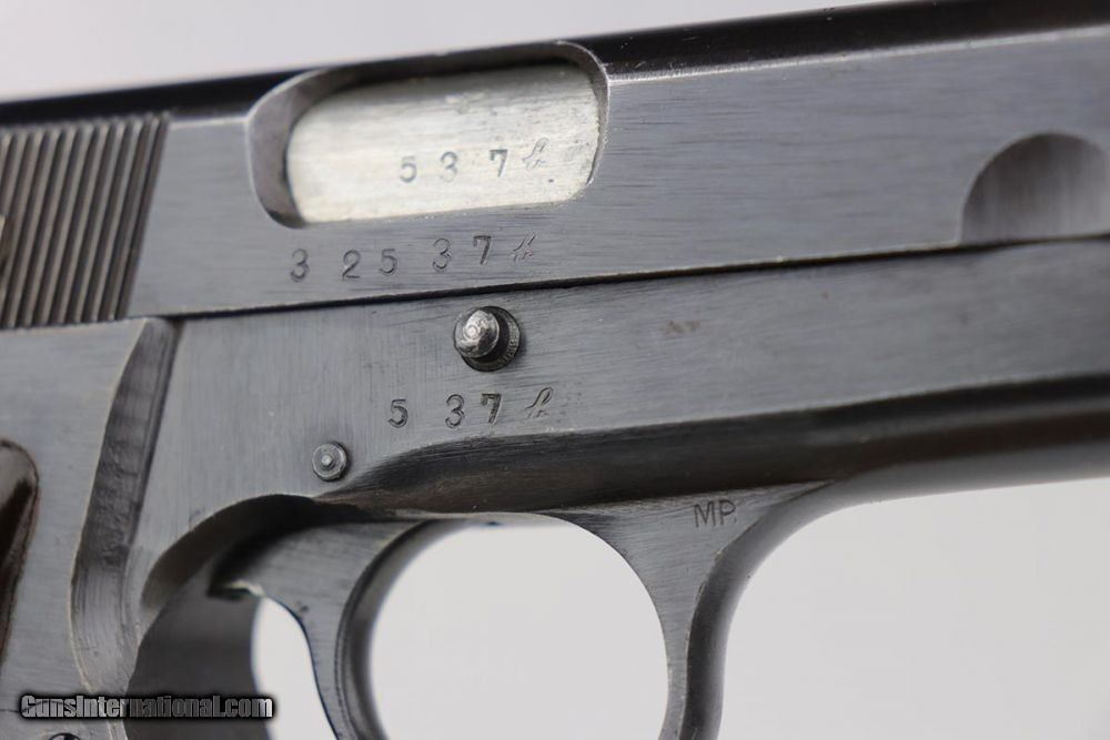 Description: This is an excellent and complete FN Browning Hi Power that was issued to the German Army. The pistol is all matching and correct with 97-98% military blue remaining, showing just some minor thinning on the straps. Very nice brown plastic grips, though the right panel has a small chip in the corner. Strong, shiny bore. Two wartime but unmarked magazines. The rig is topped off by a very interesting holster. It appears a previous owner modified a Radom holster to accommodate the Hi Power. It's unmarked but in terrific condition. SOLD Curio/Relic: Yes Manufacturer: FN Browning Model: Hi Power Serial Number: 32537b Caliber Info: 9mm Bore: 9/10 Condition: 97-98% Manufacture Date: 1940s |