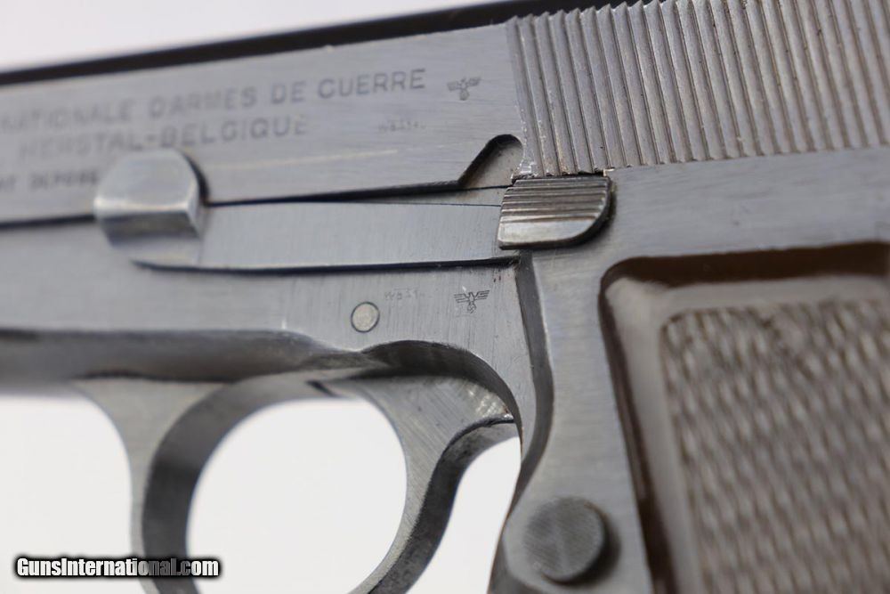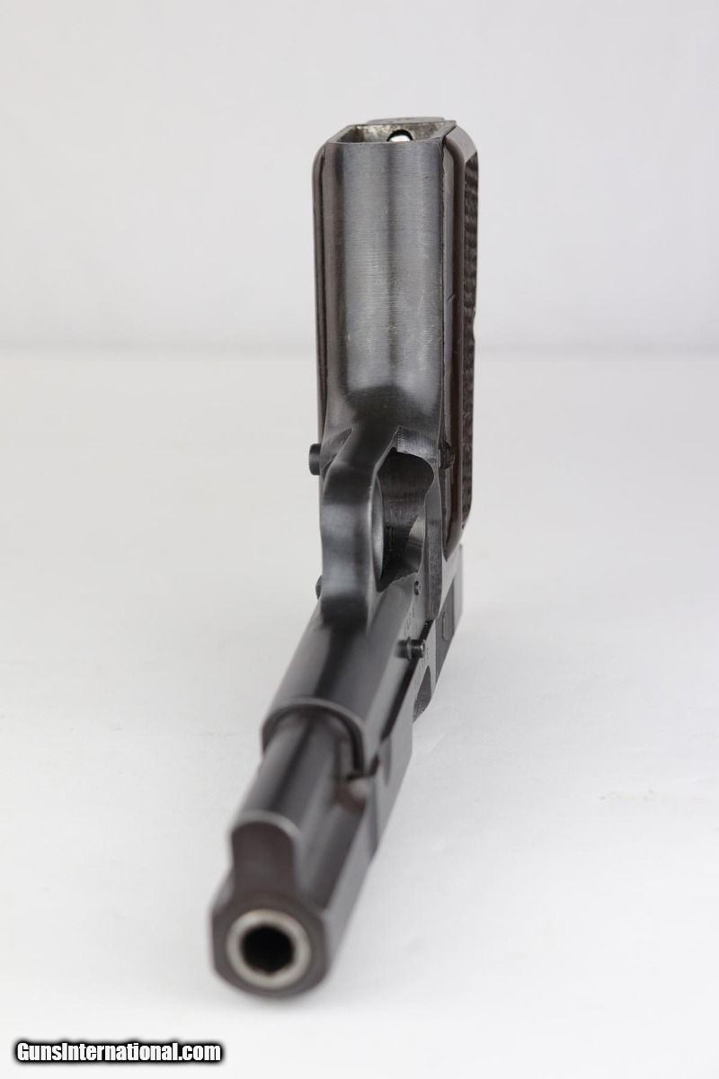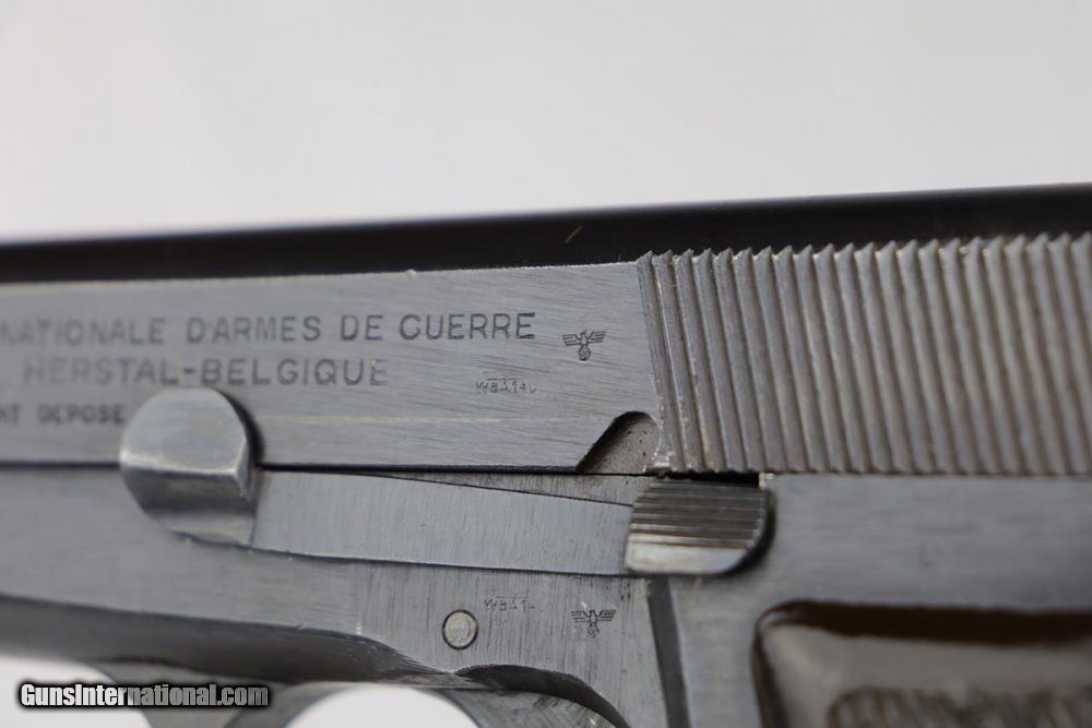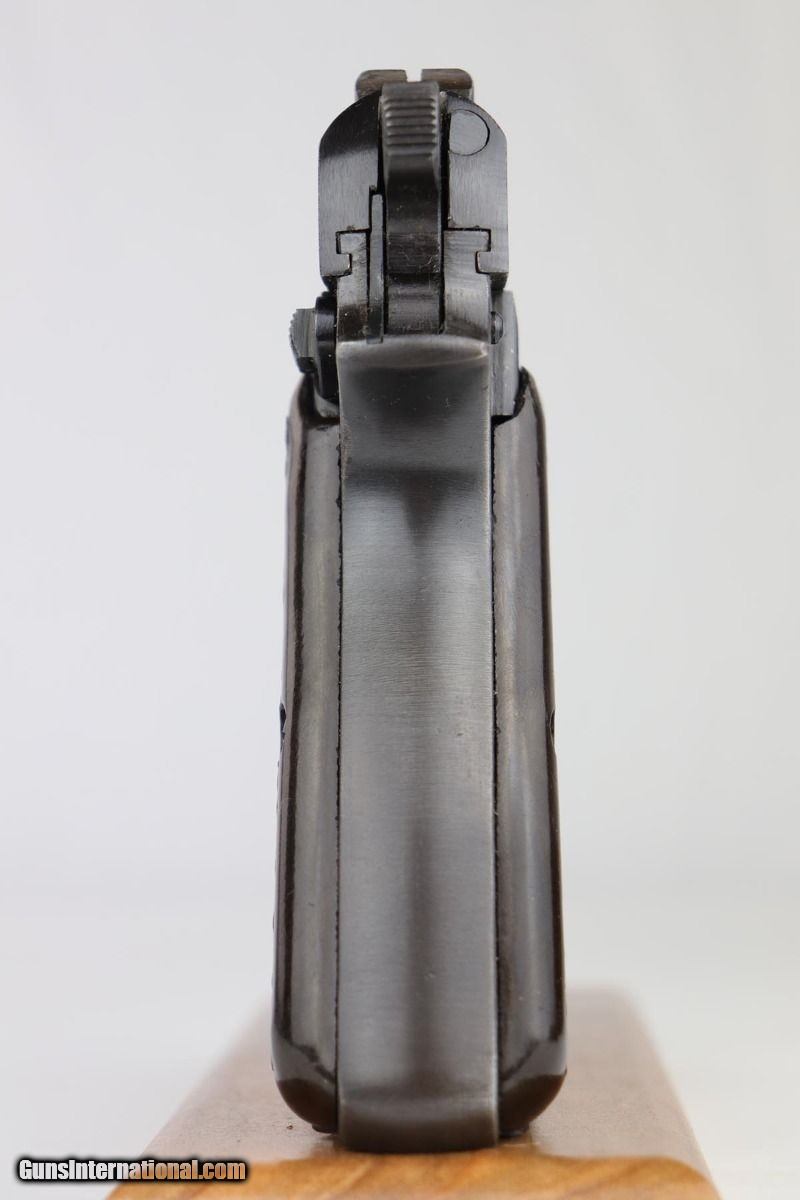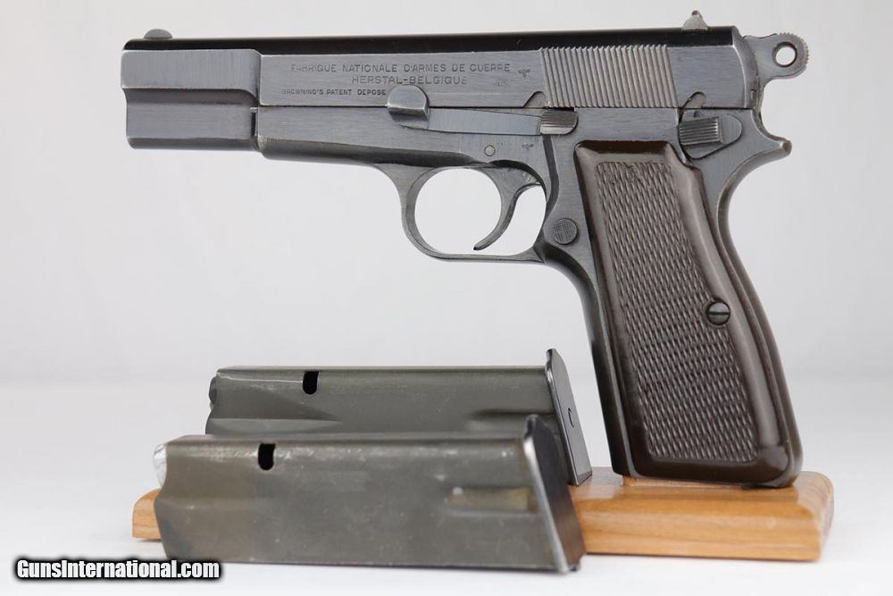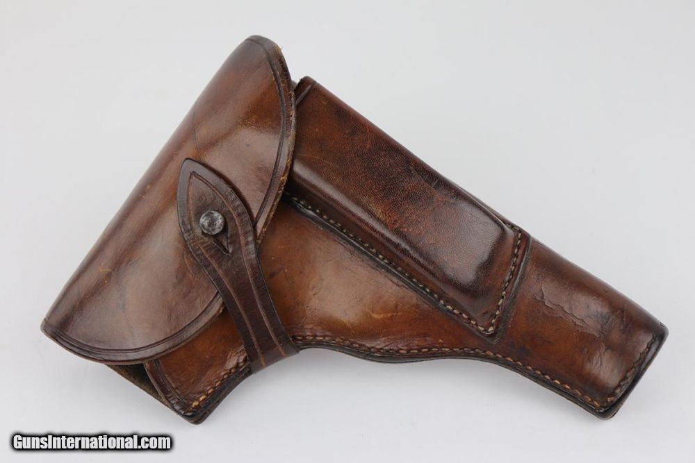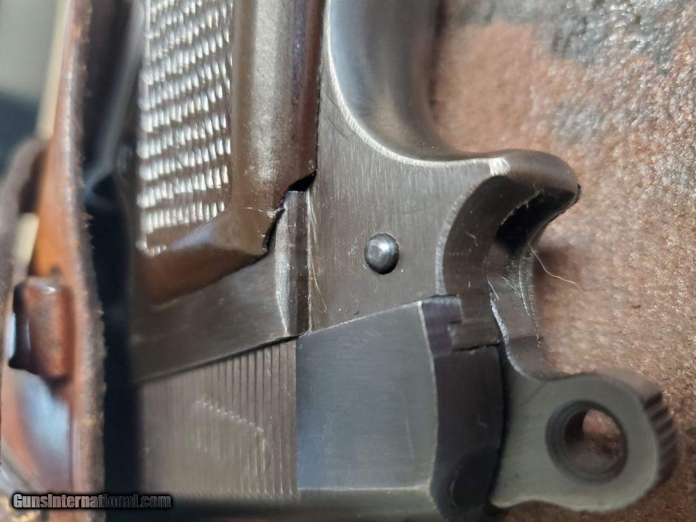Description: This is an excellent and complete FN Browning Hi Power that was issued to the German Army. The pistol is all matching and correct with 97-98% military blue remaining, showing just some minor thinning on the straps. Very nice brown plastic grips, though the right panel has a small chip in the corner. Strong, shiny bore. Two wartime but unmarked magazines. The rig is topped off by a very interesting holster. It appears a previous owner modified a Radom holster to accommodate the Hi Power. It's unmarked but in terrific condition. SOLD Curio/Relic: Yes Manufacturer: FN Browning Model: Hi Power Serial Number: 32537b Caliber Info: 9mm Bore: 9/10 Condition: 97-98% Manufacture Date: 1940s |