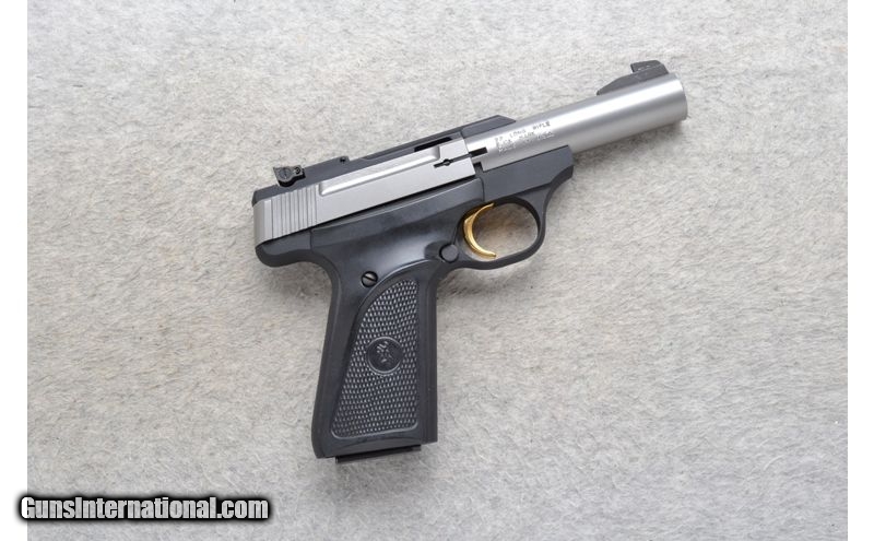 Description: This Browning Model Buck Mark is a right hand semi-auto pistol in .22 Long Rifle Cal. It has a 4 inch stainless steel target bull barrel with a rear serrated slide.The golden trigger is grooved. A blade front and adjustable notch rear sight. The grip is a checkered black rubber. .22 Long Rifle SOLD Chambers: Semi-Auto 10 round magazine. Metal Condition: Excellent. Bore Condition: Excellent. Barrels: 4 inch stainless steel target bull barrel with a rear serrated slide. Triggers: Grooved. Golden. Weight: 32 oz. Sights: Raised blade front. Adjustable notch rear. Item Location: Richfield, WI |
