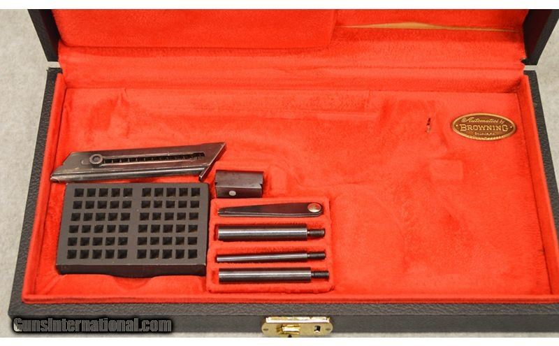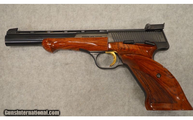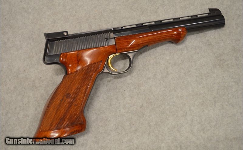 Description: A beautiful vintage competition 22LR, this Browning Medalist is in excellent condition for its age. This firearm has been well maintained, with 90%+ condition on the metal, with no signs of rust. Rifling is crisp, and the bluing is deep, dark, and shiny. The wood does show signs of finish wear, most notably along the edge of the thumb shelf, with an overall condition of 80%. Included with the firearm is an original presentation box, complete with all original tools and accessories, including two 10-round magazines. A brass nameplate inscribed "Lindy 1968" has been riveted to the outside of the display case. .22 Long Rifle SOLD Chambers: 22LR Metal Condition: 95% Wood Condition: 90% Barrels: 7 Weight: 2 Lbs 10 Oz. Sights: Competition style adjustable sights Item Location: Avon, OH |