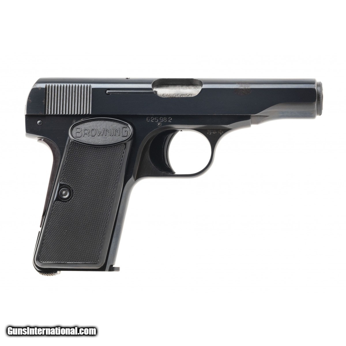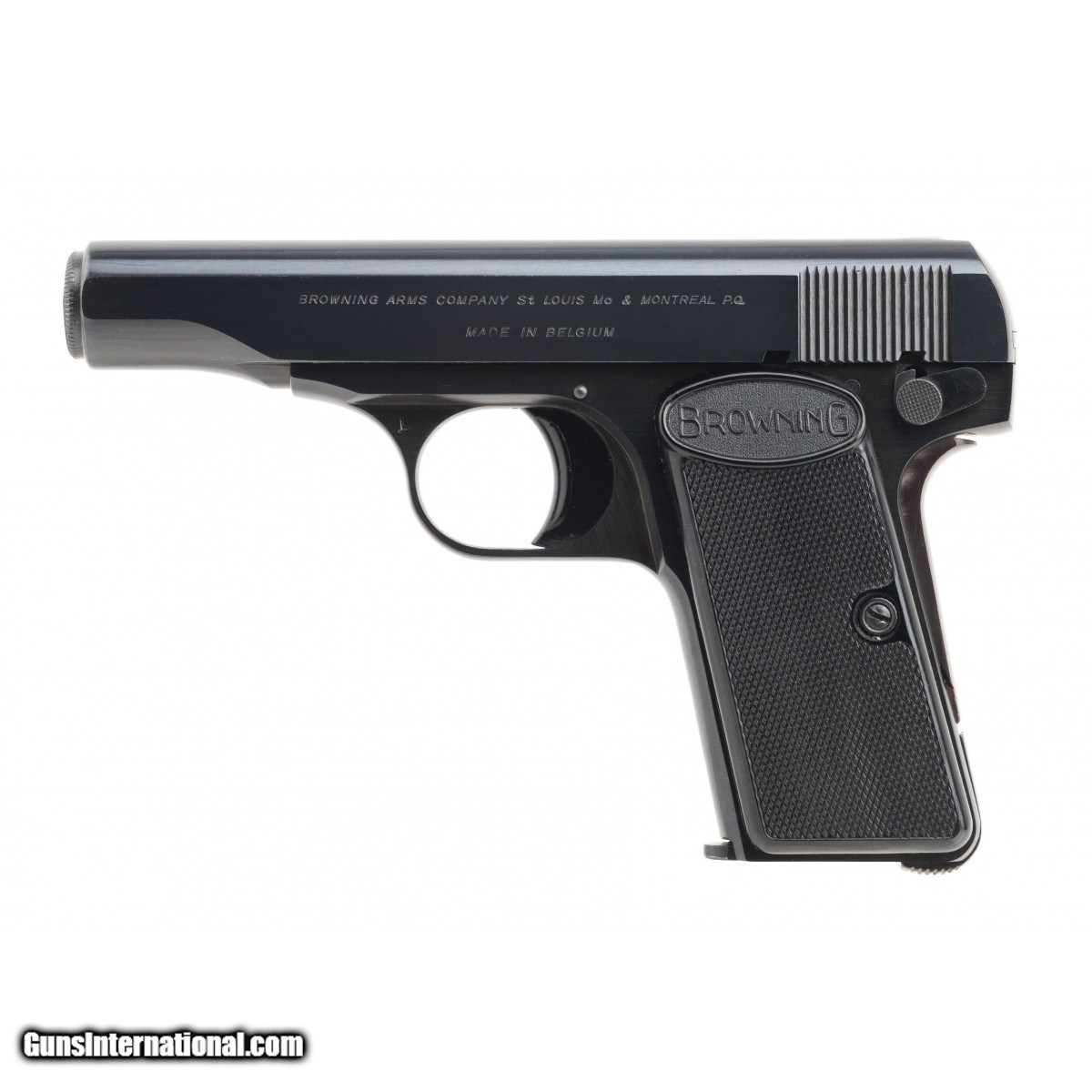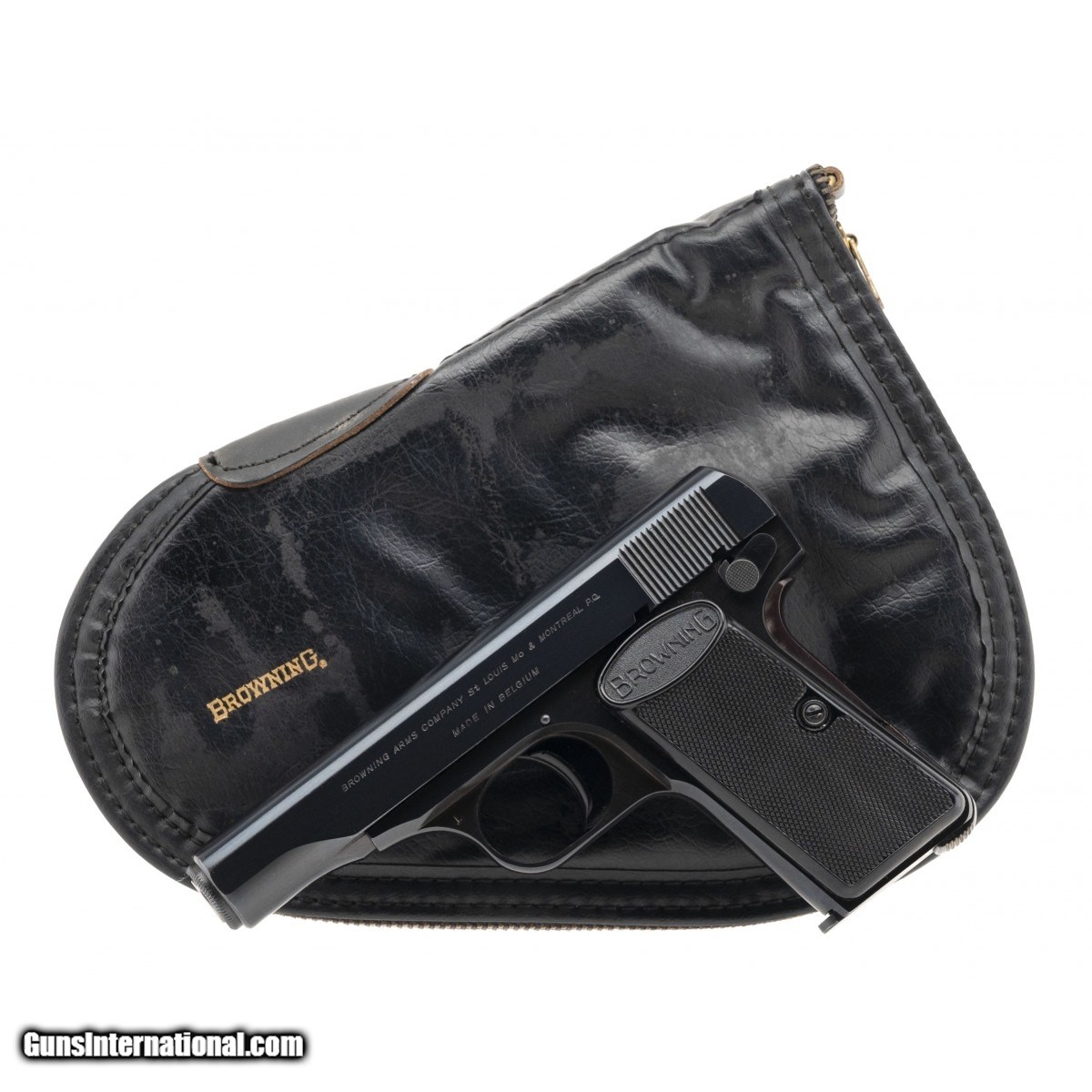 Description: " Post-war Belgian made pocket auto, 1960's vintage. Bore and action are excellent. Has a small blemish on the slide, otherwise very nice condition. Comes with Browning pouch. SOLD Curio/Relic: Yes |