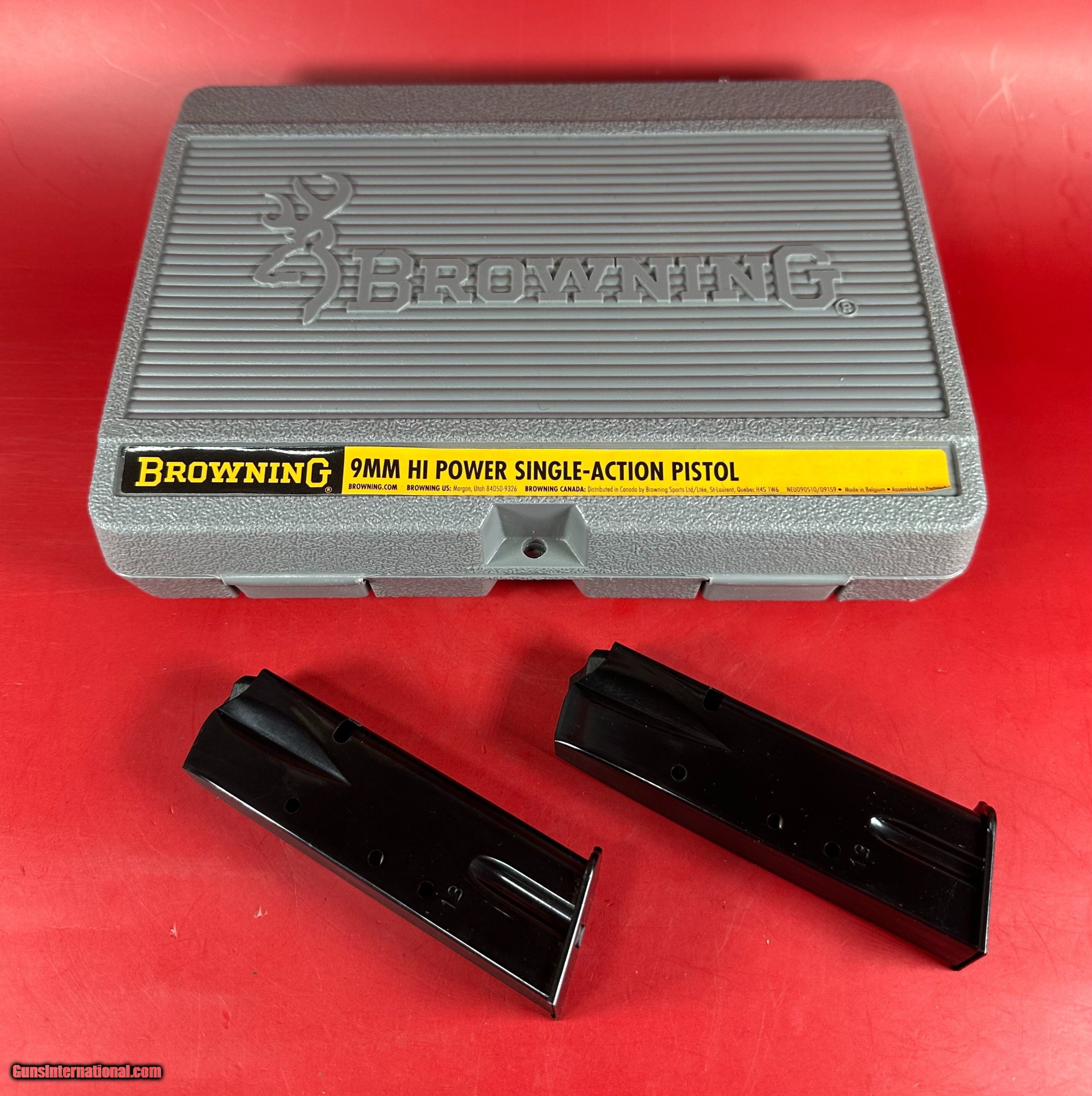 Description: For sale 2009 Belgium made Browning Hi Power (Hi-Power, High Power). John Browning’s finest creation. 4.7" barrel. Excellent condition. Metal is 99+%. Barrel is excellent. Plastic grips 99+%. Sale includes 2 original magazines, manual and other factory paperwork, original box, serialized to the gun, safety lock. Also, it comes with factory spent shells, for the states where required. This gun looks like new and will be a great addition to any collection. Features include :