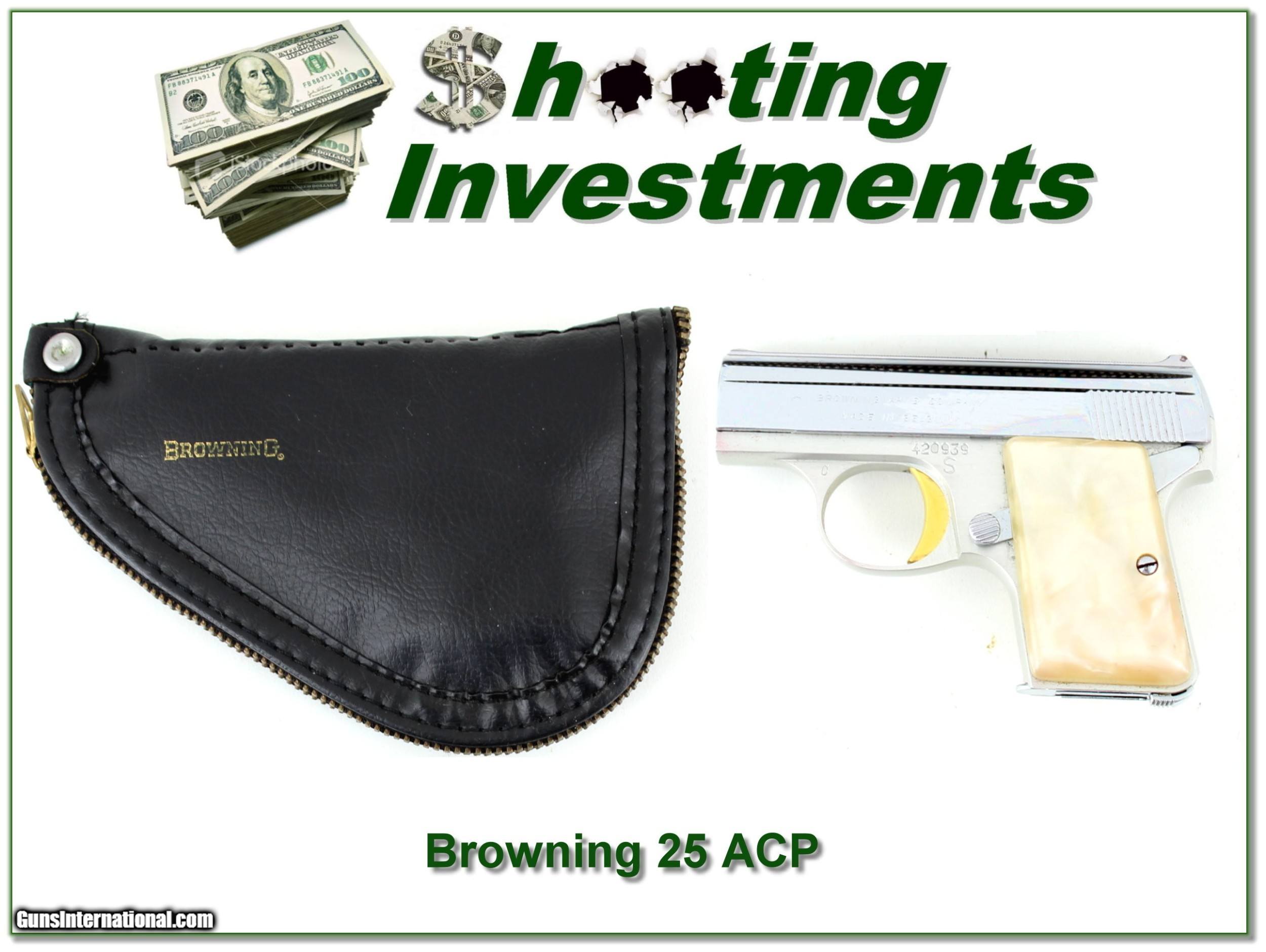 Description: This Baby Browning was made in Belgium in 1968. It is the Baby 25 with nickel platting and pearl grips. It is in top collector condition and if fired I can’t tell! It comes as seen in factory pouch! These continue to increase in value year over year and haven’t been made since 1969. It is a Shooting Investment. Shipping with insurance is $39. Please email me with any questions or larger pictures. (Consign your quality firearms with Shooting Investments for only 12%! Let me know if you have any you would like to sell!) 20-1333 Payment: Payment is by Money Order, Cashier’s Check or Personal Check. I can now also accept Credit Cards (MasterCard, Visa, Discover & American Express) with a 3% convenience fee. Shipping: The shipping charge will be listed in each description. It is $39 for most firearms. Some heavy guns or those insured for over $2000 will be higher. Shipments to Alaska and Hawaii are higher because air shipment is required. Most firearms are shipped on Tuesday and Thursday and usually in 5 days of receipt of payment. We package all shipments carefully and insure them. Optics are shipped Priority Mail and most other non-firearm shipments are shipped First Class. Returns: Our return policy is simple. If for any reason you are not pleased with your purchase, you may return your item for a full refund of purchase price. Ammunition cannot be returned. It is important to us that you are happy. Guns cannot be fired or dissembled before returning them and they must be returned in the same condition as received. Notification of a return must occur with-in 3 days of receipt at your dealer. Shipping, convenience and dealer fees are not refundable and are the responsibility of the buyer. Lay-a-way: If needed, we offer a 60 day lay-a-way option on most firearms. It is 1/3 now, 1/3 in 30 days and 1/3 in 60 days. Lay-a-way firearm sales are final and if not completed the first payment cannot be returned. Consigning your firearms with Shooting Investments: We will help you get top dollar for your firearms. While most local guns shops charge 20% or more, our fee is only 12% with a minimum of $75. At your local gun shop it might take months to sell. Selling on-line provides instant access to thousands of interested buyers. You won’t find any other on-line dealer willing to sell your firearms for only 12% or listing every gun on 3 separate s. Selling through an House typically costs the seller 15% and the buyer an addition 15% (so 30%) and you have to wait several months to sell and longer to receive funds. If properly priced, we will sell your firearms in a few weeks. Send us an email or give us a call and we’ll explain how easy it is for you to get top dollar. Trading: Trading for use is really just buying your gun to re-sell. If you have a gun you want to trade, please email a picture and we will let you know what we can give or it. You will always get more if we sell it for you on consignment. Help for California Buyers: We are happy to ship to California. It is the buyer’s responsibility to make sure any item you buy is legal in your state. We are also happy to help with your purchase of a firearm from someone other than us. If you see a gun you would like to buy but the seller can’t or won’t ship to California they can ship to use and we’ll then ship it to your California dealer. The cost for this service is only $30 + shipping. Let us know if we can help! SOLD |