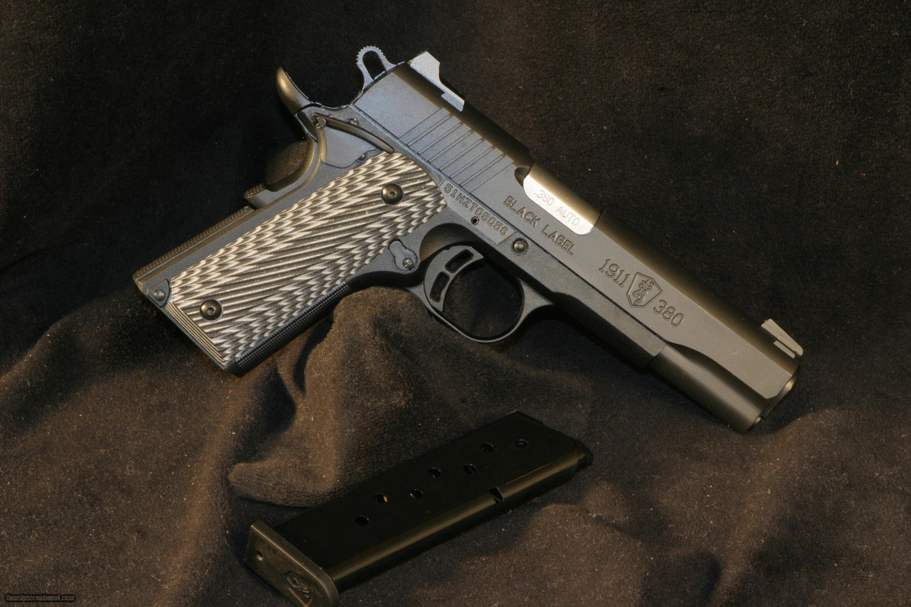 Description: NEW FROM BROWNING. ALL THE FEATURES IN A SMALL SCALE 1911 CHAMBERED FOR .380ACP. COMES WITH G10 GRIPS,NIGHT SIGHTS,AMBI-SAFETY ,SUPPLIED WITH TWO MAGS.The 1911-380 is 85% of the size of the original 1911 Barrel Length 4 1/4", Overall Length 7 1/2", Weight 18 oz, Magazine Capacity 8, Barrel Finish Matte, Receiver Finish Matte, Checkering Molded Receiver, Magazine Type, Single Stack SOLD |