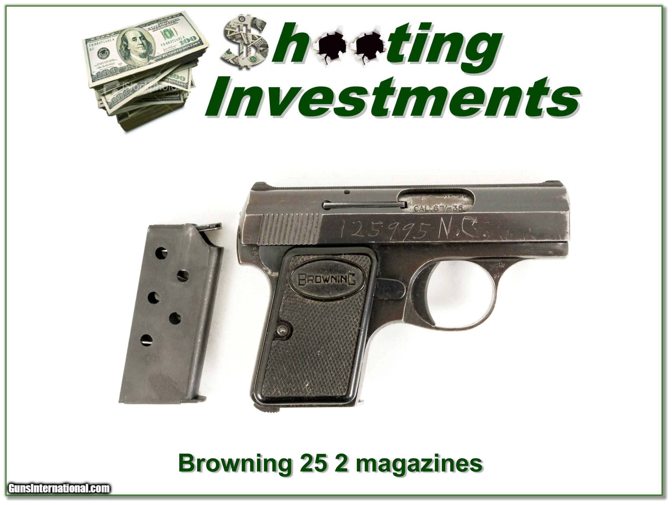 Description: This is a used Browning 25 25 auto. It comes with 2 magazines. There are some numbers on the left side…see pictures. I am selling this one on consignment and as such, lay-a-way can’t be used. It does of course have the standard 3-day inspection. Shipping and insurance is $35. Please email me with any questions or larger pictures. (I now consign quality firearms only 10%! Let me know if you have any you would like to sell!) 17-0813 Payment: Payment is by Money Order, Cashiers Check or Personal Check. I can now also accept MasterCard and Visa with a 3% convenience fee. PayPal can be used for some items but never firearms. Please let us know if you would like to pay via PayPal. Shipping: The shipping charge will be listed in each description. It is $35 for most guns. Some heavy guns or those insured for over $2000 will be higher. Shipments to Alaska and Hawaii are higher because air shipment is required. Most firearms are shipped within 5 days of receipt of payment. We prefer shipping at the beginning of the week to avoid firearms in transit over weekends. We package all shipments carefully and insure them for the full purchase price, rounded up to the next $100. In the unlikely event that damage occurs, it is important that you save all packaging material for the claims process. Optics are shipped Priority Mail and most other non-firearm shipments are shipped First Class. Returns: Our return policy is simple. If for any reason you are not pleased with your purchase, you may return your item for a refund. The only exception is ammunition, it cannot be returned. It is important to us that you are happy. Guns cannot be fired or dissembled before returning them and must be returned in the same condition as received. Notification of a return must occur with-in 3 days of receipt at your dealer. Shipping, convenience and dealer fees are not refundable and are the responsibility of the buyer. Lay-a-way: If needed, we offer a 60 day lay-a-way option on most firearms. It is 1/3 now, 1/3 in 30 days and 1/3 in 60 days. Lay-a-way firearm sales are final. Consigning your firearms with Shooting Investments: We will help you get top dollar for your firearms. While most local guns shops charge 20% or more, our fee is only 10% with a minimum of $50. At your local gun shop it might take months to sell. Selling on-line provides instant access to thousands of interested buyers. You won’t find any other on-line dealer willing to sell your firearms for only 10% or listing every gun on 4 separate s. Selling through an House typically costs the seller 15% and the buyer an addition 15% (so 30%) and you have to wait several months to sell and longer to receive funds. If properly priced, we will sell your firearms in a week or two. Send us an email or give us a call and we’ll explain how easy it is for you to get top dollar. Trading: We collect guns and usually just trade for guns we want to add to our collections. We often sell guns for others wanting to purchase one of ours. We find this the most fair to both of us. Our Commission is only 10% and we hold the gun you want until yours sells. Please contact us if you want to sell one of yours to buy one of ours. Help for California Buyers: We are happy to ship to California. It is the buyer’s responsibility to make sure any item you buy is legal in your state. We are also happy to help with your purchase of a firearm from someone other than us. If you see a gun you would like to buy but the seller can’t or won’t ship to California we can help. You buy the gun and have it shipped to us. We’ll then ship it to your California dealer. The cost for this service is only $30 + shipping. Let me know if we can help! SOLD |