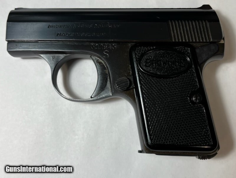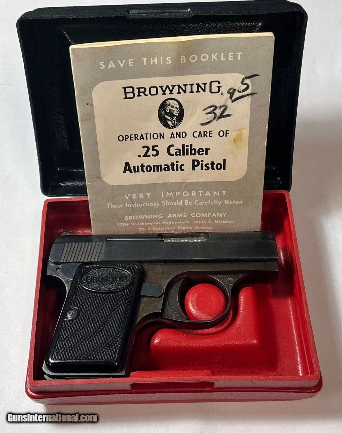 Description: Guns Listing ID: 498733 This is a Browning \"Baby Browning\" in .25 acp with a 6 round magazine manufactured in 1964. This has original box and owners manual. SOLD Manufacturer: BROWNING Model: "BABY BROWNING Caliber Info: 25 ACP Condition: Used - Non-Certified Barrels: 2.25 BARREL Finish: BLUE |