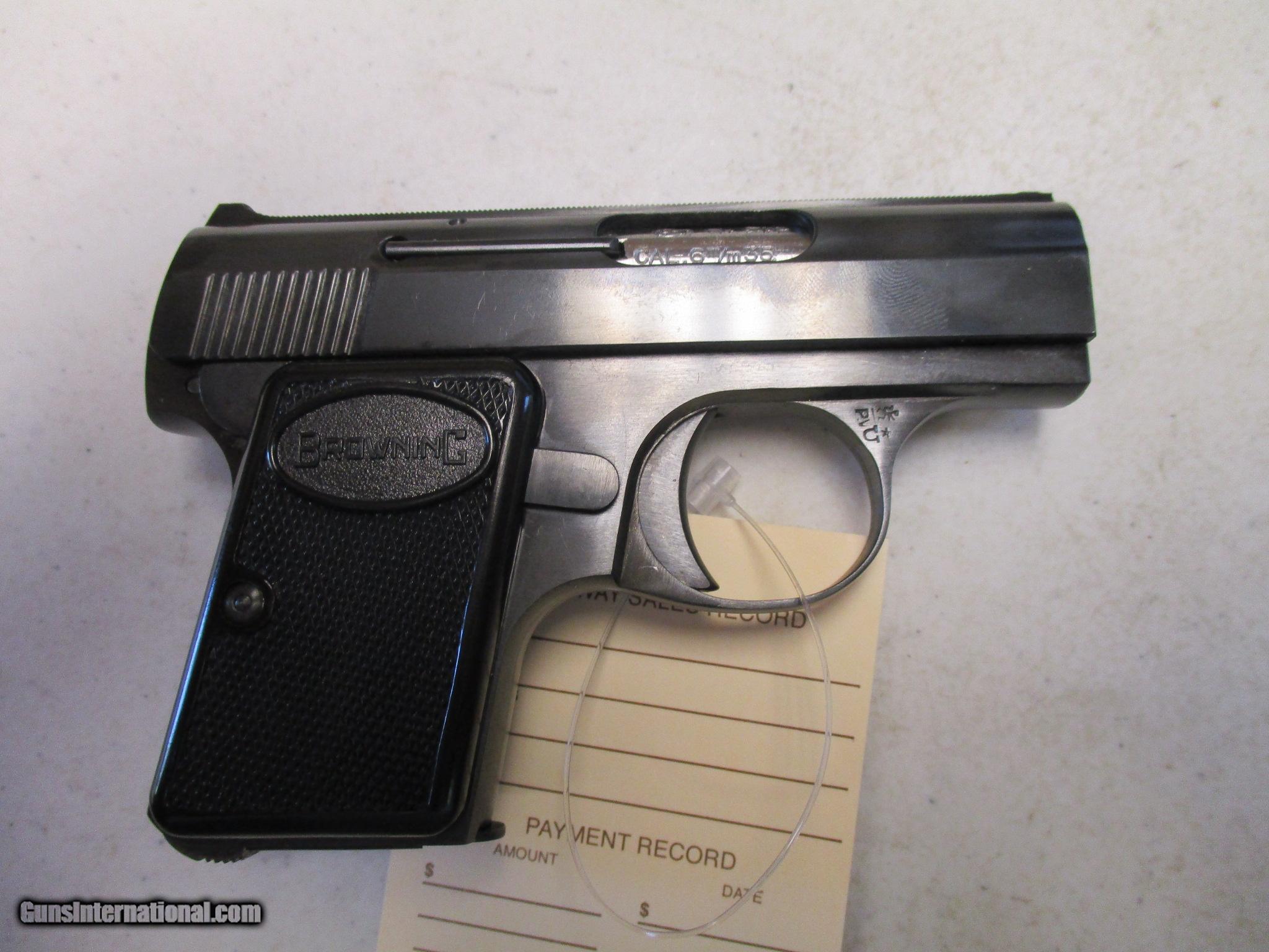 Description: Belgium Browning, Vest model, Baby FN. SN is 3019xx. Factory finish, nice and clean. 6.35mm (25 ACP). Nice clean gun with one factory mag. Email me if you would like these pics sent to you, they will come through bigger and better than on the listing page here. Email me with any Beretta, Benelli, Sako, Franchi, Stoeger, or Uberti needs. Email me with any questions. I am a store front dealer, and I will close s if the gun sells locally. Once ahas reached my reserve, I will pull it from my shelves. Please check your local laws to confirm it is legal to own in your state! Buyer pays $25 shipping and insurance to your FFL, in the lower 48. AK, HI or PR is extra. I will ship to California, NO PROBLEM! All my guns come with a non firing, 3 day unconditional return privilege, from the day UPS delivers to your dealer. Buyer pays shipping both ways if the gun comes back. I can add a new hard case by PLANO for secure shipping for $25 if the buyer wishes (highly recommended, cheap insurance, really helps keep the UPS monster from eating my guns!). No sales tax on guns ship out of Kansas, guns sold in Kansas are subject to Kansas sales tax. I am a licensed FFL, and will include a copy of my FFL with the gun for your dealers records. I will ship to a C&R if the gun is eligible (you look it up!). I will ship to California, but you need to confirm the gun is legal where you are, California or other. I am always looking for good clean, old original Winchesters to buy, consign, or trade, especially pre '64's model 70's and model 54's. WE ALSO TRADE FOR CLASSIC CARS AND TRUCKS! I will leave feedback as soon as the buyer leaves feedback on me. Email me with any questions, and good luck! SOLD |