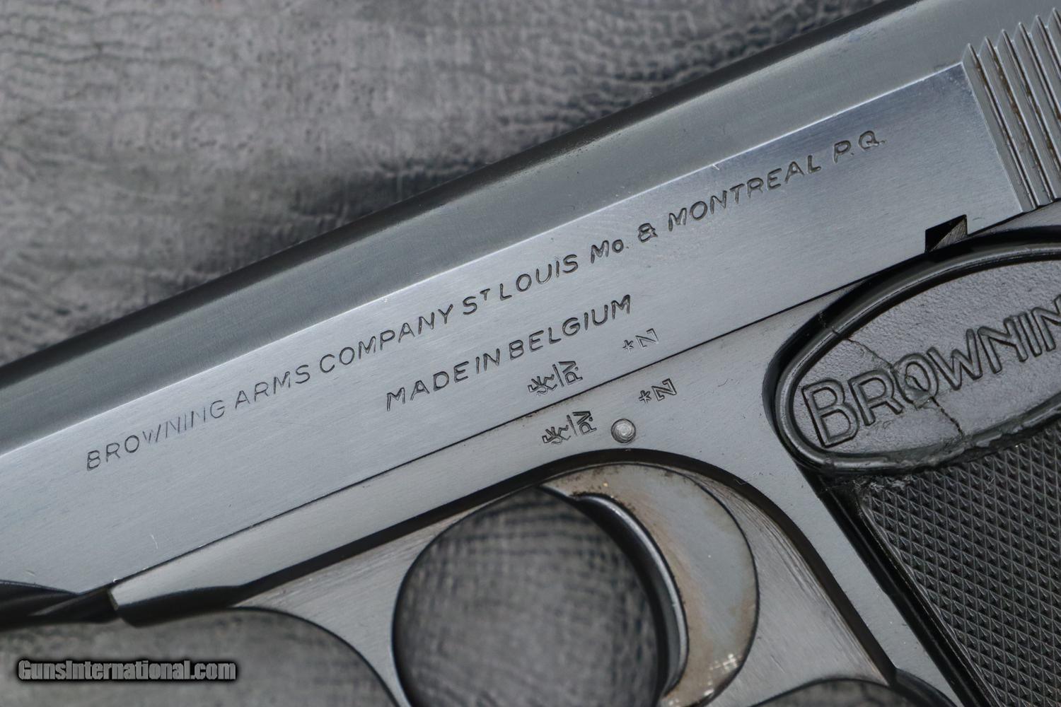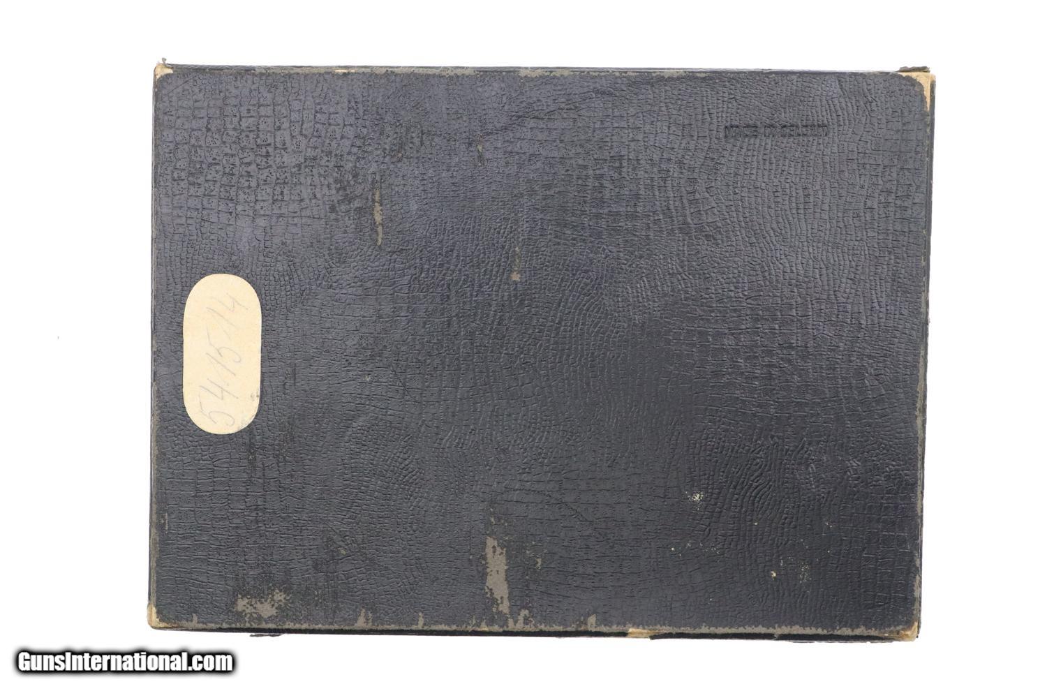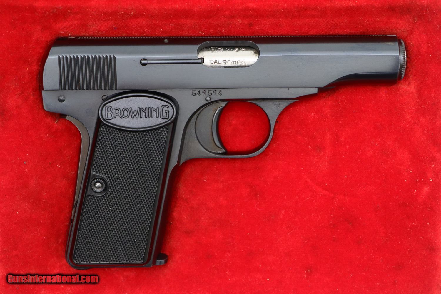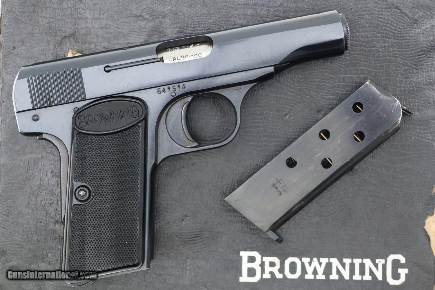 Description: Synopsis: Classic FN Browning 1910 Pistol, sometimes referenced as the 1955, the model used to shoot Archduke Franz Ferdinand, this example near new, excepting cracked grip, in factory display box. Description: Standard configuration FN 1910 pocket pistol, .380 ACP, a single action striker fired pistol, with fixed sights separated by a matted channel. Manufacturer reference and location on left side of slide, caliber marked on exposed chamber hood, full serial number on right side of frame, fitted with Browning logo black plastic grips, and correct FN marked magazine. Complete with factory red display case, lid marked Browning, with red interior recess for pistol, and matching serial number on bottom of case. Condition: Pistol is EXC+, with just a few tiny nicks on the left side of slide near the muzzle and hairline cracks on the left grip, near top, as carefully imaged. Mirror bore. Perfect manual mechanics. The box is G/VG with moderate shelf wear, peeling, and corner repairs. A classic and very nice looking FN 1910, whose appearance could be easily upgraded by replacing the left grip, replacements readily available. ~~Insured shipping fee of $45; most packages shipped using FedEx 2nd Day.~~ SOLD Curio/Relic: Yes Manufacturer: Browning Serial Number: 541514 Caliber Info: .380 ACP |