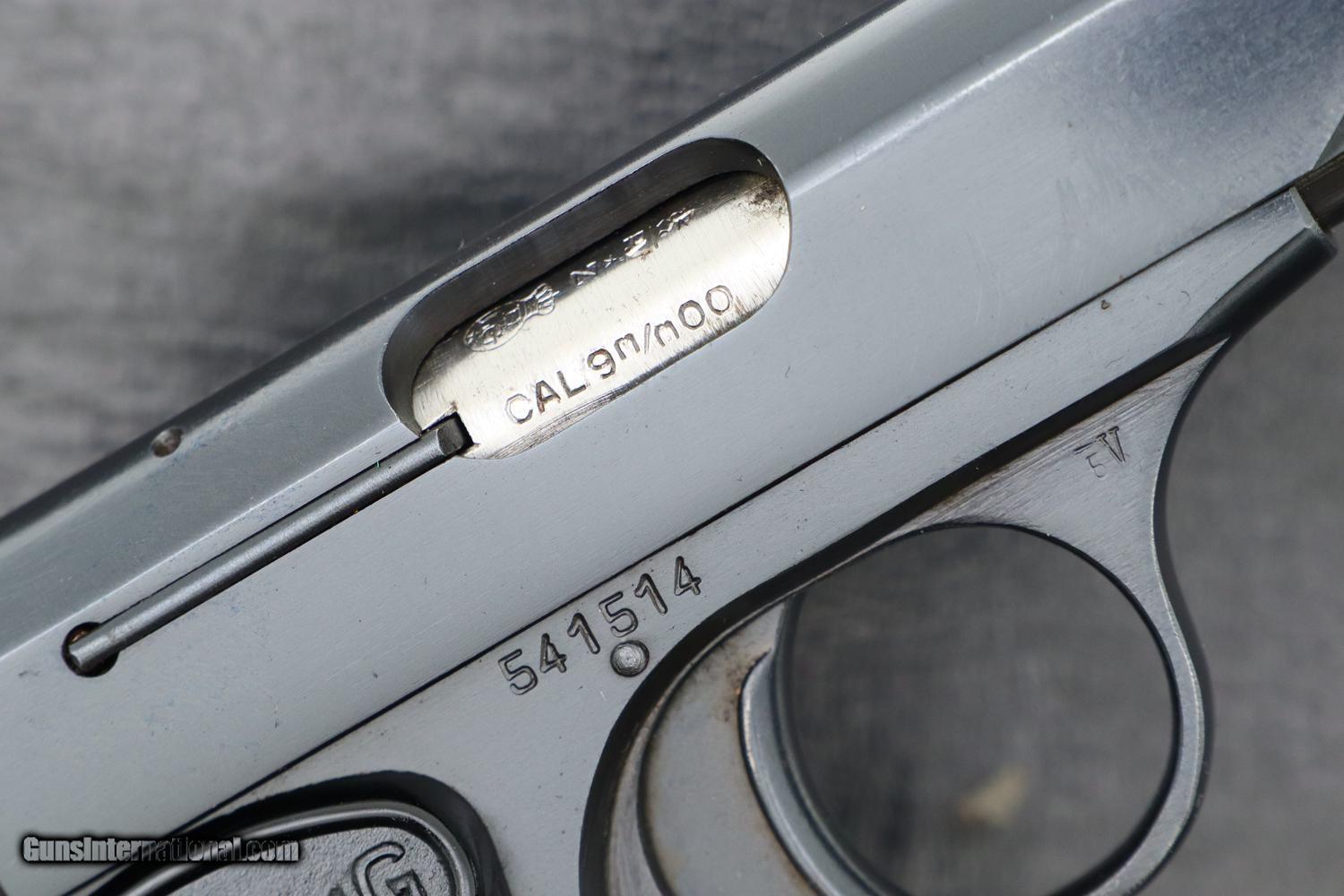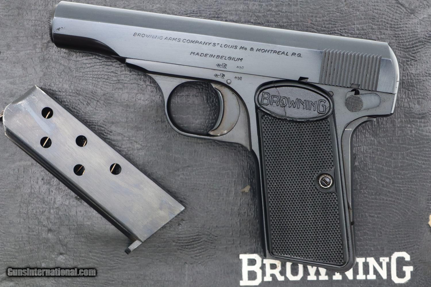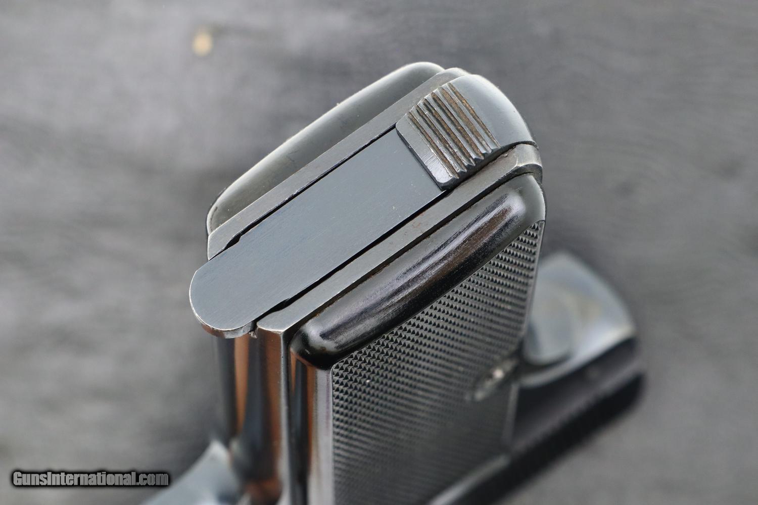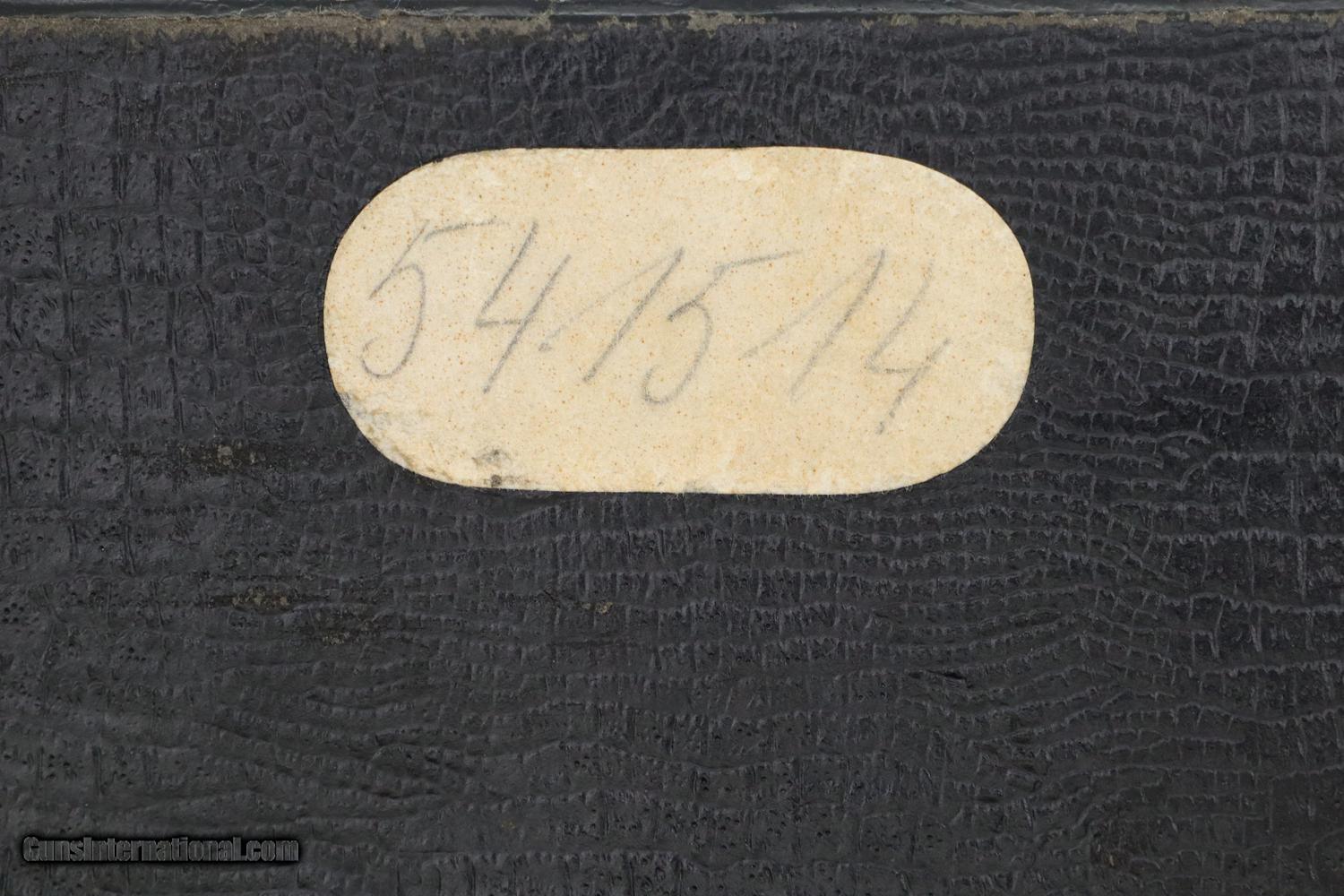 Description: Synopsis: Classic FN Browning 1910 Pistol, sometimes referenced as the 1955, the model used to shoot Archduke Franz Ferdinand, this example near new, excepting cracked grip, in factory display box. Description: Standard configuration FN 1910 pocket pistol, .380 ACP, a single action striker fired pistol, with fixed sights separated by a matted channel. Manufacturer reference and location on left side of slide, caliber marked on exposed chamber hood, full serial number on right side of frame, fitted with Browning logo black plastic grips, and correct FN marked magazine. Complete with factory red display case, lid marked Browning, with red interior recess for pistol, and matching serial number on bottom of case. Condition: Pistol is EXC+, with just a few tiny nicks on the left side of slide near the muzzle and hairline cracks on the left grip, near top, as carefully imaged. Mirror bore. Perfect manual mechanics. The box is G/VG with moderate shelf wear, peeling, and corner repairs. A classic and very nice looking FN 1910, whose appearance could be easily upgraded by replacing the left grip, replacements readily available. ~~Insured shipping fee of $45; most packages shipped using FedEx 2nd Day.~~ SOLD Curio/Relic: Yes Manufacturer: Browning Serial Number: 541514 Caliber Info: .380 ACP |