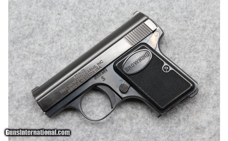 Description: Precision Small Arms PSA-25 w/Thumb Safety and Browning grip panels .25 ACP SOLD Barrels: 2 in Weight: 0.5 lb Sights: Black Front Post/V-Notch Rear Item Location: Farmington, UT |