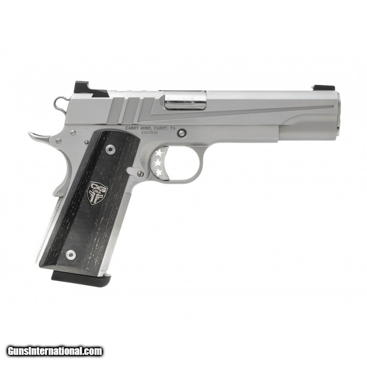 SN: CGC1510. Modern production, .45ACP with a 5"" barrel. Premium full size satin stainless 1911 with polished flats and 5"" crowned barrel, full length guide rod, extended safety, unique ""Gran Torino"" slide serration, white gold front bead dot sight. Overall excellent condition. Comes with box and two Cabot marked magazines.