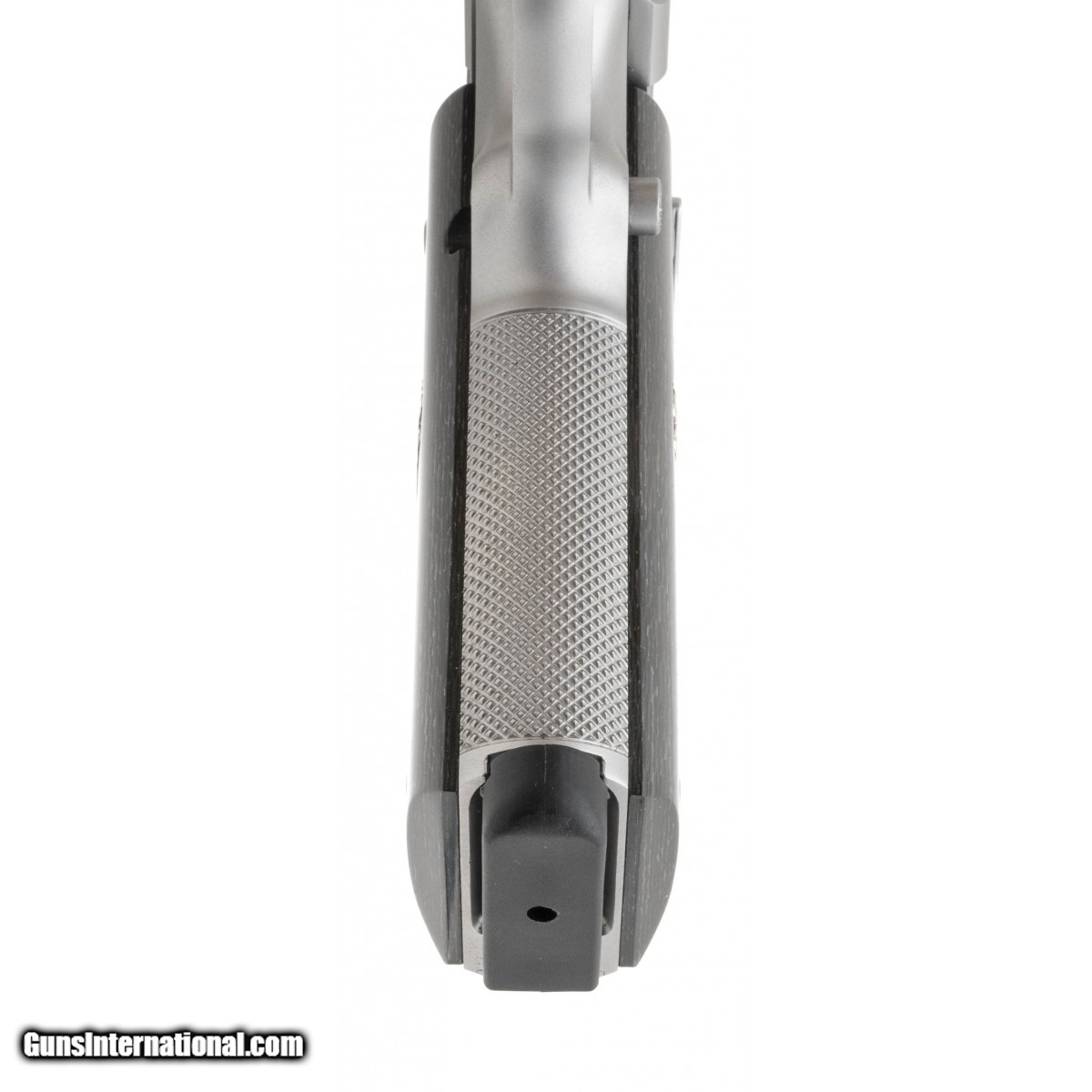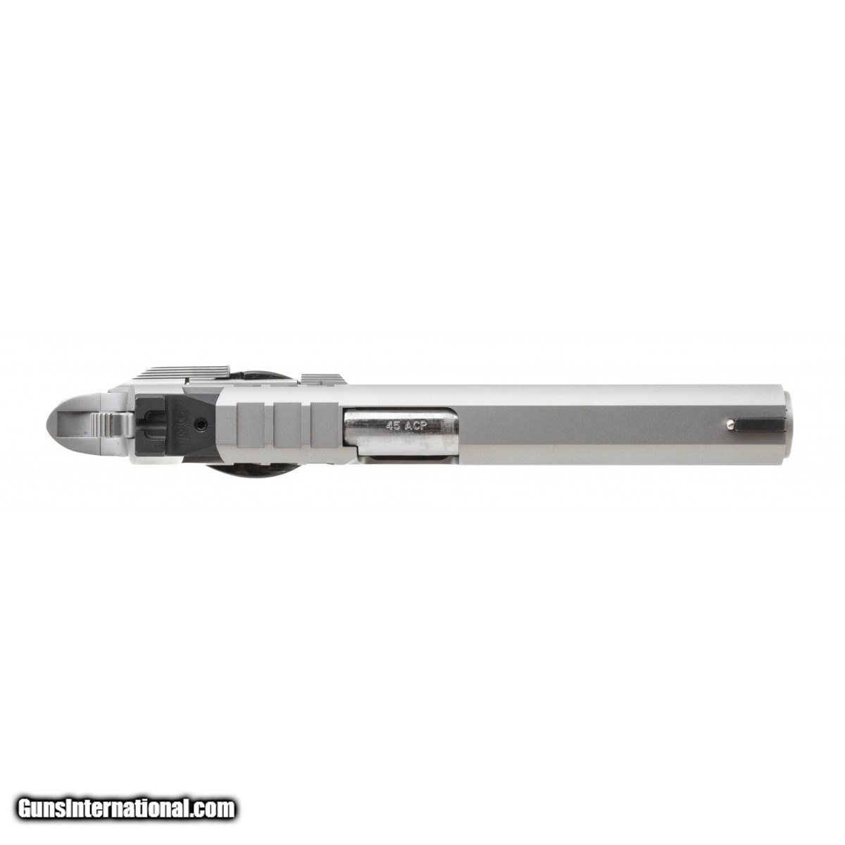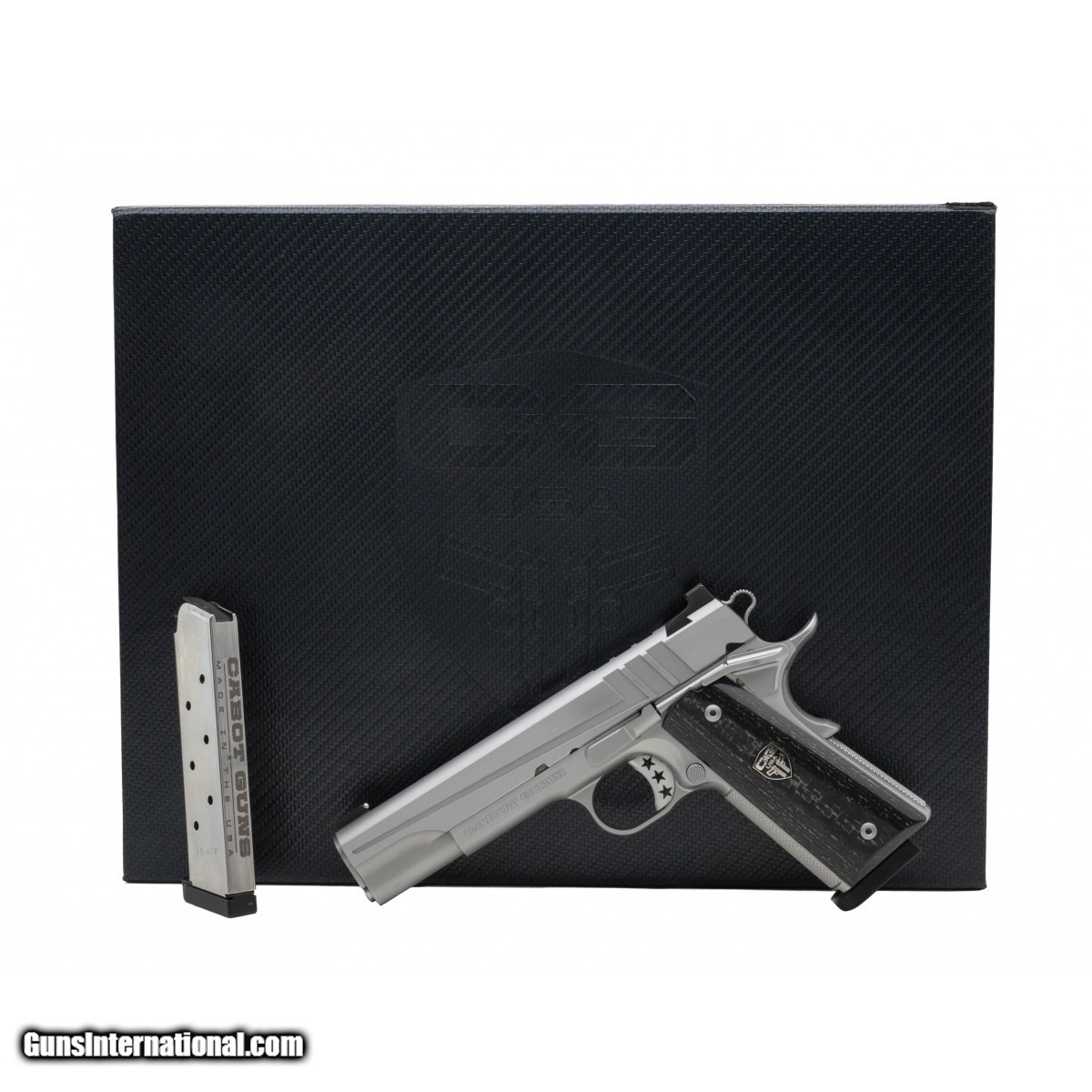 Description: " SN: CGC1510. Modern production, .45ACP with a 5"" barrel. Premium full size satin stainless 1911 with polished flats and 5"" crowned barrel, full length guide rod, extended safety, unique ""Gran Torino"" slide serration, white gold front bead dot sight. Overall excellent condition. Comes with box and two Cabot marked magazines. SOLD |