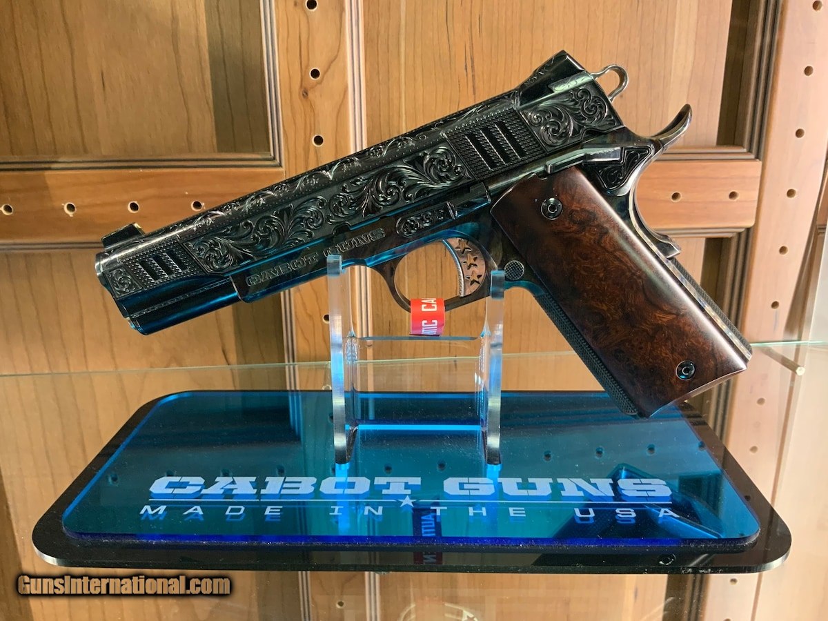 Description: Guns Listing ID: 396301 **New** Frame and slide constructed from USA sourced bill it. 416 stainless steel, proprietary hardening, traditional Matt stainless steel finish, CNC machining, EDM wire, EDM sink, CNC surface grinding,NM Grade barrel with reverse crown, hand polished feed ramp, Cabot Trinity stripe rear slide serrations, top slide serrations, countersunk and recessed slide stop notch, aluminum tri-star trigger, Cabot idiot scratch proof slide stop-billet, lowered and flared ejection port, rhombus cut front strap checkering, 24 LPI rhombus cut checkered main spring housing-billet, RH thumb safety, beveled mag well, Beavertail grip safety, Cabot high tactile G10 grips or Fibonacci G10 grips, Cabot barrel bushing, front sight-reverse dovetail style, rear sight-low mount fixed site black, 2- 8 round Cabot magazines, Cabot barrel bushing wrench, hand engraved slide, color case hardened frame SOLD Manufacturer: CABOT GUNS Model: One of a kind Engraved Jones Deluxe Caliber Info: .45 ACP Condition: Used - Non-Certified Barrels: 5 BARREL Finish: BLACK & BLUED |