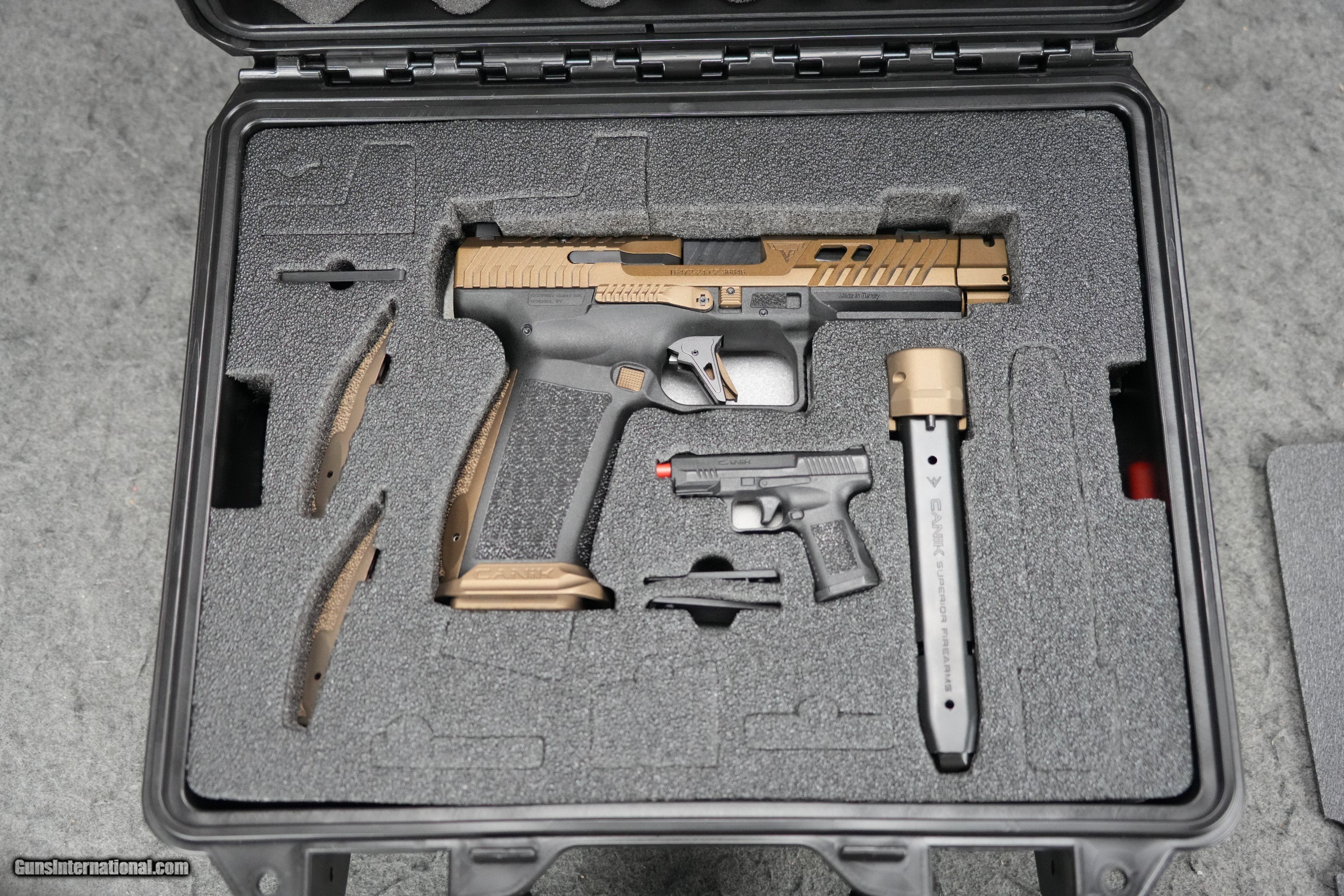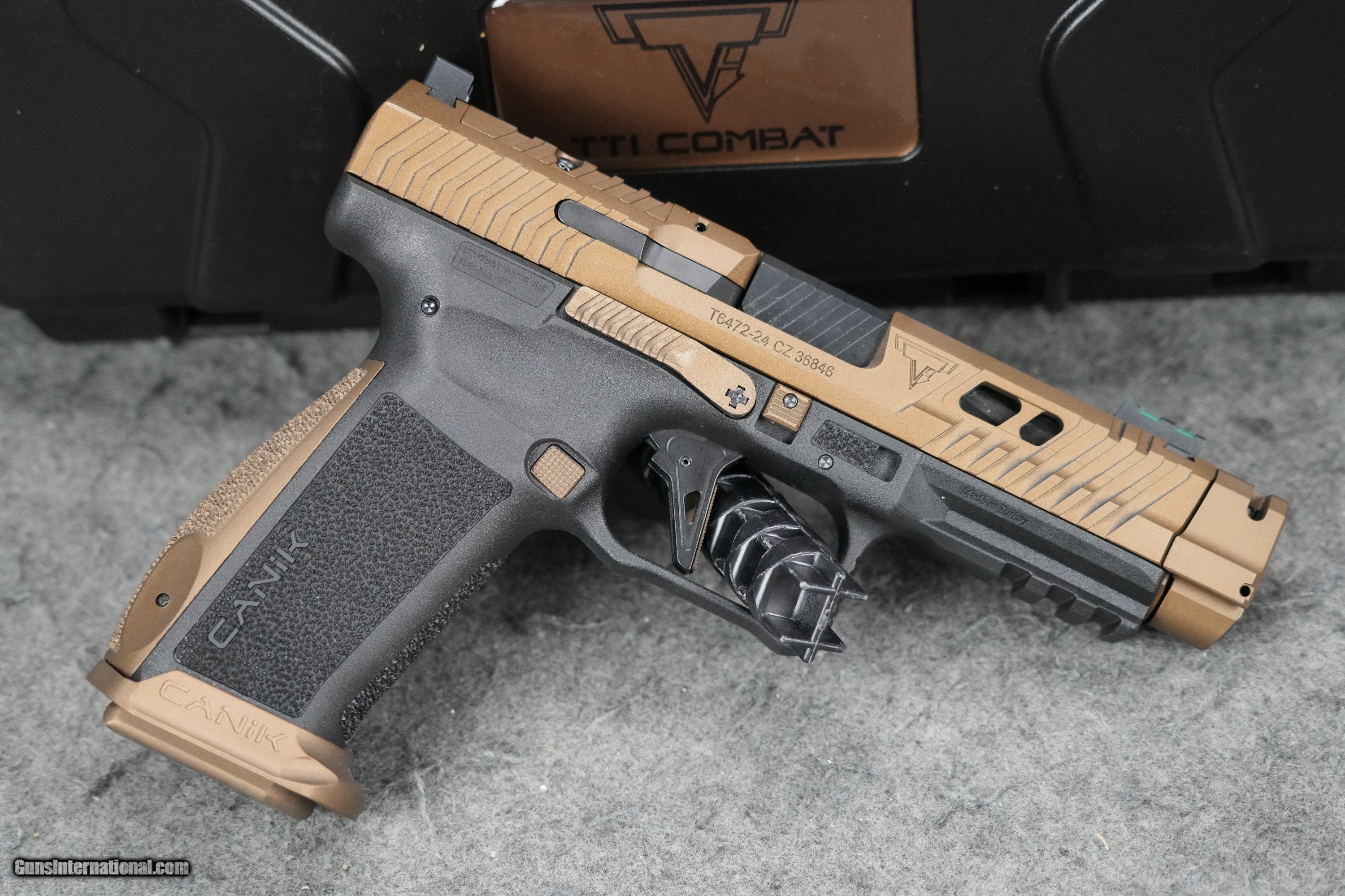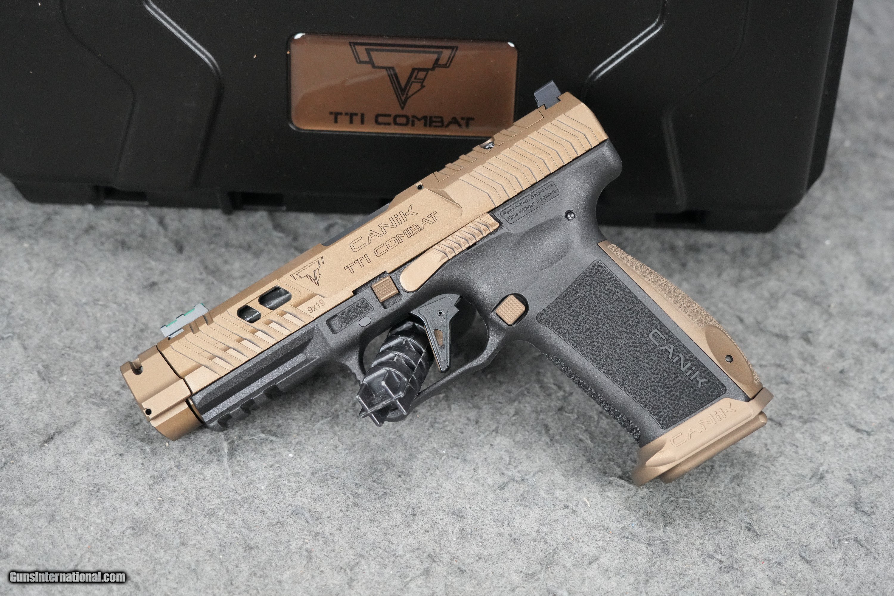 Description: ***BRAND NEW IN BOX*** ***The firearm pictured is the ACTUAL gun for sale! All images are of the ACTUAL item, unless specified otherwise. The item seen is the item you will receive. *** Taran Tactical Innovations and CANiK are proud to partner to bring you the CANiK TTI Combat. Built on a completely new polymer frame designed by Taran Butler, the TTI Combat brings a one-of-a-kind performance package to the CANiK lineup. This sleek design is built by the best, for the best, and includes all the features a world champion like Taran Butler needs for success. Both internally and externally, the TTI Combat delivers uniquely aggressive grip texturing, a ported and fluted barrrel, the first CANiK compensator, a diamond cut, flat-faces, 90 degree break trigger. TTI +3 magazine base pads, a newly designed slide release, an optics cut that even allows for a low profile seating of the MECANIK line of optics as well as the Trijicon SRO and many others, a custom holster, and travel hard case. To finish off this collectable package Canik has included a handsome collaboration coin to commemorate our lasting partnership. This partnership has created a truly superior firearms! Frame Finish: Black Embellishments: Lightening Cuts Front Sight: Fiber Optic Rear Sight: U-Notch Grips: Interchangeable Backstraps Features: Flared Magwell, Coin | Competition Style Holster | +3 Aluminum Base Pads Slide Finish: Bronze Slide Description: Bronze Weight: 29.3 oz. Finish: Black, Bronze Magazine Count: 2.00 Firing System: Striker Frame Material: Polymer Scope Base: 3 Plates Included Trigger: Aluminum Flat Face Magazine Type: Double Stack Magazine Barrel Configuration: Single Barrel Description: Ported Fluted Muzzle: Compensator Rifled Barrel: Yes Forend Rail: Picatinny Rail SOLD Handgun Caliber: 9x19mm Parabellum (9mm Luger, 9x19mm NATO) Manufacturer: Canik Model: TTI COMBAT Condition: BRAND NEW |