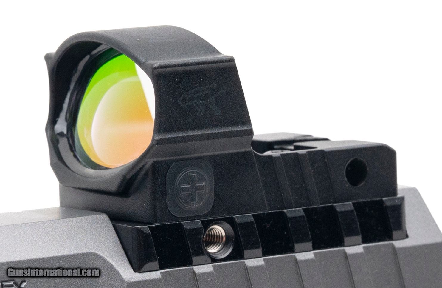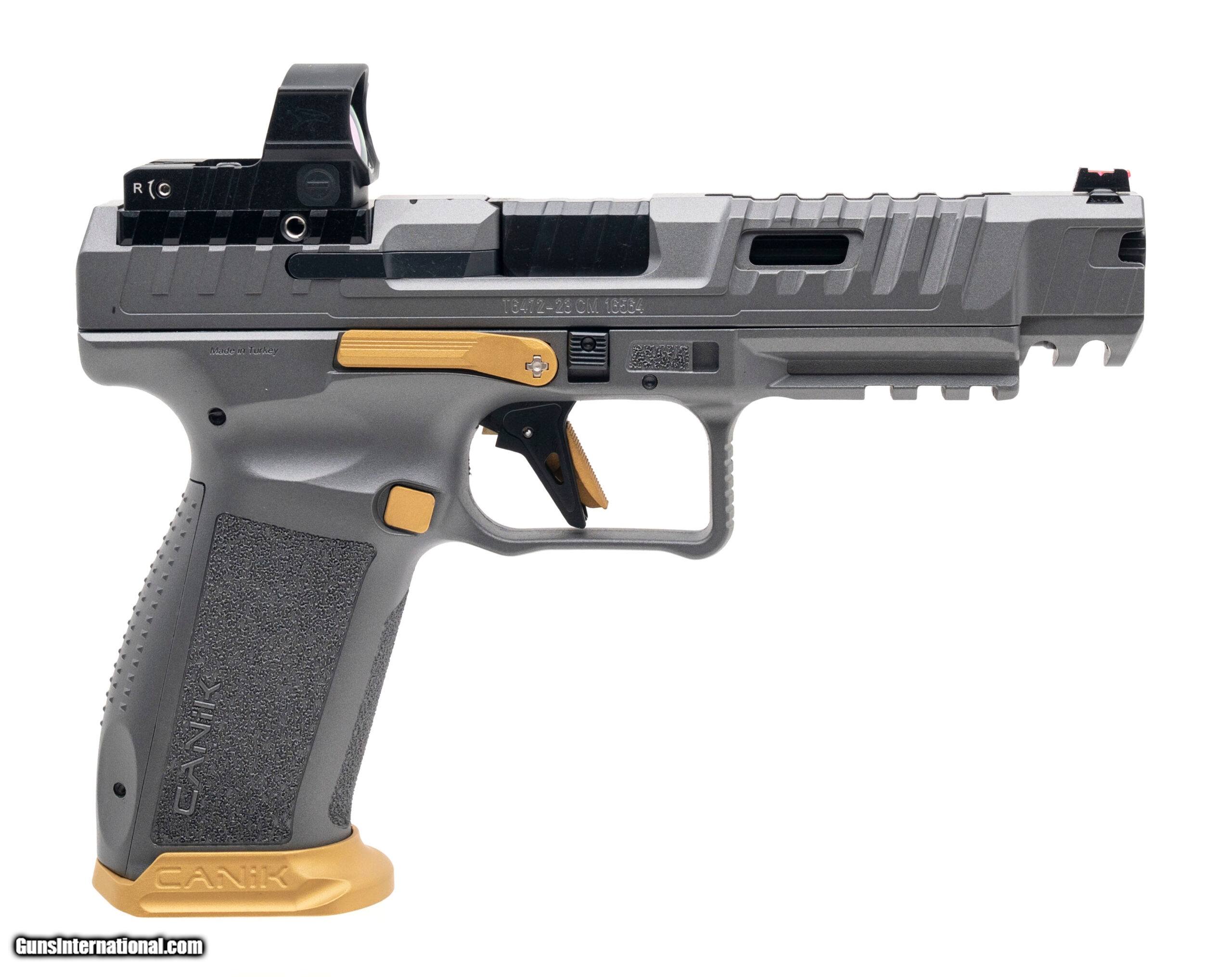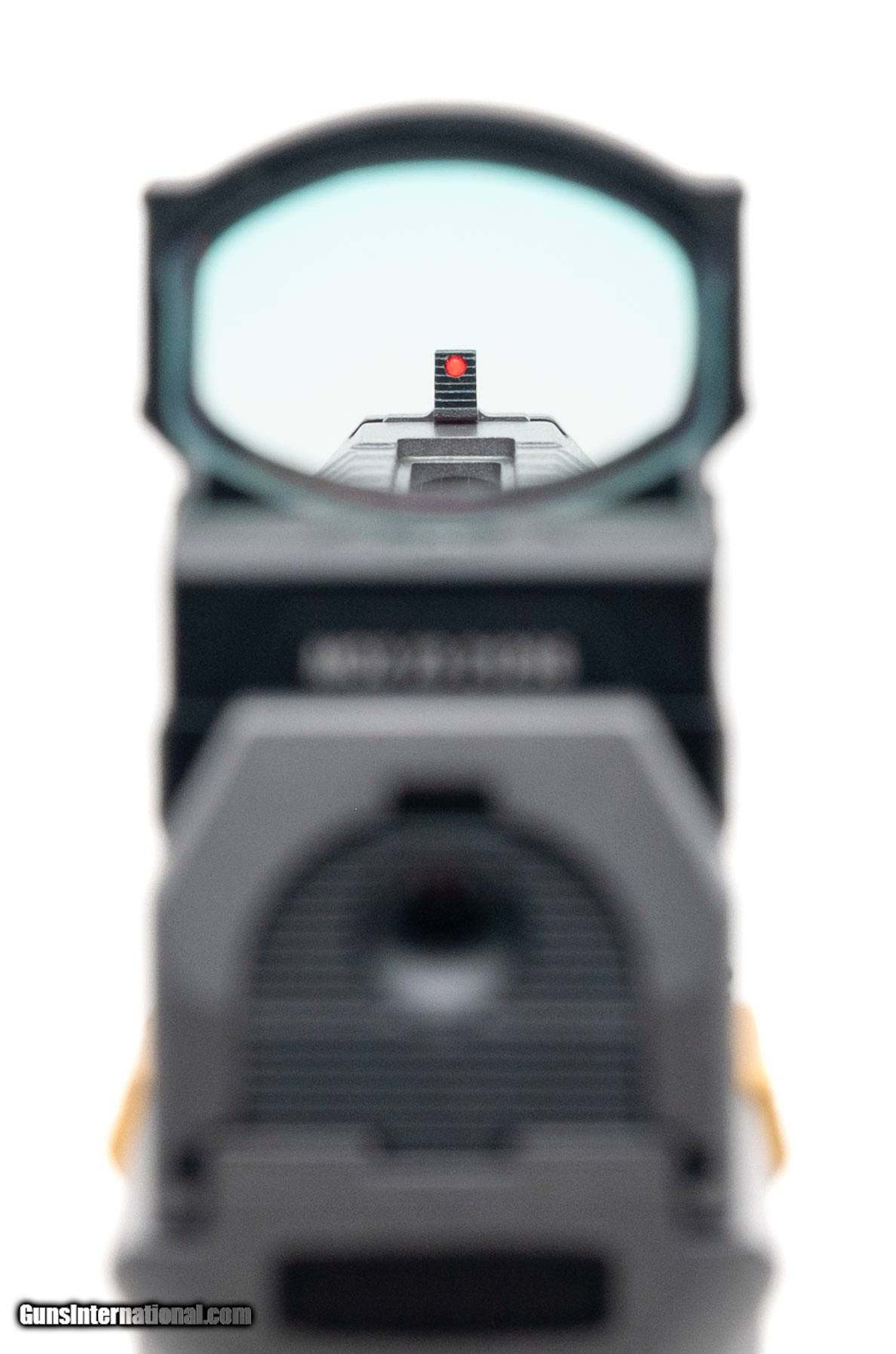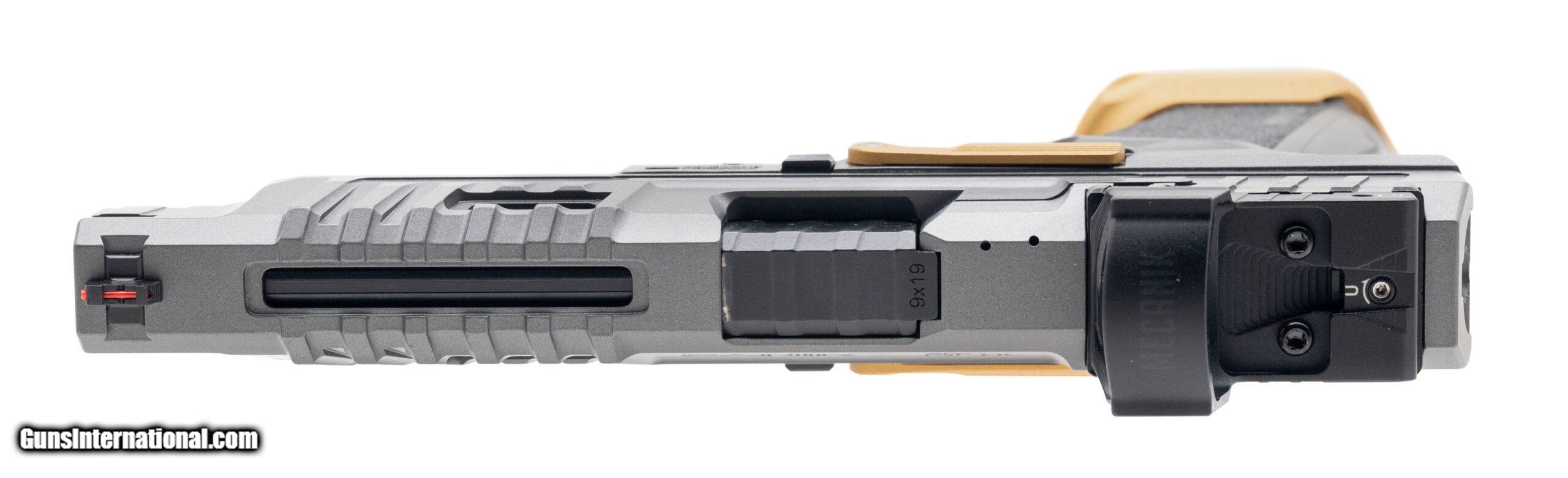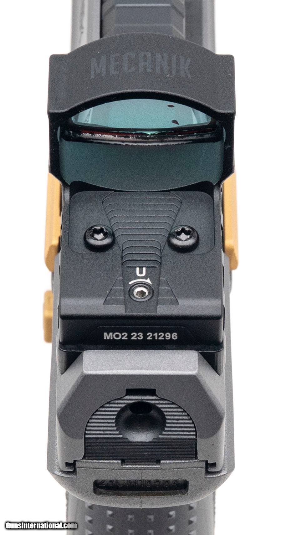 Description: "SN: T6472-23CM16564. Modern production, 9mm with a 5"" barrel. Bore is excellent. Full size striker-fired pistol with a MeCanik MO2 red dot optic, co-witnessed fiber-optic front sight, lightening cut slide, accessory rail, ambidextrous slide release, flat faced trigger, flared magwell, gray matte finish w/gold accents, and gray polymer frame. Includes an additional magazine, original holster, and original case. Overall condition is excellent. SOLD |