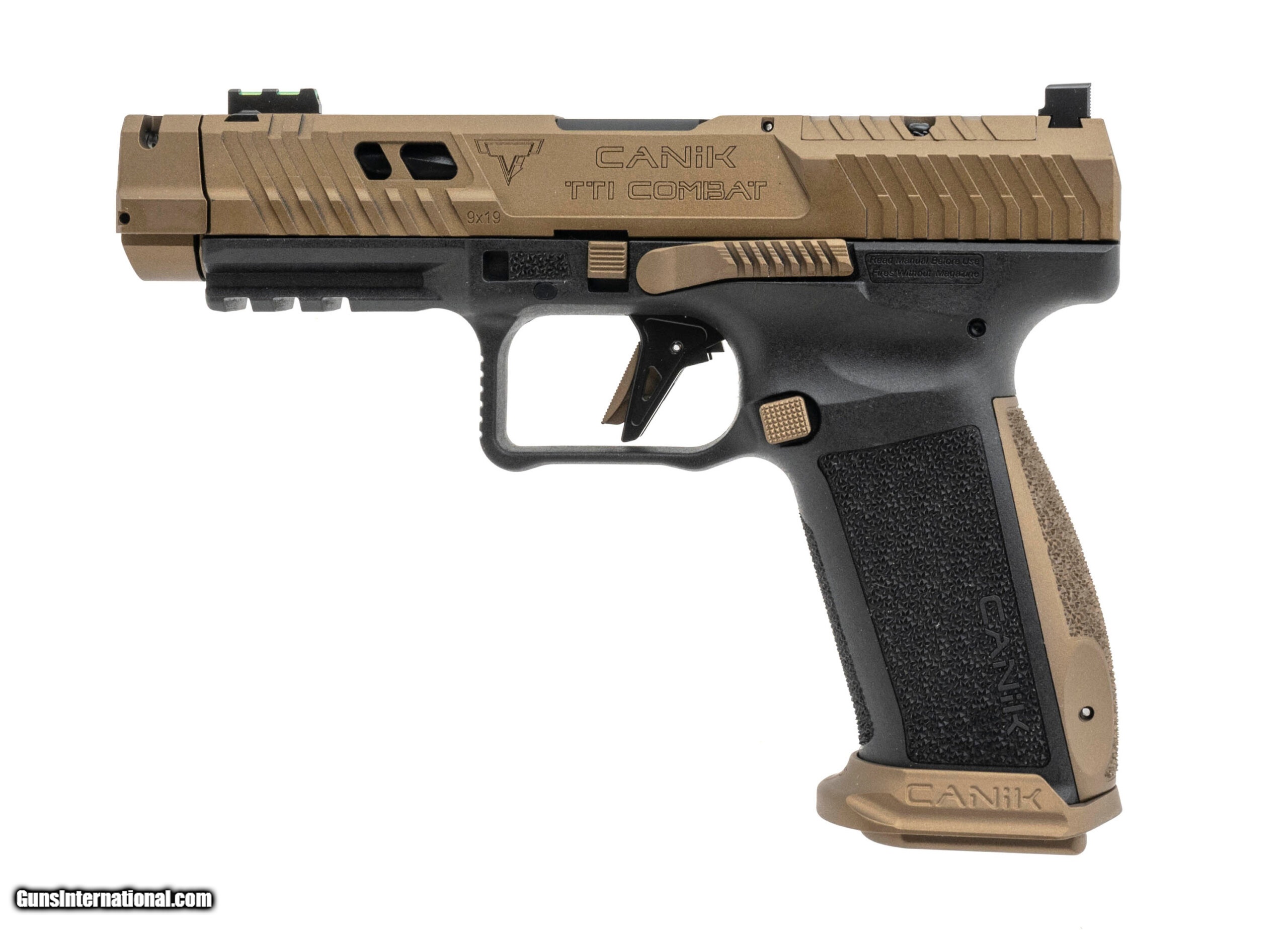 Description: "Canik TTI Combat Pistol. 9mm with a 4.6"" spiral fluted barrel. Semi-automatic pistol with a black polymer frame and Taran Tactical Innovations bronze finish. New. UPC: 787450911321 (STOCK PHOTO) SOLD |