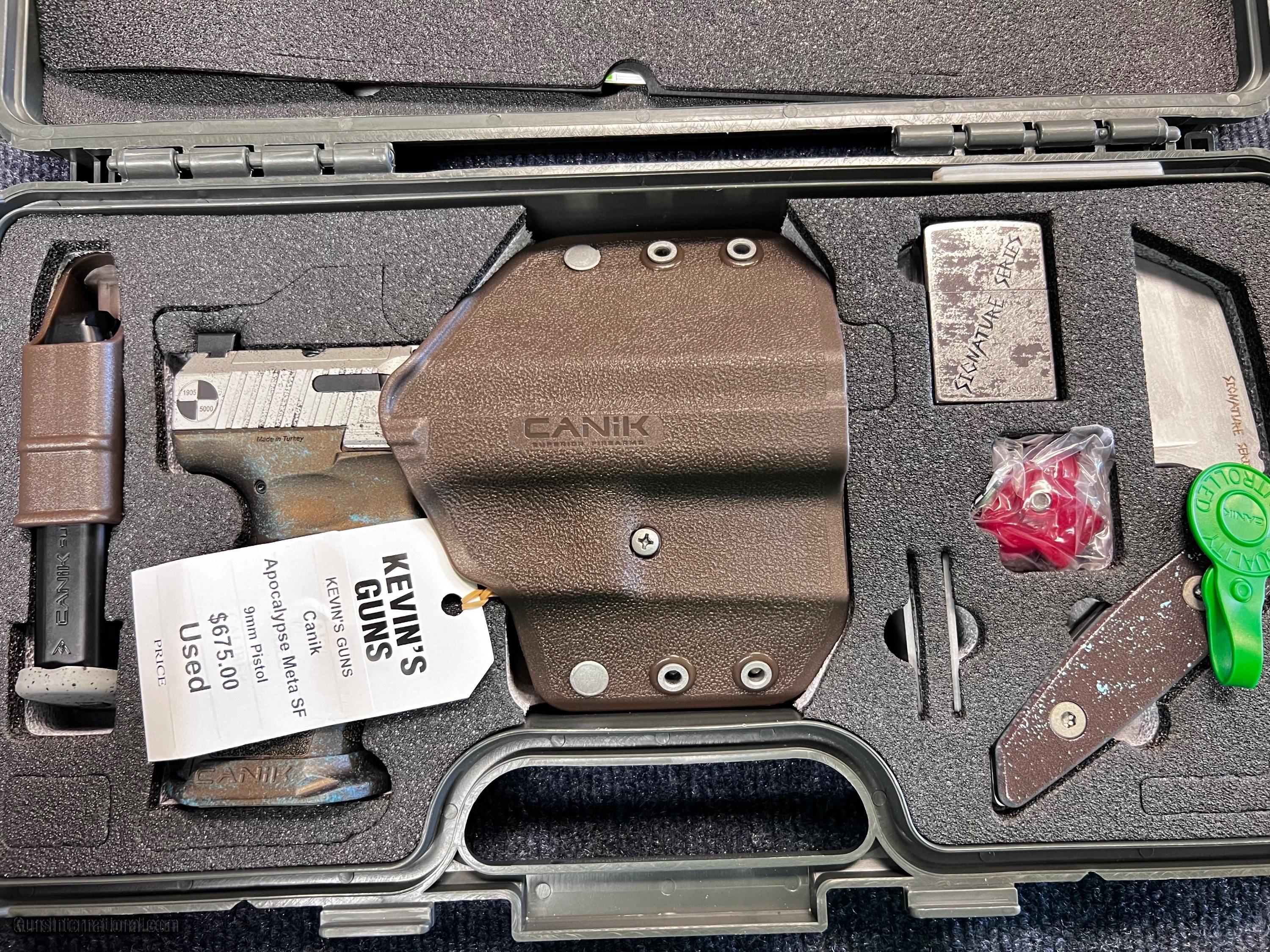Description: Gun looks new in its factory case with tool, lighter knife holster etc SOLD |