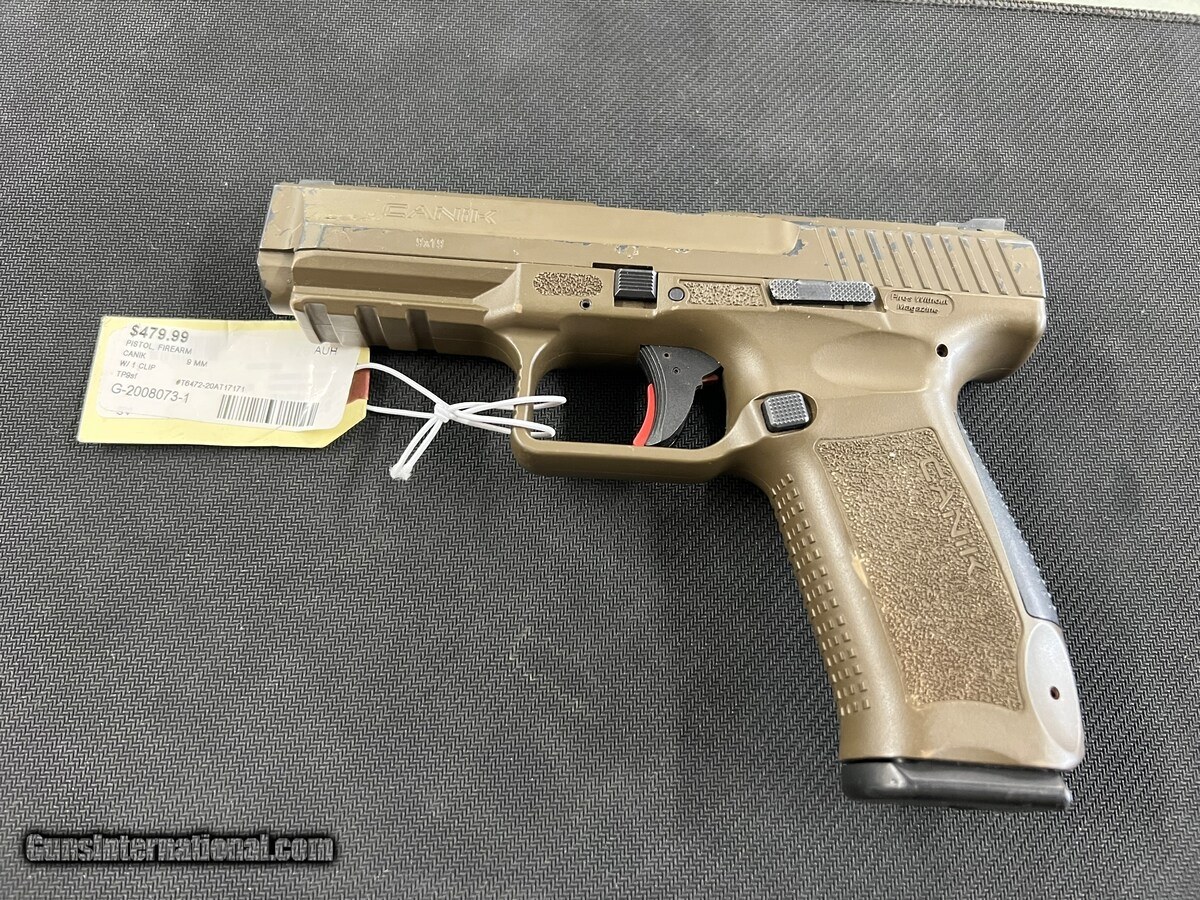 Description: Guns Listing ID: 745791 GREAT GUN HAVE SOME SCRATCHES BUT WORK PERFECTLY FINE PLEASE LOOK AT PICTURES. \" ALL FIREARMS ARE INSPECTED BY A CERTIFIED GUNS-SMITH & NRA INSTRUCTOR \ SOLD Manufacturer: CANIK Model: CANIK TP9SF Caliber Info: 9MM LUGER (9X19 PARA) Condition: Used - Non-Certified Barrels: 7 BARREL Finish: SANDSTORM CAMO |