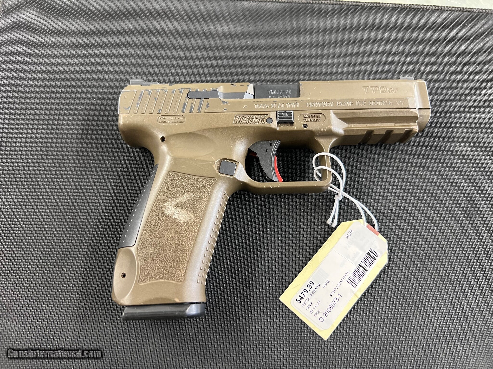 Description: Guns Listing ID: 745791 GREAT GUN HAVE SOME SCRATCHES BUT WORK PERFECTLY FINE PLEASE LOOK AT PICTURES. \" ALL FIREARMS ARE INSPECTED BY A CERTIFIED GUNS-SMITH & NRA INSTRUCTOR \ SOLD Manufacturer: CANIK Model: CANIK TP9SF Caliber Info: 9MM LUGER (9X19 PARA) Condition: Used - Non-Certified Barrels: 7 BARREL Finish: SANDSTORM CAMO |