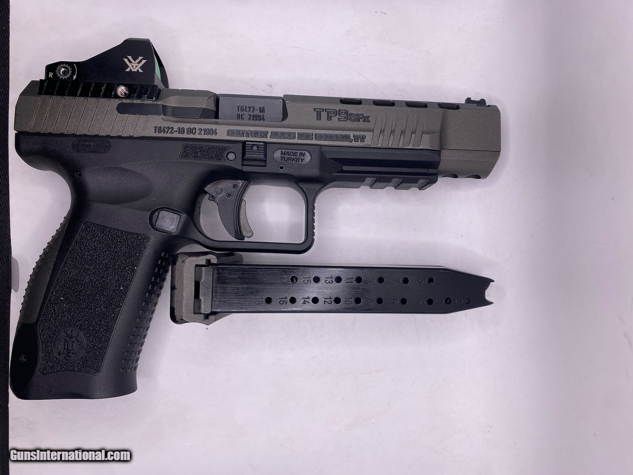 Description: Guns Listing ID: 1127556 Comes with one magazine and Vortex Viper optic . Please look at all photos to determine condition . The TP9 SFx was developed to serve as the premium version of TP Series of Pistols with its 5.20-inch barrel. The SFx comes with many new modular features for the shooter to enjoy, mostly for target shooting. This model enhances the shooter’s control on the pistol through front serrations and an extended slide; while improving its sight picture with a fiber-optic front sight and a blacked-out rear sight. The tolerances are tightened and the trigger, which has an integrated safety, comes with a shortened pull distance to allow increased firing rates. ((y)) SOLD Manufacturer: CANIK Model: CANIK TP9SFX Caliber Info: 9MM LUGER (9X19 PARA) Condition: Used - Non-Certified Barrels: 5 BARREL Finish: BLACK |