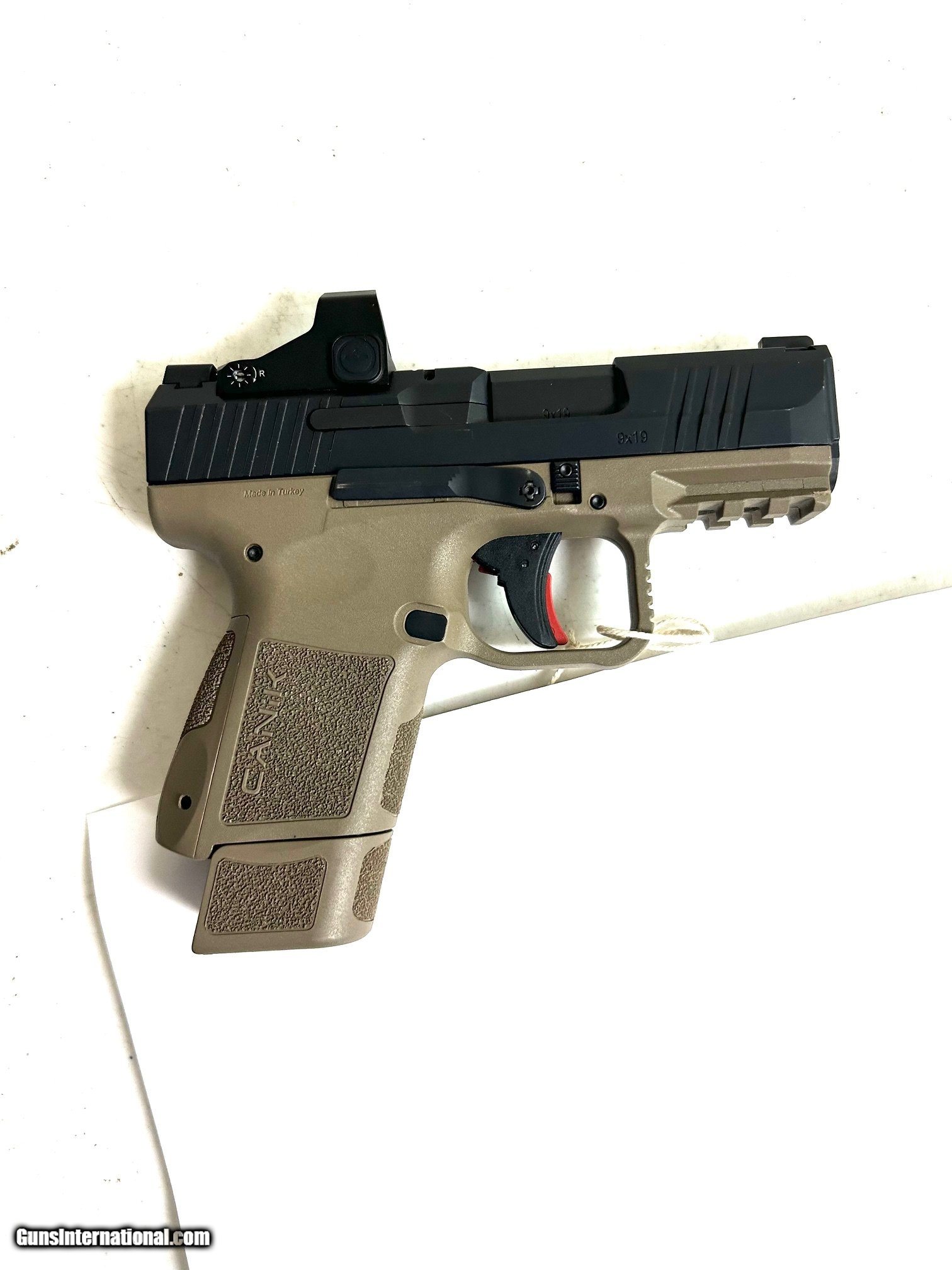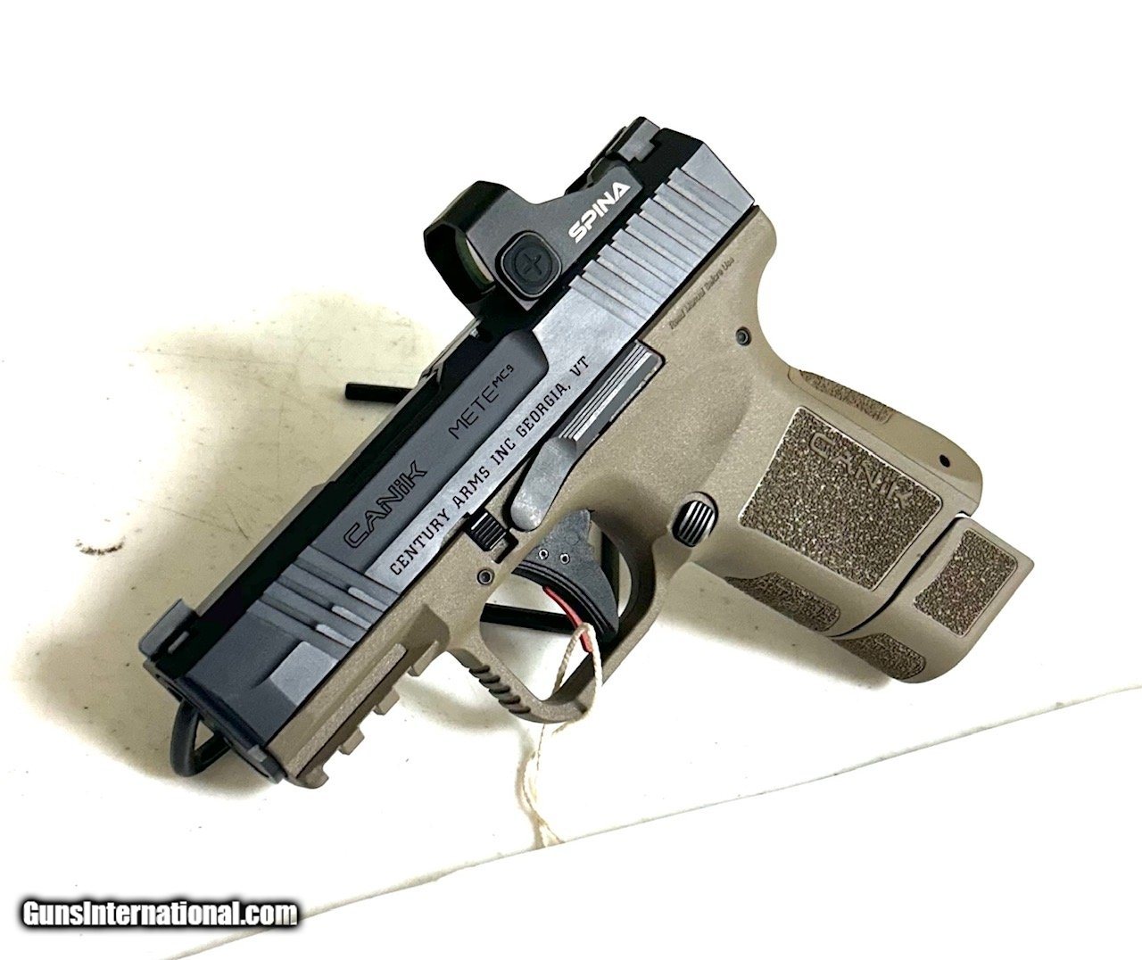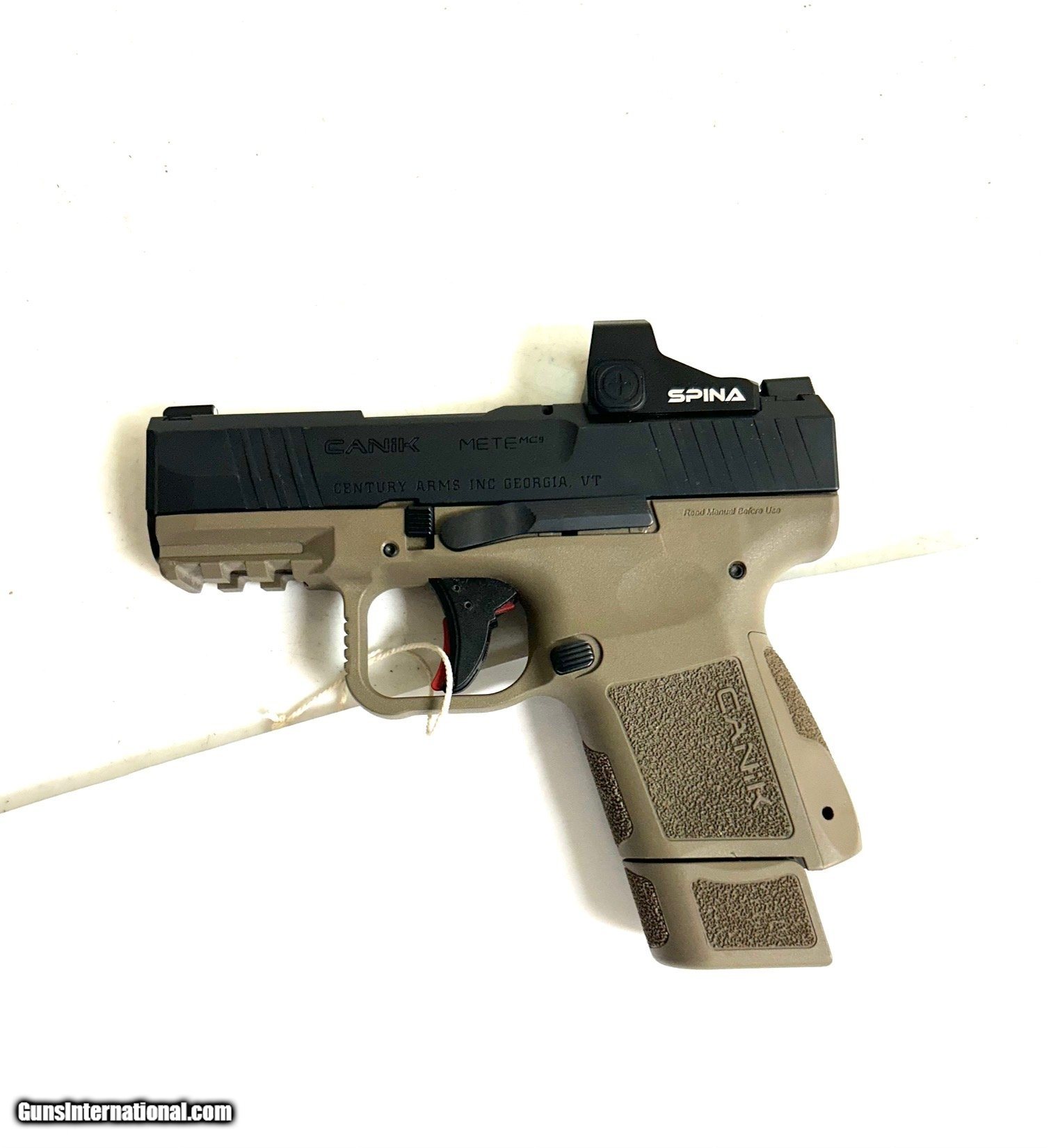 Description: Guns Listing ID: 529843 CANIK METE MC9 - 9MM LUGER WITH SPINA RED DOT The Canik METE MC9 is a compact, striker-fired 9mm pistol designed for concealed carry and personal defense. Chambered in 9mm Luger, it features a 3.2-inch barrel and a durable polymer frame engineered for ergonomic control. The optic-ready slide is cut to accept the Spina red dot sight or other compatible mini red dots without requiring adapter plates. For optics with alternate footprints, a custom mount plate from Galloway Precision is available to expand compatibility. The METE MC9 boasts a crisp trigger, low bore axis to reduce muzzle flip, and an aggressive grip texture with interchangeable panels that ensure a secure hold. Its 12+1 capacity and accessory rail enhance its practicality for everyday carry and tactical applications. • Compact striker-fired 9mm pistol • 3.2-inch barrel with durable matte finish • Optic-ready slide with RMSc footprint (adapter plate available) • Polymer frame with interchangeable grip panels • 12+1 magazine capacity • Accessory rail for lights or lasers • Weight: Approx. 22 ounces Specifications: Action: Striker-fired Caliber: 9mm Luger Barrel Length: 3.2 inches Capacity: 12 + 1 rounds Frame: Polymer Optic Mount: RMSc footprint direct mount (adapter plate available) Finish: Durable matte finish Weight: Approximately 22 ounces SOLD Manufacturer: CANIK Model: METE MC9 Caliber Info: 9MM LUGER (9x19 PARA) Condition: Used - Non-Certified Barrels: 3.18 Action: SEMI AUTOMATIC Finish: black and tan |