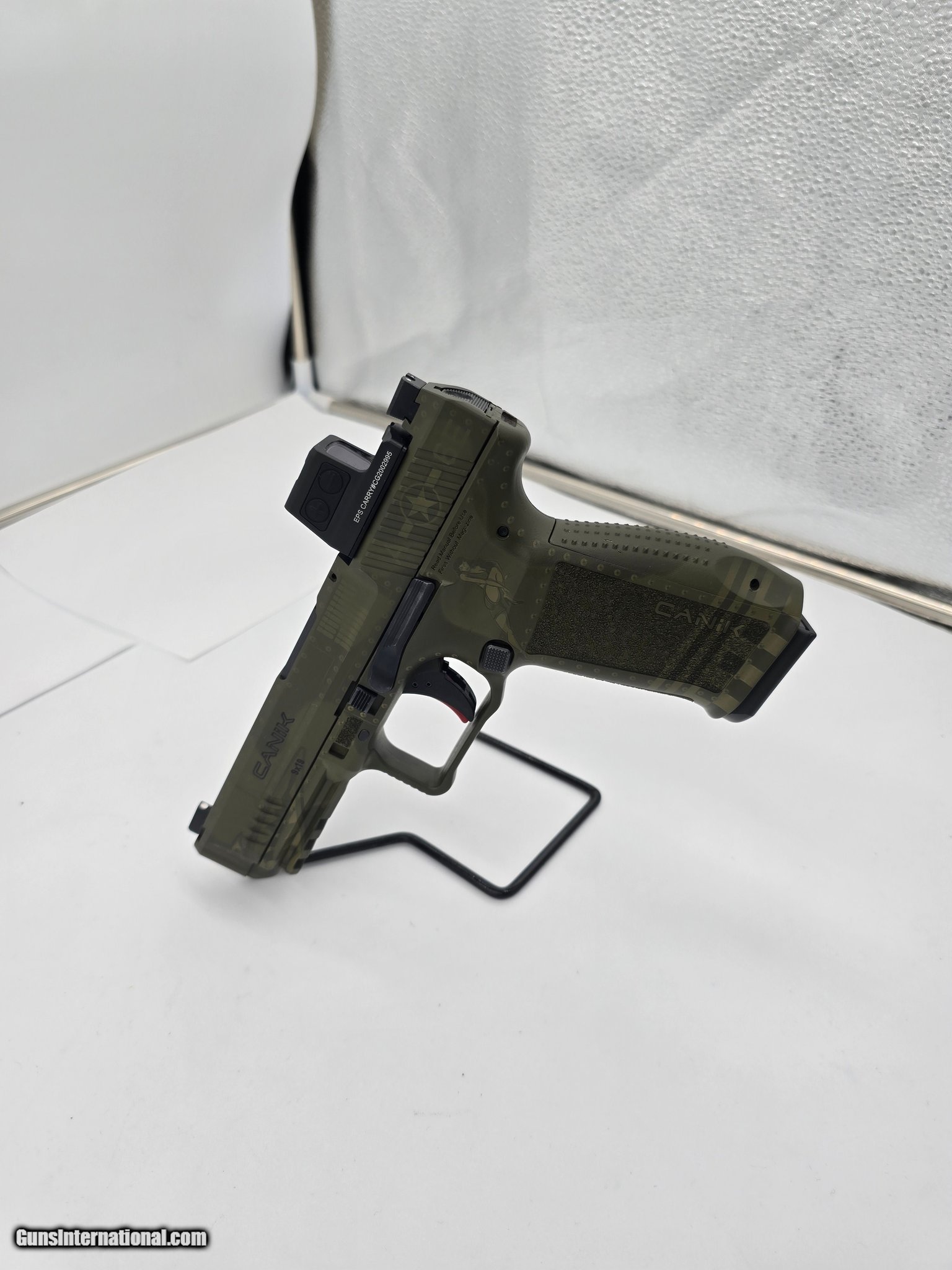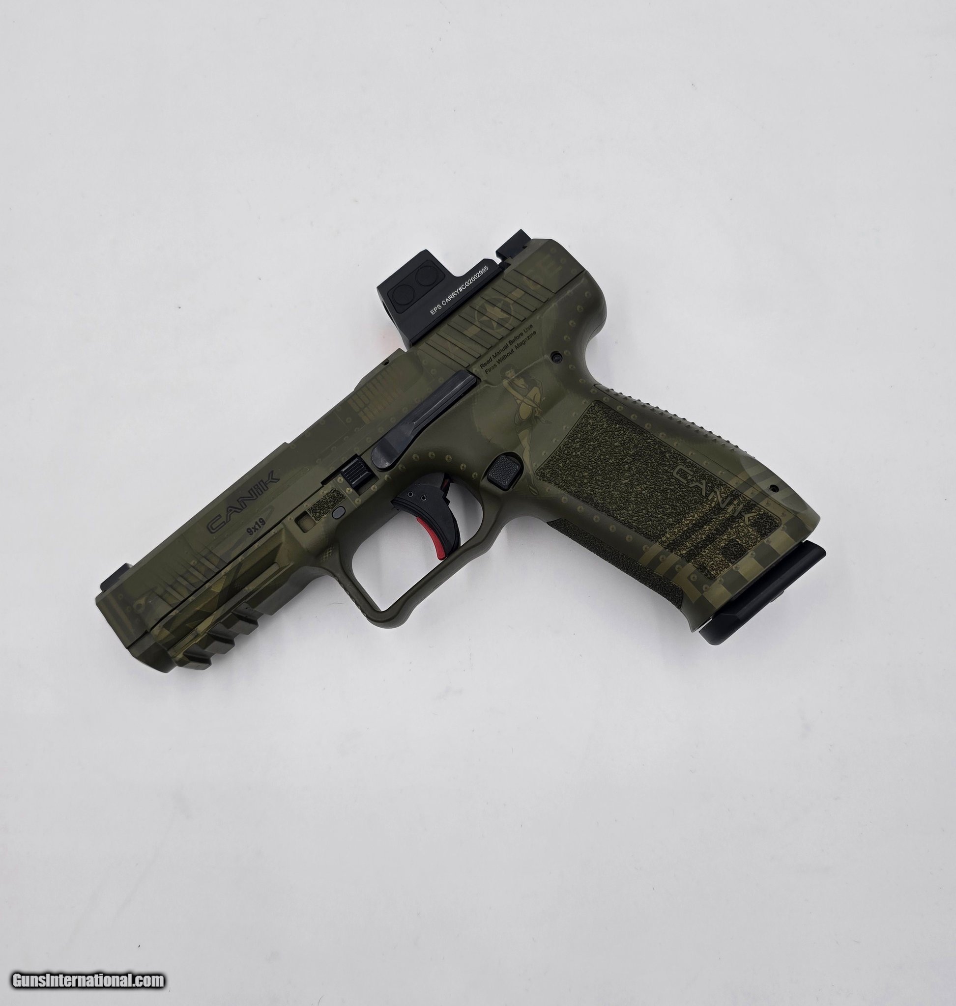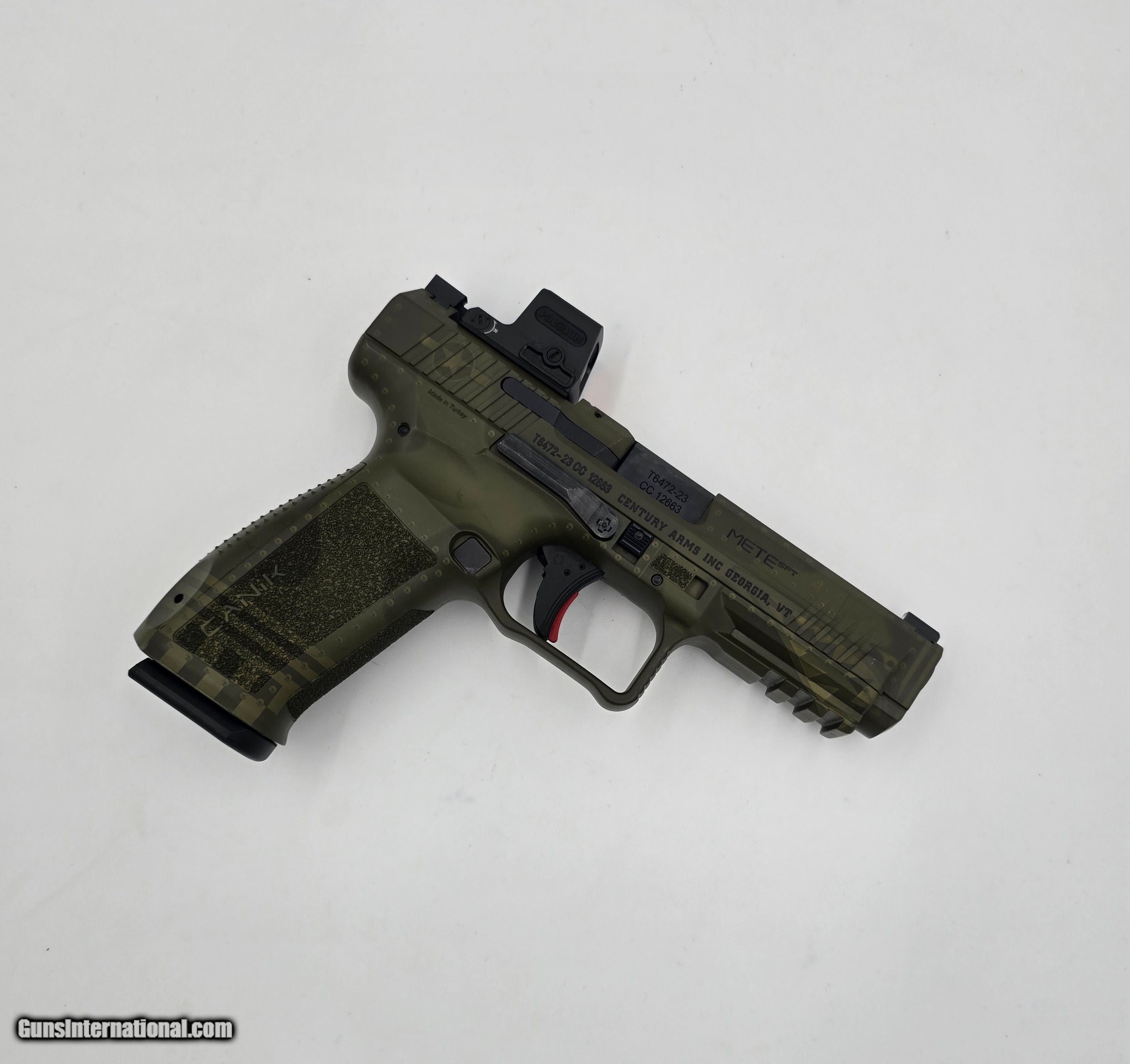 Description: Guns Listing ID: 1299824 Introducing the Canik Mete SFT in Green Bomber. This pistol has many features including an integrally flared mag-well for faster reloads, aggressive grip texturing for increased stability, double undercut trigger guard for securing the support hand on the firearm, and low profile slide stop lever. Mounted to the slide is the Holosun EPS Carry green dot optic. Comes with optic and (1) 18 round magazine. SOLD Manufacturer: CANIK Model: METE SFT Caliber Info: 9MM LUGER (9X19 PARA) Condition: Used - Non-Certified Barrels: 4.46 BARREL Finish: GREEN BOMBER |
