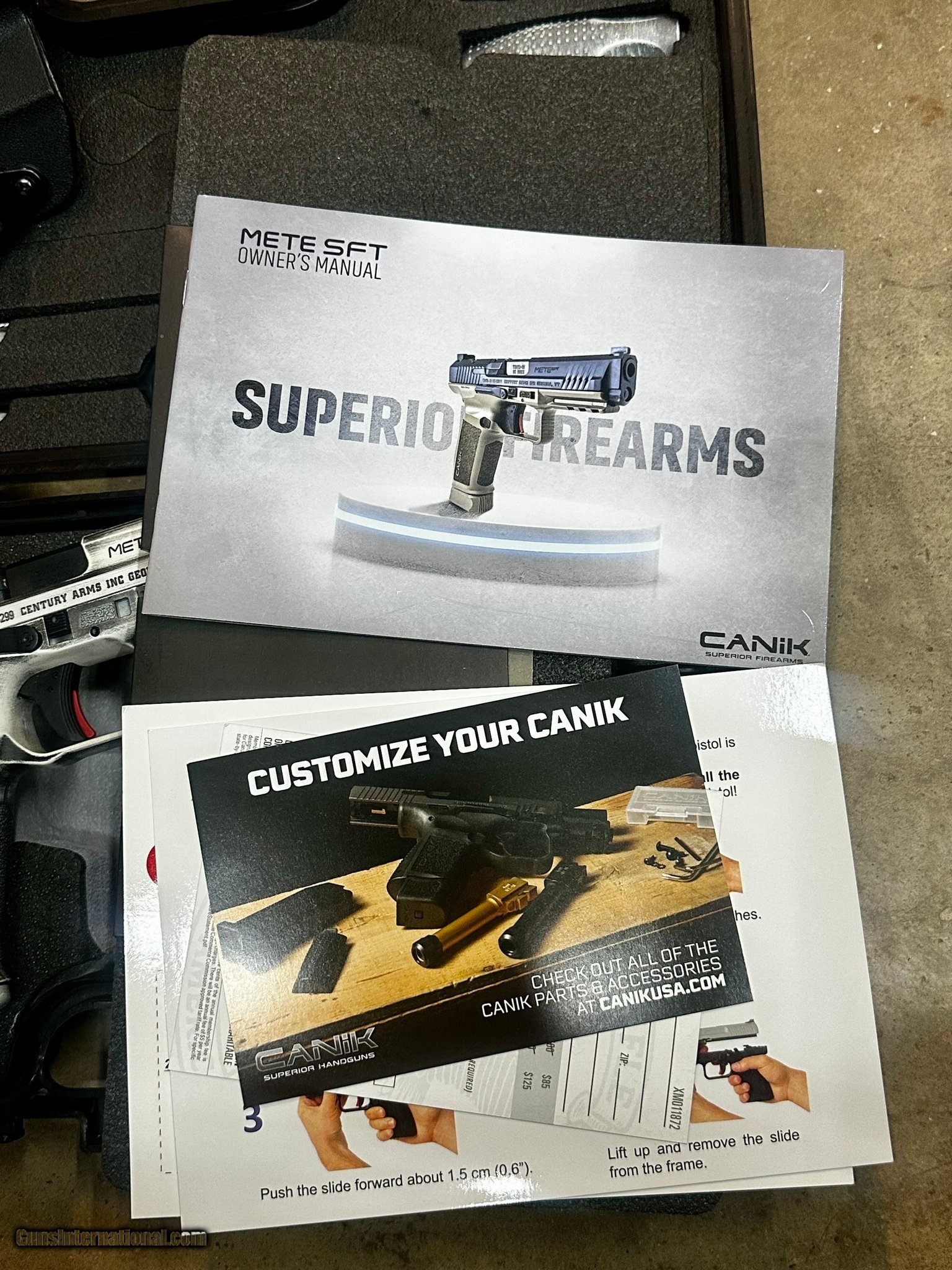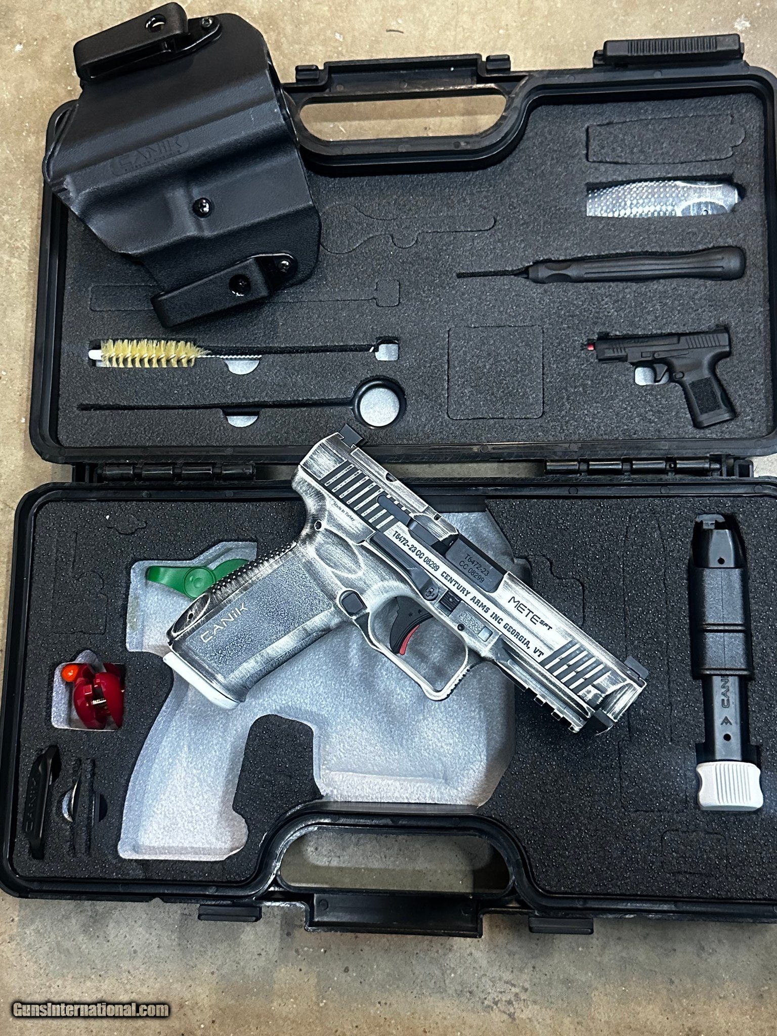 Description: Guns Listing ID: 487766 CANIK, METE SFT, Semi-automatic, Striker Fired, Polymer Framed Pistol, Compact, 9MM, 4.5\" Barrel, Cerakote Finish, Artic Distressed, Optic Ready Slide, (1) RMRcc and (1) Shield RMS/RMSc Footprint Optic Bases, 3 Dot White Sights, Flared Magwell, 2 Magazines, (1)-18 Round and (1)-20 Round, Includes Revesible IWB/OWB Holster, E-Z Magazine Loader, Interchangable Backstraps, Canik Punch and Tool Kit, Cleaning Kit and Hard Case. Optics Ready Slide Intergraded Flared Mag-Well Undercut Trigger Guard Full Accessory Kit SOLD Manufacturer: CANIK Model: METE SFT Caliber Info: 9MM LUGER (9X19 PARA) Condition: Used - Non-Certified Barrels: 4.46 BARREL Action: STRIKER Finish: ARCTIC DISTRESSED Weight: 1.74 lbs. |