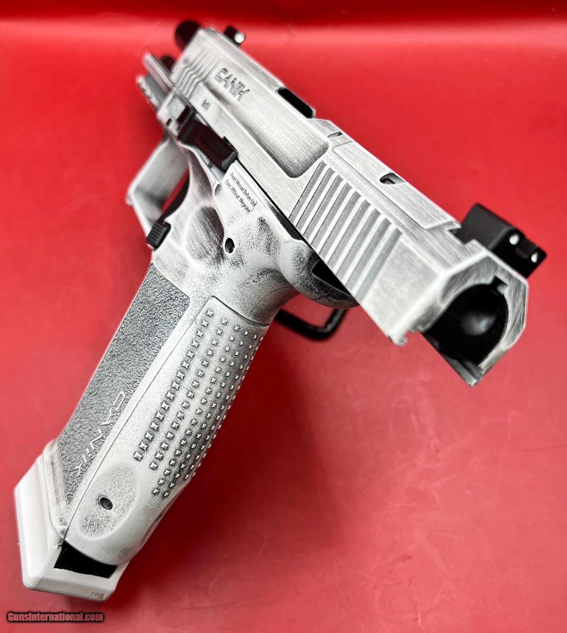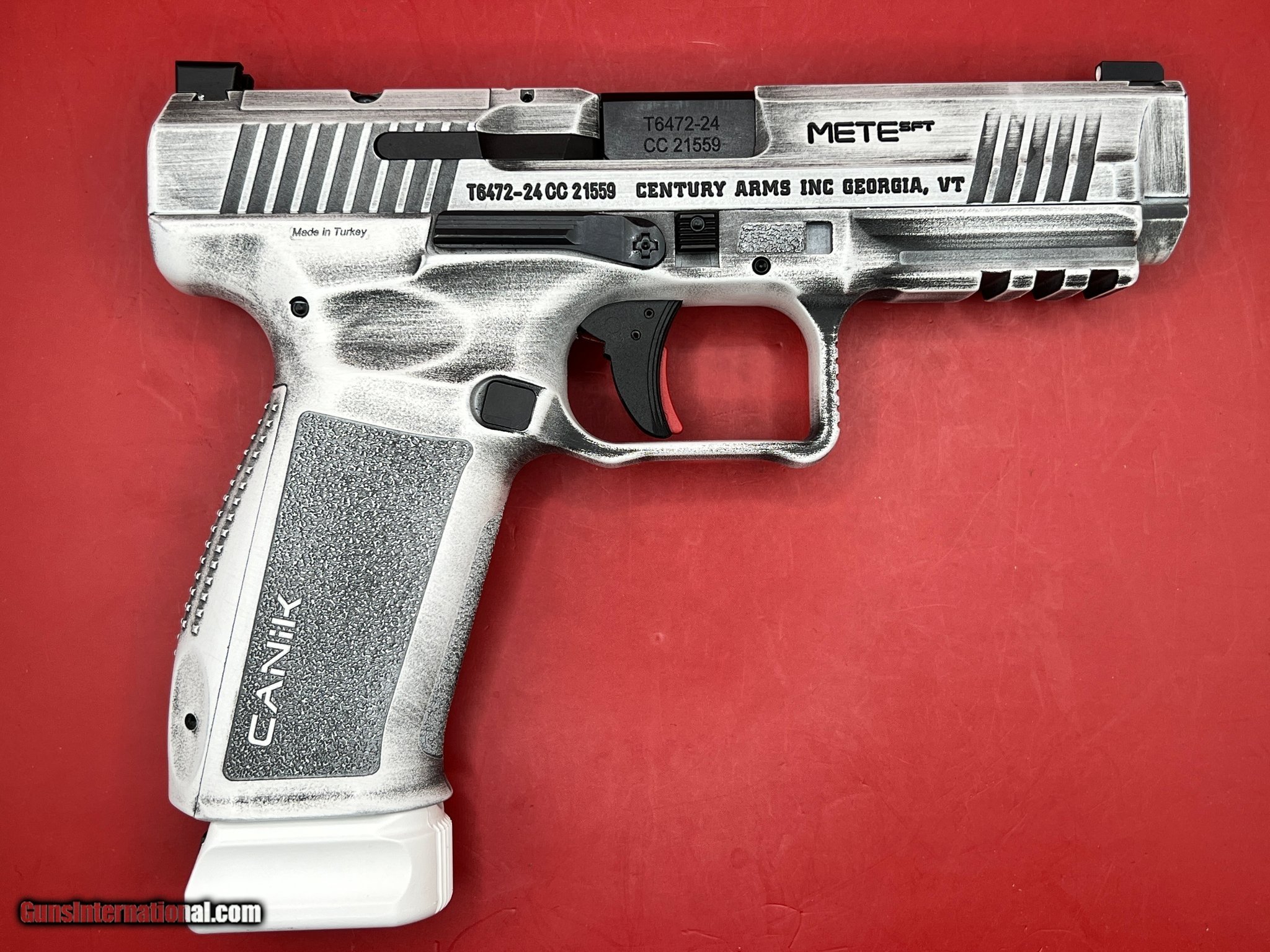 Description: Guns Listing ID: 546462 ****IF YOU HAVE QUESTIONS ON CONDITION OF THE FIREARM LISTED, ASK THEM BEFORE YOU BUY. IF YOU WOULD LIKE ADDITIONAL PHOTOS, ASK FOR THEM BEFORE YOU BUY. DO NOT PURCHASE UNLESS YOU ARE COMPLETELY SATISFIED THAT ALL YOUR QUESTIONS HAVE BEEN ANSWERED AND YOU KNOW EXACTLY WHAT YOU ARE BUYING.**** The Mete name pays homage to a legendary Turkish general who is considered by many to be one of the fiercest warriors of all time. The Mete features an integrally flared magwell; aggressive texturing to include the front of the grip; double undercut trigger guard secures the support hand on the firearm; the low profile slide stop lever; angled rear sight edge increase functionality in a multitude of situations; co-witnessing optics ready slide cut and a holster fit-and-lock (HFL) system for retention in the holster. Includes a hard case, two mags, speed loader, IWB/OWB holster, extra backstrap, tool kit and punch, cleaning kits, two optic plates and gun lock. Caliber 9mm Luger Barrel Length Range 4\" to 4.99\" Capacity 18+1 Action SAO Frame Finish Arctic Distressed Cerakote OAL 7.56\" Frame Material Polymer Hand Ambidextrous Sight Style Contrast Slide Finish Arctic Distressed Cerakote Slide Material Steel Slide Description Optic Ready / Serrated Barrel Finish Black Barrel Material Steel Frame Size Full Size Grips Aggressive Texture Interchangeable Backstrap Sight Configuration 3-Dot Description Sports South Exclusive Height 5.72\" Includes 2 Magazines / Back Strap / Case / Cleaning Kit / IWB / Gun Lock / OWB Holster / Mag E-Z Loader / Manual / 2 Optic Bases / Punch Toolkit / Speed Magwell Safety Loaded Chamber Indicator Width 1.41\" Barrel Description Match Grade Barrel Length 4.46\" Max Capacity 18 Weight 1.74 lbs Frame Description Polymer Frame w / Beavertail & Picatinny Rail SOLD Manufacturer: CANIK Model: METE SFT Caliber Info: 9MM LUGER (9x19 PARA) Condition: Used - Non-Certified Barrels: 4.46 BARREL Action: SEMI AUTOMATIC Finish: DISTRESSED WHITE |