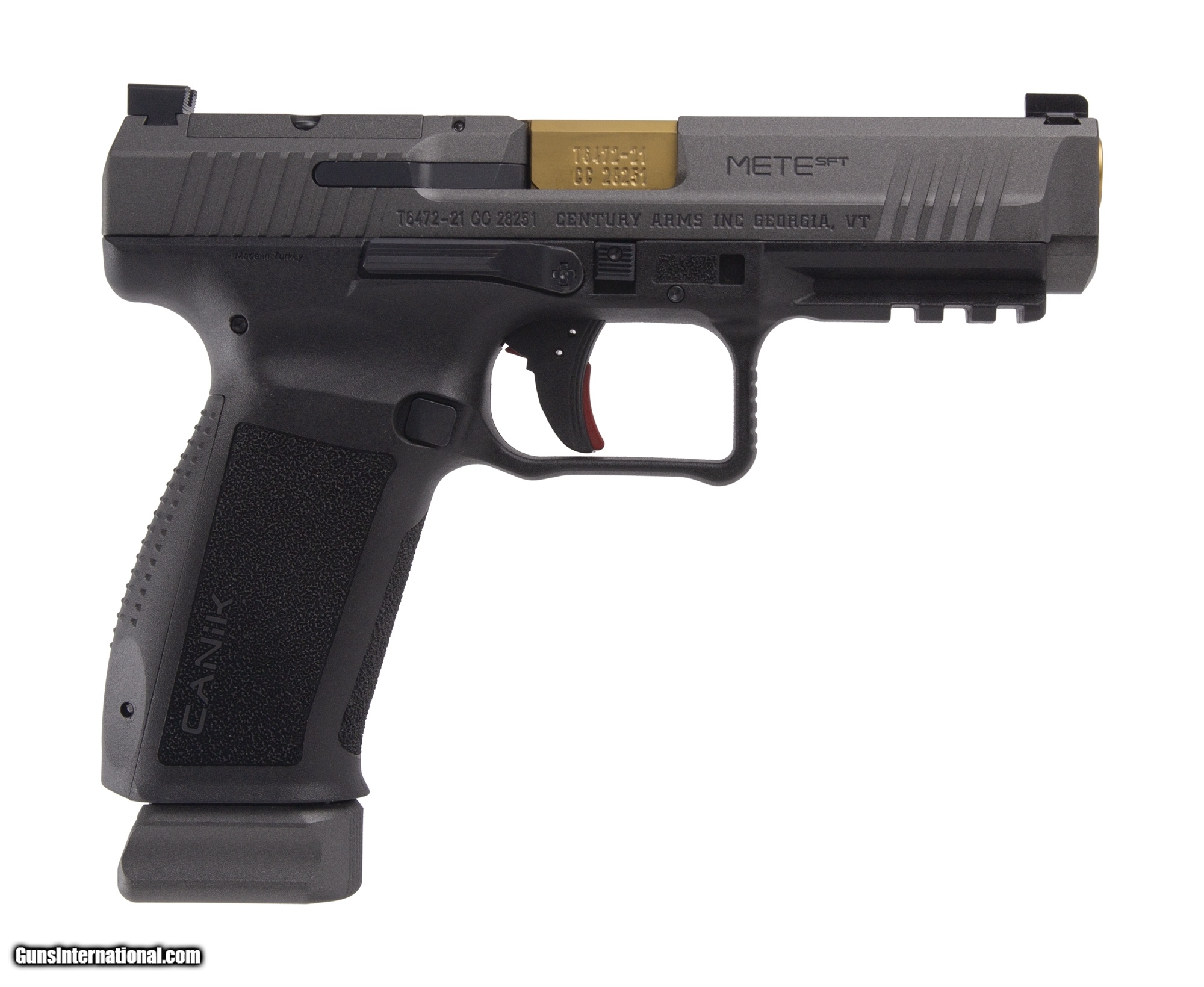 Description: Guns Listing ID: 1288669 This pistol has a 4.25in gold barrel with a tactical rail. It has an optic ready slide with an ambidextrous slide release. It comes with two 20rd magazines and a flared magazine well. Original box included. SOLD Manufacturer: CANIK Model: METE SFT OR Caliber Info: 9MM LUGER (9X19 PARA) Condition: Used - Non-Certified Barrels: 4.46 BARREL Finish: TUNGSTEN CERAKOTE |
