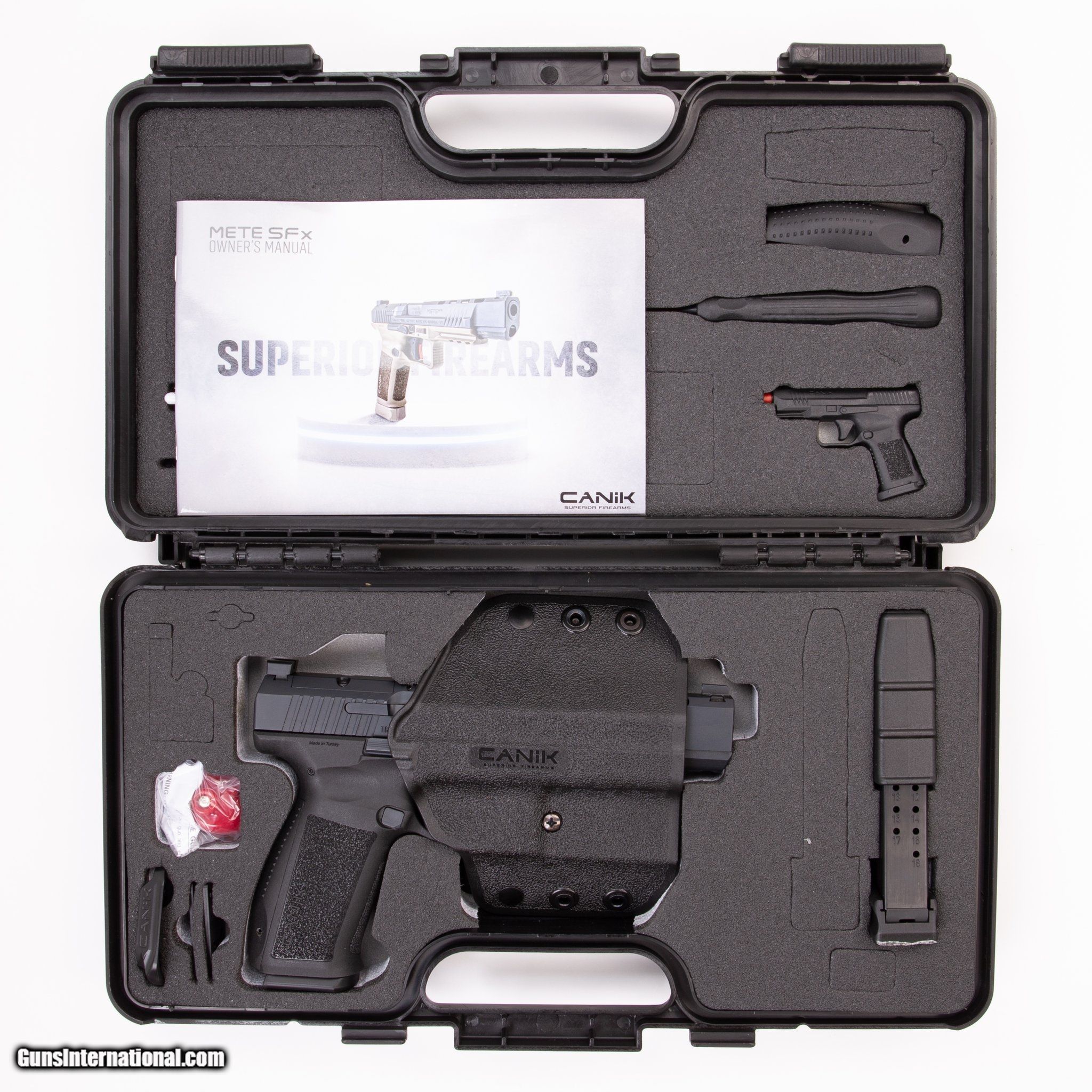 Description: Guns Listing ID: 400413 This Canik METE SFX includes the original case, manual, one 18-round magazine, one 20-round extended magazine (18+2), backstraps, loader, a right-handed OWB holster, Canik tool kit, and a flared magwell. It is optics-ready with an optic plate kit. Get the best bang for your buck when you get a Certified Used Firearm . When you see the Certified Used stamp on any of our firearms, you can be confident that you‚‚re getting exactly what you want – a gun only in very good to excellent condition and held to the highest quality standard. All Certified Used Guns come with a ‚‚no questions asked‚‚ return policy . PLUS, ALL CERTIFIED USED GUNS SHIP FR SOLD Manufacturer: CANIK Model: METE SFX Caliber Info: 9MM LUGER (9X19 PARA) Condition: Used - Certified Barrels: 5.2 BARREL Finish: BLACK Weight: 1.6 lbs. |