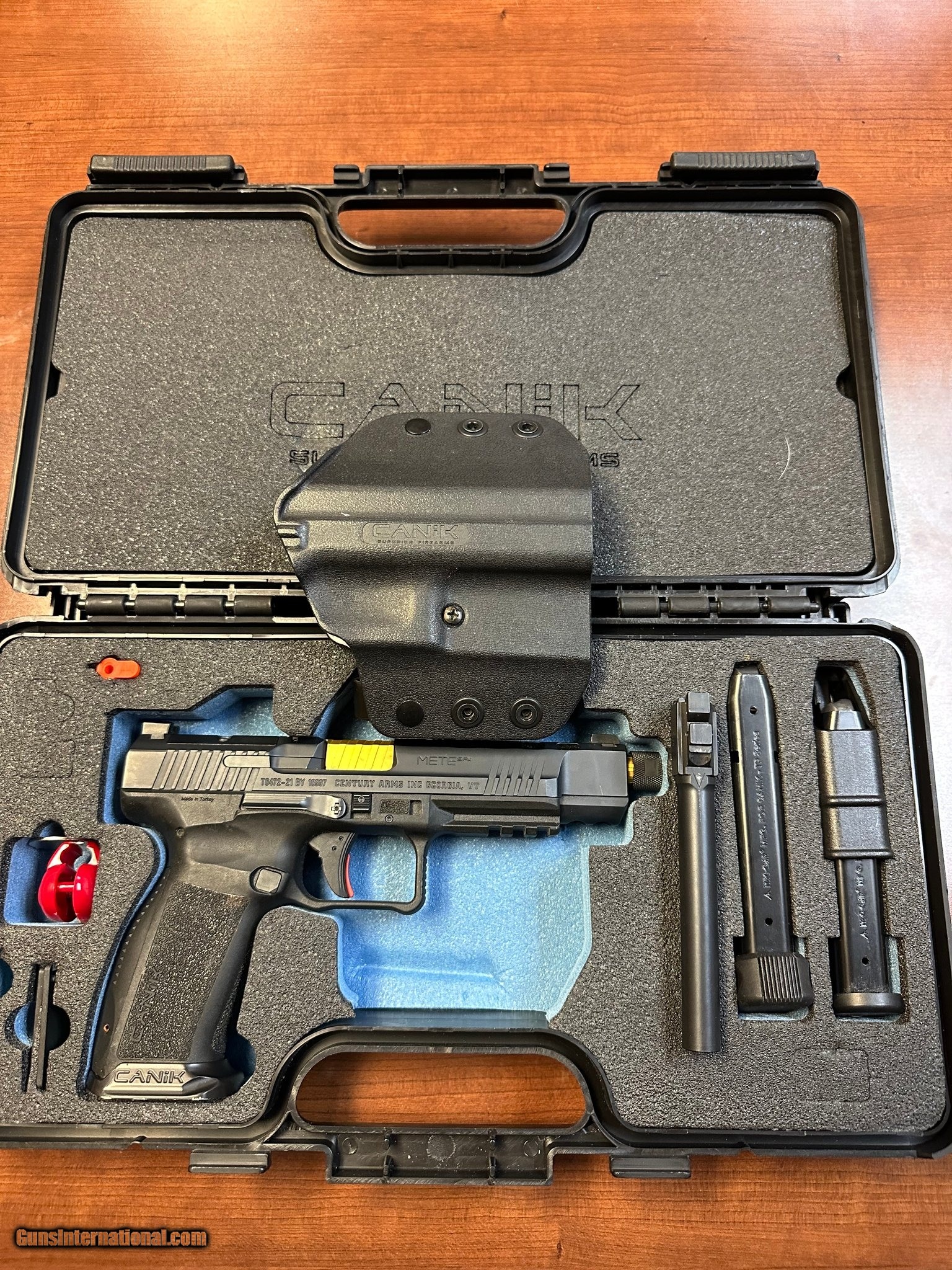 Description: Guns Listing ID: 467170 The Canik Mete SFX 9mm Luger Semiautomatic Pistol features a match-grade barrel equipped with an under-barrel Picatinny rail. The slide is low-profile and ambidextrous with a Cerakote and nitride finish and optics-ready Co-Witness base. The polymer frame features aggressive texturing and a flared mag well. Comes upgraded with Canik USA Full Size Gold PVD Threaded Fluted Barrel (stock barrel also included) Includes 2-18 RND magazines SOLD Manufacturer: CANIK Model: METE SFX Caliber Info: 9MM LUGER (9X19 PARA) Condition: Used - Non-Certified Barrels: 5.2 BARREL Action: STRIKER Finish: BLACK NITRIDE Weight: 1.9 lbs. |