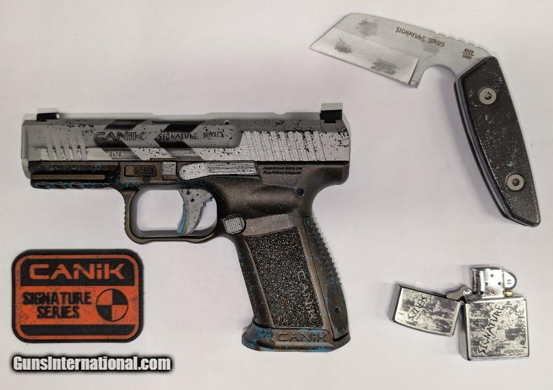 Description: Guns Listing ID: 569731 CANIK SIGNATURE SERIES METE SF APOCALYPSE THIS IS A NEW PISTOL THAT IS NOT YET IN GUNS SYSTEM APOCALYPSE FEATURES: • CANiK Collectors Certificate with Production Number • Signature Series logo and Production Number Stamped Slide • Optics-ready slide plates for Trijicon RMRcc and Shield RMS/RMSc • Collectors Series Cerakote® • 3-Dot White sights • Spare magazine • Backstrap (large) • CANiK IWB/OWB Apocalypse Holster • CANiK Tool Kit, Punch and Magazine Loader • CANiK Signature Series hard case • Limited Edition Patch • Owner‚s Manual The Apocalypse is upon us... This limited-edition METE SF aesthetically lives up to its name. The CANiK Signature Series continues with this uniquely Cerakoted and specially marked Apocalypse kit, featuring a numbers-matching METE SF 9mm handgun, Custom Angled Fixed Blade, and Limited Edition Zippo lighter. Also included is a matching Apocalypse hard case, CANiK METE SF holster, a spare matching 15-round magazine, two optic interfaces, magazine loader, cleaning kit, tool kit, spare backstrap for larger hands, Signature Series patch and complete owner‚s manual. In trying times, success will require tried and true tools. Make the CANiK METE SF Apocalypse collectable a part of your survival kit. Manufacturer: CANIK Model: SIGNATURE SERIES METE SF Caliber Info: 9MM LUGER (9x19 PARA) Condition: Used - Non-Certified Barrels: 4" BARREL Action: SEMI AUTOMATIC Finish: MULTI-COLORED Price: $899.99 Contact Seller |