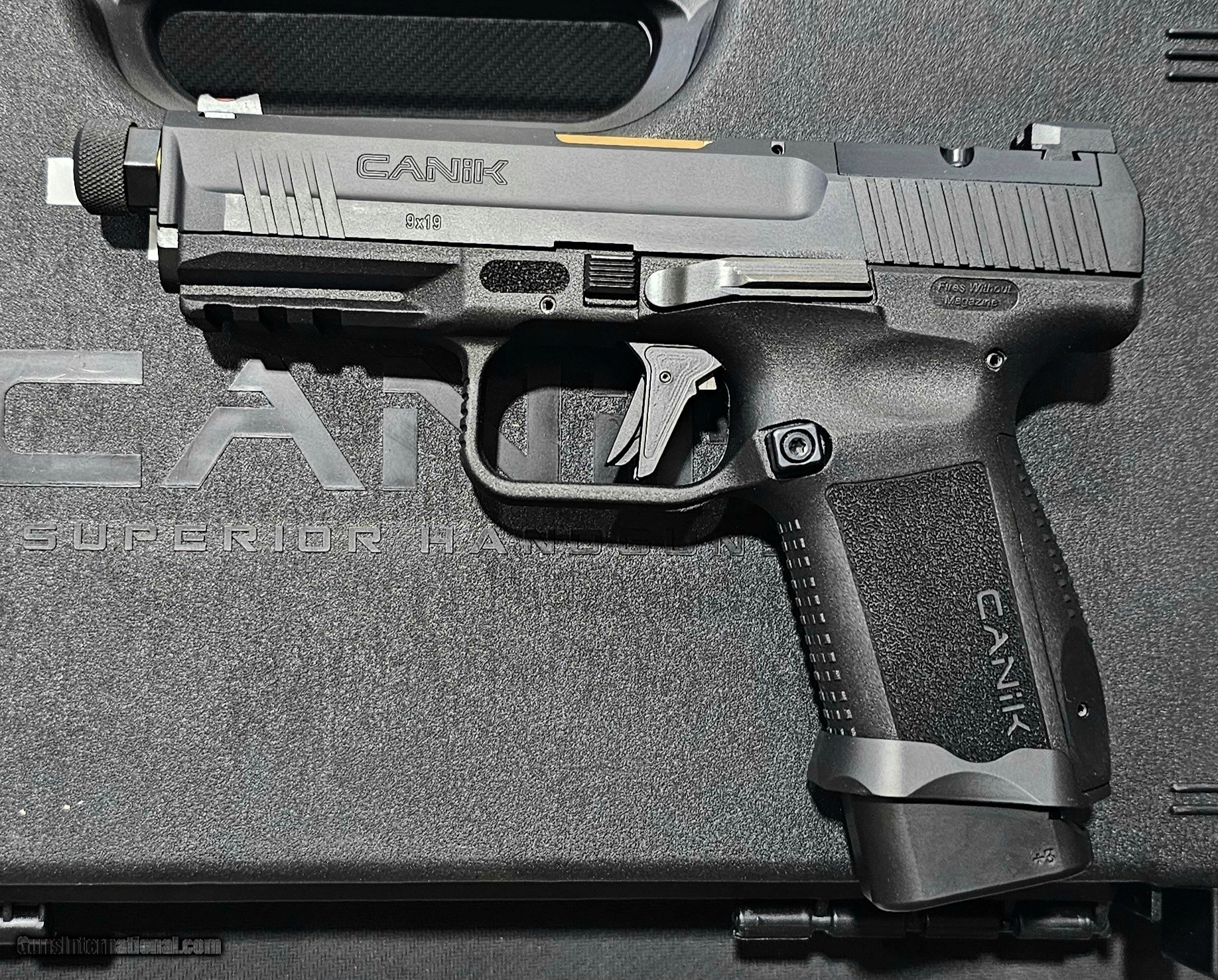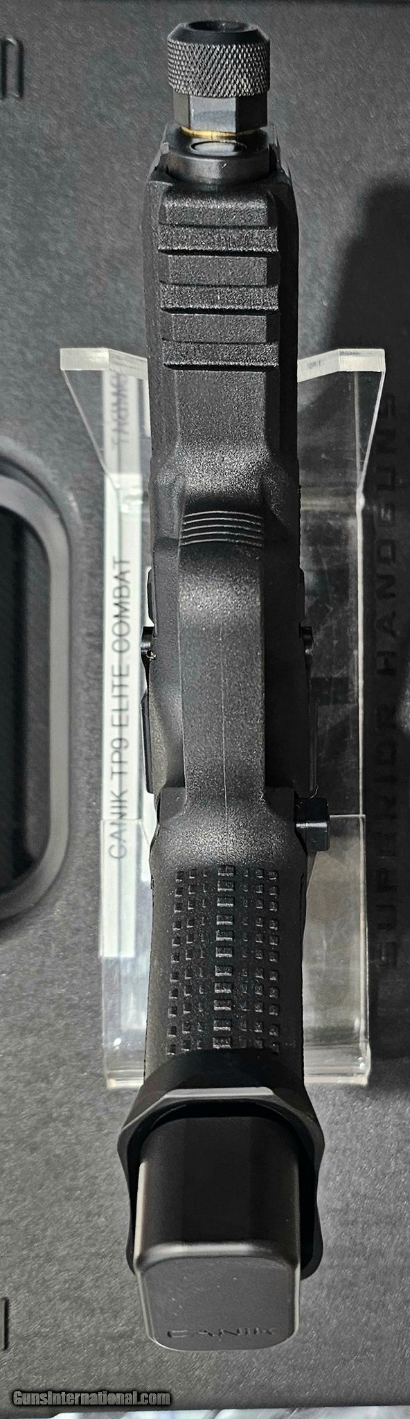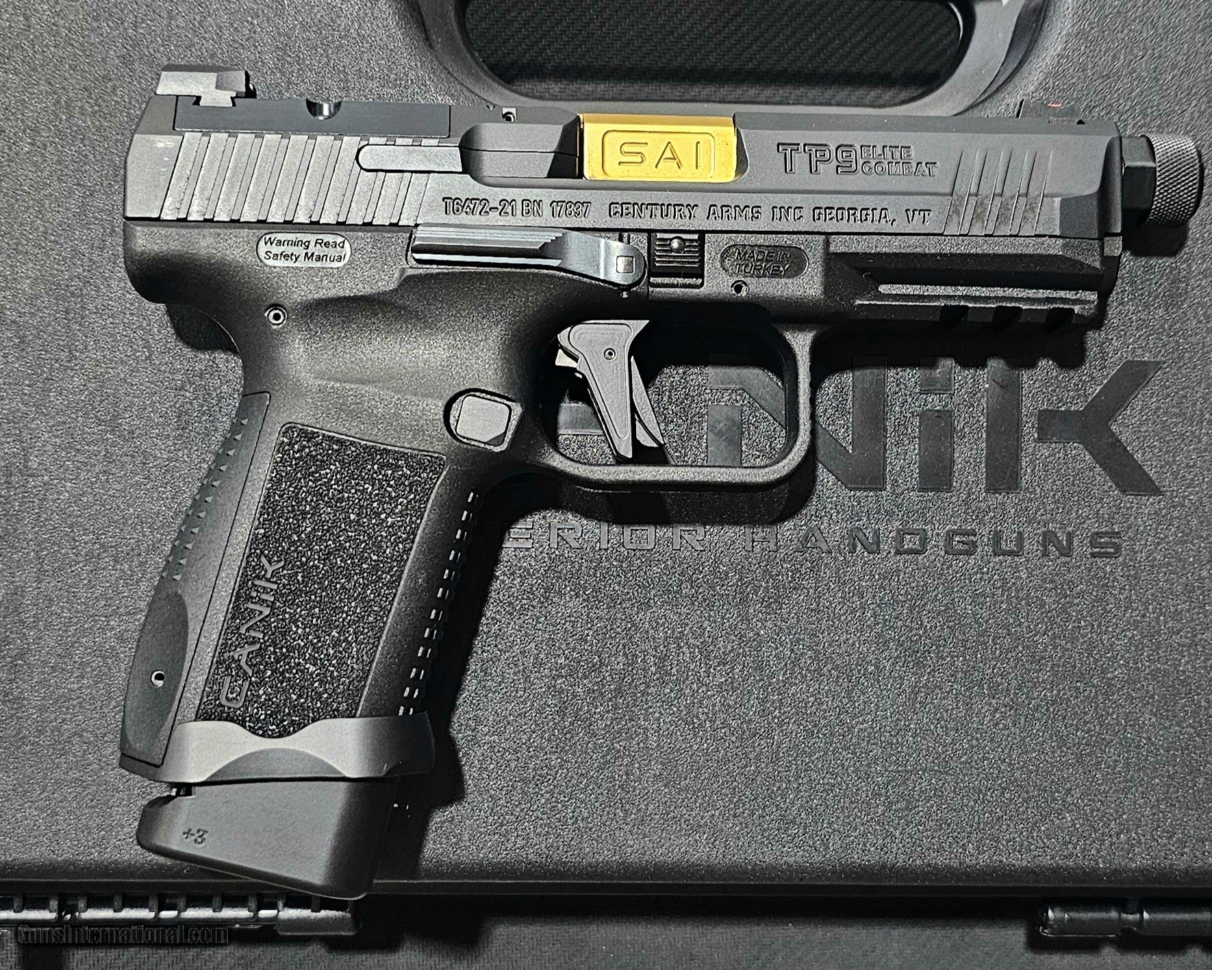 Description: Guns Listing ID: 526049 The TP9 Elite Combat Executive comes with custom features on the TP9 Combat designed by Salient Arms- gold matchgrade, fluted, threaded barrel; Proprietary Convex Thread Protector with 1/2\"-28 RH threads; aluminum speed funnel magazine well. Canik features an optics-ready slide, enhanced trigger, advanced coatings on all steel and internal parts; aluminum Plus 3 magazine extension; small parts and internal components nitride or high-wear nickel-coated; flat-face aluminum trigger with 4.8 lb trigger pull weight; slide, barrel and small steel parts nitride-coated and charging handle. Includes Retention holster w/Slide Lock Release, two magazines and optic plate. SOLD Manufacturer: CANIK Model: TP9 ELITE COMBAT EXECUTIVE Caliber Info: 9MM LUGER (9X19 PARA) Condition: Used - Non-Certified Barrels: 4.7 BARREL Action: SEMI AUTOMATIC Weight: 1.6 lbs. |