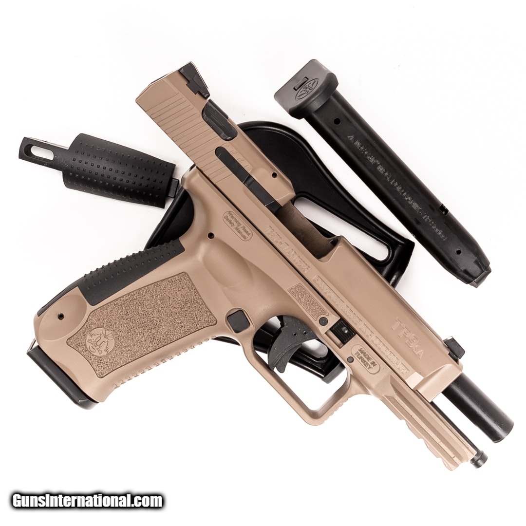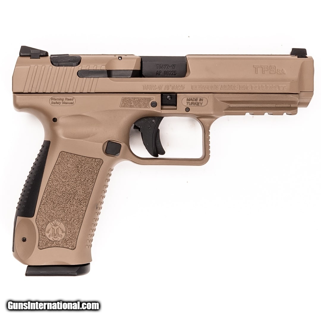 Description: Guns Listing ID: 335633 This Canik TP9SA is a semi-automatic handgun chambered in 9mm and made with an improved trigger. Rugged and reliable, this pistol sports a polymer frame and match-grade barrel. The textured polymer grips with lined front and back straps provide a secure grasp through every shot, while the integral rail in front of the trigger guard allows the user to attach their choice of accessories easily. Other features of the TP9SA include an ambidextrous decocker, loaded chamber indicator, and a reversible magazine catch. This TP9SA is in very good condition and has a decocker on the top of the slide. Two 18-round magazines and two sizes of backstraps are included. SOLD Manufacturer: CANIK Model: TP9SA Caliber Info: 9MM LUGER (9X19 PARA) Condition: Used - Certified Barrels: 4.5 BARREL Finish: FDE |