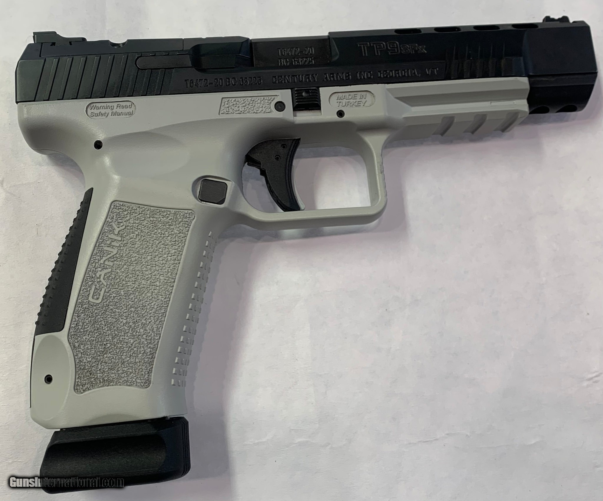 Description: Guns Listing ID: 925893 Canik TP9SFX , 9mm, 18 round magazine, two tone black/gray comes with box. It’s in very good condition no visible wear on slide. SOLD Manufacturer: CANIK Model: TP9SFx Caliber Info: 9MM LUGER (9X19 PARA) Condition: Used - Non-Certified Barrels: 4 BARREL Finish: BLACK AND GRAY |