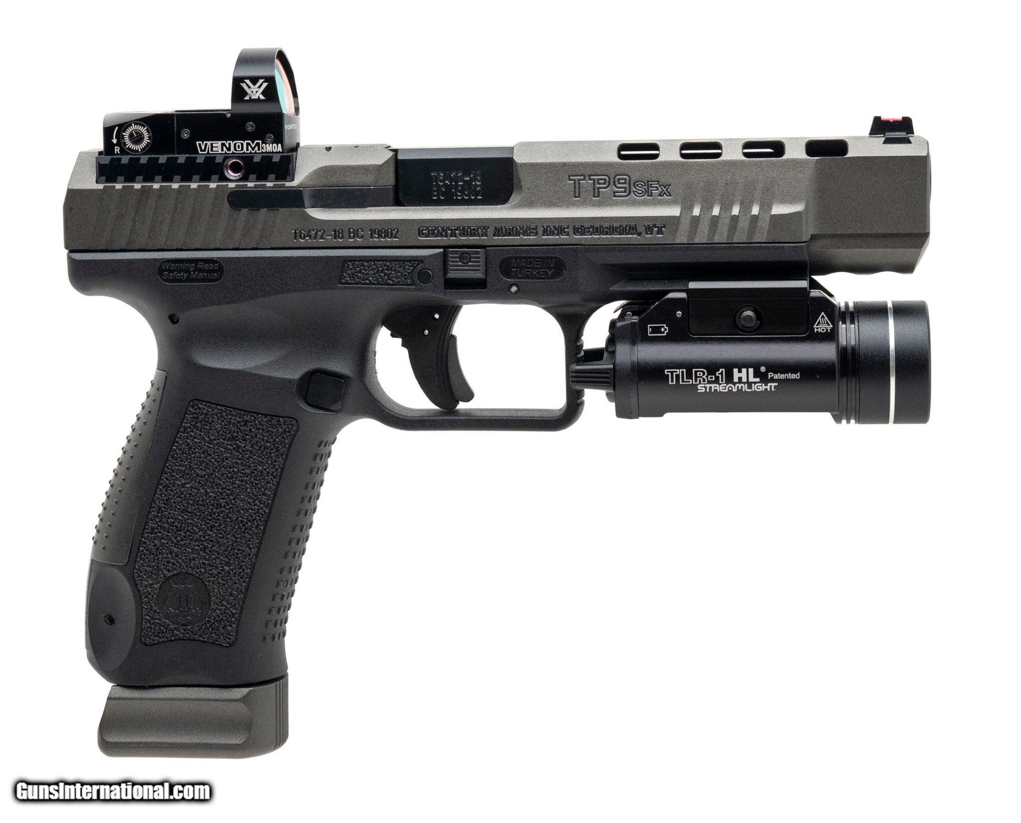 Description: Guns Listing ID: 545986 SN: 18BC19802. Modern production, 9mm with a 5.2\" barrel. Bore is excellent. Full-size striker fired pistol with Vortex Venom red dot sight, Streamlight TLR-1 HL light module, optic ready/lightening cut slide, tungsten grey cerakote finish, black polymer frame. Includes 1 additional 18rd magazine, 3 additional optic adapter plates, 1 additional backstrap, original iron sight plate, magazine speed loader, and original carry case. Overall condition is excellent. (PR74203) SOLD Manufacturer: CANIK Model: TP9SFx Caliber Info: 9MM LUGER (9x19 PARA) Condition: Used - Non-Certified Barrels: 5.2" BARREL Action: SEMI AUTOMATIC Finish: cerakote grey |