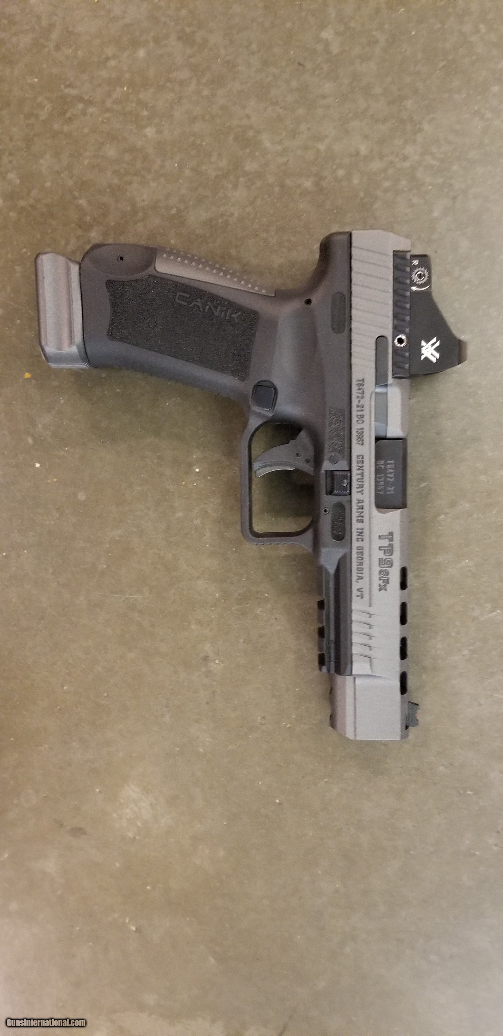 Description: Guns Listing ID: 550956 Canik TP9SFX in nearly new condition (USED) comes with 2 Canik holsters, Vortex Viper, all optic mounting plates and all other factory equipment. Includes: NEW Patented Retention Holster NEW Barrel and slide have an ultra-durable Tungsten-Grey Cerakote®-over-Nitride on the colored models Short reset Single-Action trigger design with nickel-coated action components Optics-ready slide with four adapter plates that accept the markets most popular reflex sights, plus an ambidextrous charging handle Warren Tactical sights with red and green fiber optic front sight Weight-reducing front and rear slide serrations for positive-traction handling Accessory under-barrel rail Extended slide release for easier engagement during competition Loaded chamber indicator Side reversible magazine catch with additional sizes of release buttons and alternate backstraps for a custom fit Two magazines, magazine loader, and cleaning kit Available with 20-round or 10-round magazines and a Vortex reflex sight WEIGHT 1.83 lbs CAPACITY 20+1 rounds FRONT SIGHT Fiber Optic CARTRIDGE 9mm Luger MAGAZINE TYPE Canik Full Size Magazine REAR SIGHT Blackout MAGAZINE INCLUDED 2 x 20-Round Magazine FINISH COLOR Tungsten Grey ACTION TYPE Semi-Automatic FRAME MATERIAL Synthetic OVERALL LENGTH 8.27\" BARREL LENGTH 5.2\" HEIGHT 6.2\" WIDTH 1.38\" MANUFACTURED Made in Turkey SOLD Manufacturer: CANIK Model: TP9SFx Caliber Info: 9 MM LUGER (9X19 PARA) Condition: Used - Non-Certified Barrels: 5.2 BARREL Finish: GREY & BLACK |