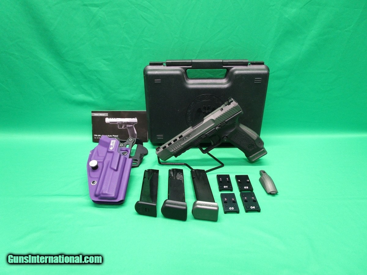 Description: Guns Listing ID: 913533 We have a used Canik TP9SFX semi-automatic for sale. This is chambered in 9mm with a 5\" barrel. It comes as shown in pictures with a holster, three 18 round magazines with plus 2 extensions plates, one 15 round magazine, mounting plates, manual, back strap, and factory case . This is in Very Good Used Condition. Overall we would grade at approx 98%. Check out the pictures and feel free to call or email with any questions. SOLD Manufacturer: CANIK Model: tp9sfx Caliber Info: 9MM LUGER (9X19 PARA) Condition: Used - Non-Certified Barrels: 5 BARREL Finish: TITANIUM GRAY CERAKOTE |