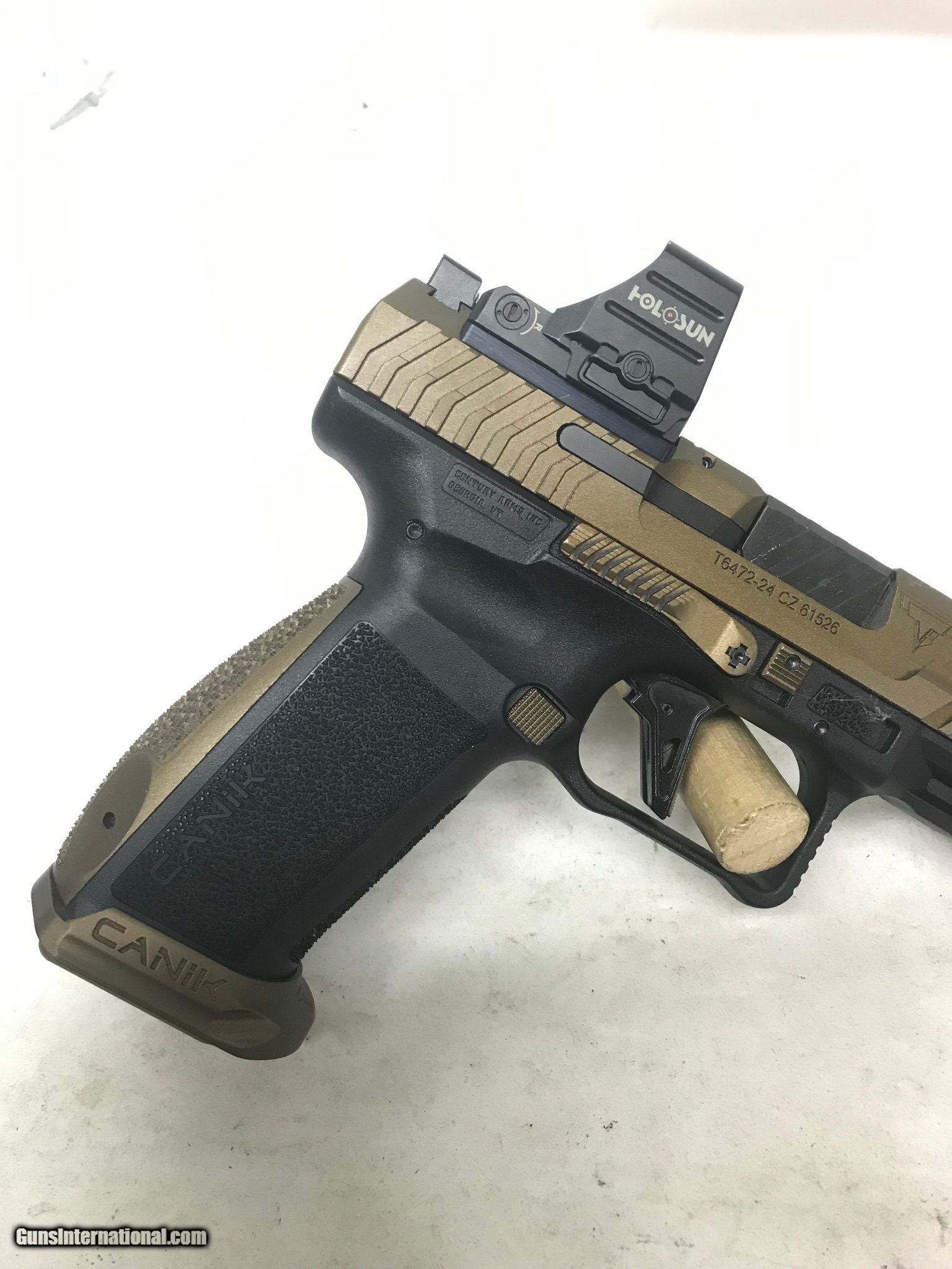 Description: Guns Listing ID: 524553 Up for sale is this beautiful tti combat canik with hardshell case and holosun sight Experience peak performance with the Canik TTI Combat 9MM 18RD Pistol Bundle. This feature-packed pistol boasts an aggressively textured frame for exceptional grip control, a competition-ready 5-inch ported barrel for enhanced accuracy, and the versatility of triple optic plate interfaces. The Canik TTI Combat arrives range-ready with a custom holster, cleaning kit, and more, making it an exceptional choice for competitive shooters and firearm enthusiasts alike. Features and Benefits Unmatched grip control comes from the aggressively textured frame, offering a secure hold in any situation Competition-ready accuracy is achieved with the 5-inch, ported and fluted steel barrel that minimizes muzzle rise and enhances every shot Ultimate customization is yours thanks to three optic plate interfaces, allowing you to mount your preferred red dot or reflex sight for faster target acquisition The match-grade trigger boasts a diamond cut, 90-degree aluminum design that delivers a crisp, clean break for improved shot consistency Includes a custom holster, cleaning kit, magazine loader, and a hard case for convenient transport and storage TTI - Taran Tactical Innovations by Taran Butler Specifications Handedness: Standard Action: Double Product Type: Pistol Manual Safety: No Optic Ready: Yes Activity: Shooting Optic Equipped: No Magazine capacity: 18 What‚‚s in the Box Canik TTI Combat 9MM 18RD Pistol Bundle Custom Holster Cleaning and Tool Kit Mag Loader Hard Case Commemorative Coin A.P SOLD Manufacturer: CANIK Model: TTI Combat Caliber Info: 9MM LUGER (9x19 PARA) Condition: Used - Non-Certified Barrels: 4.6 Action: SEMI AUTOMATIC Finish: black / mica bronze |